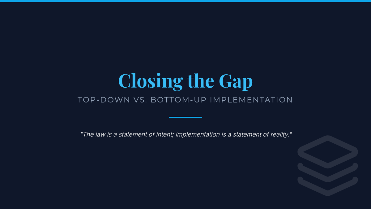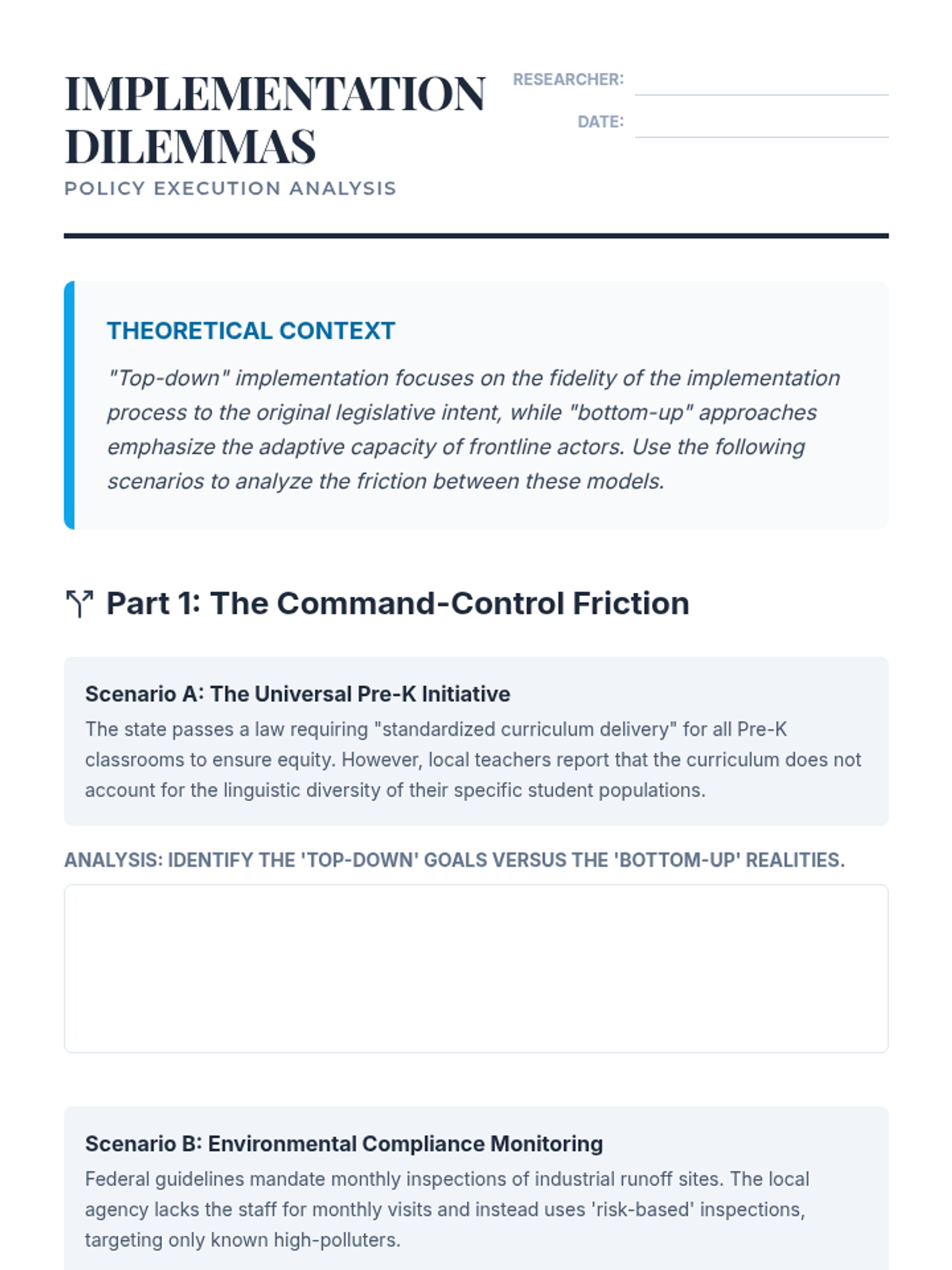 Students analyze the divide between top-down and bottom-up models of policy execution, exploring why command-and-control structures often fail in complex administrative environments.