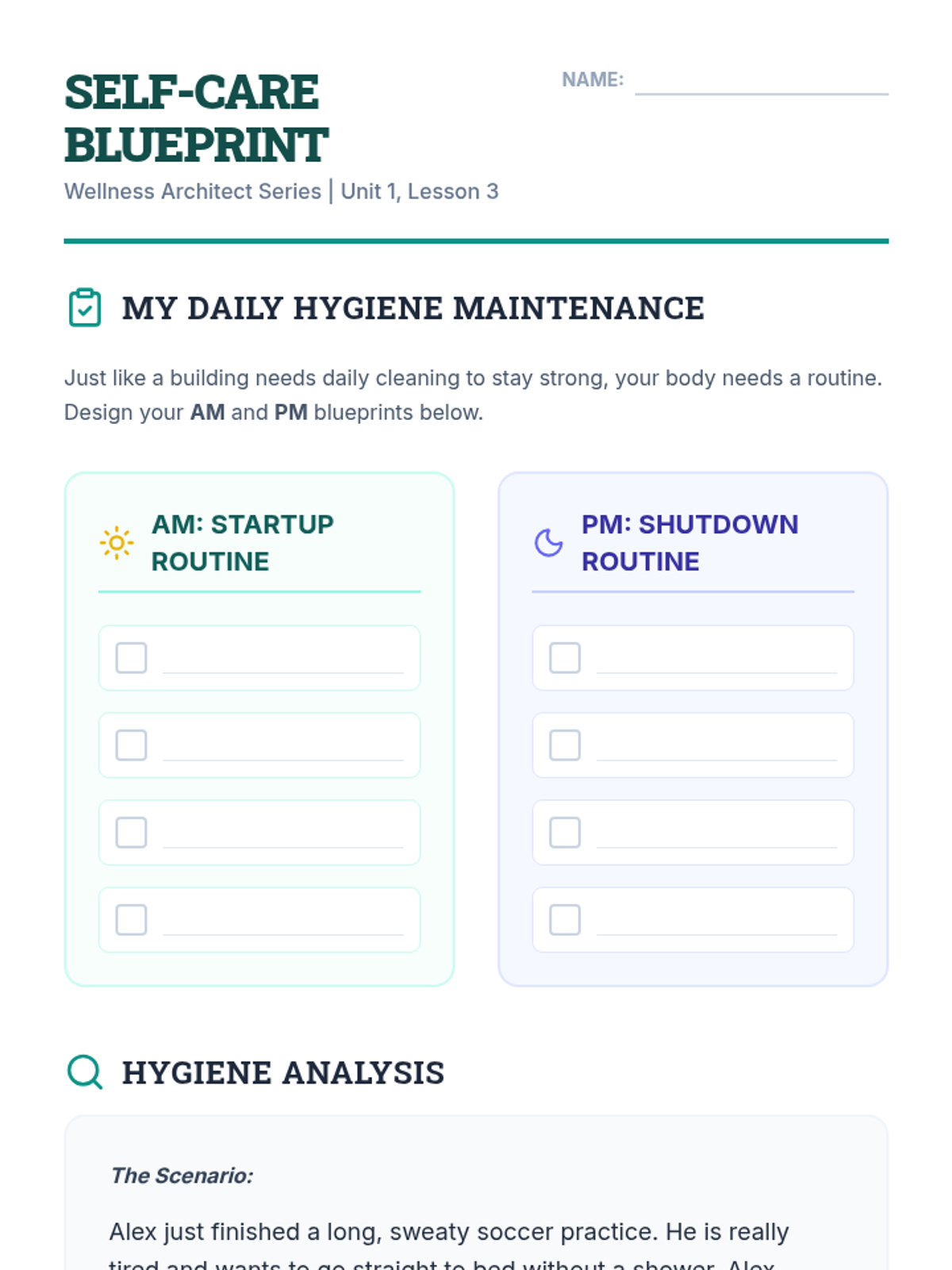 Focusing on the hygiene needs of growing 4th graders, this lesson covers dental care, skin hygiene, and germ prevention. Students develop a morning and evening blueprint to maintain their growing bodies.