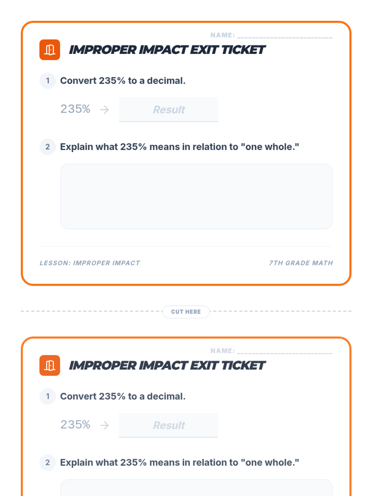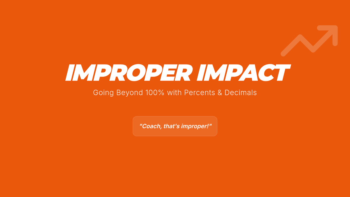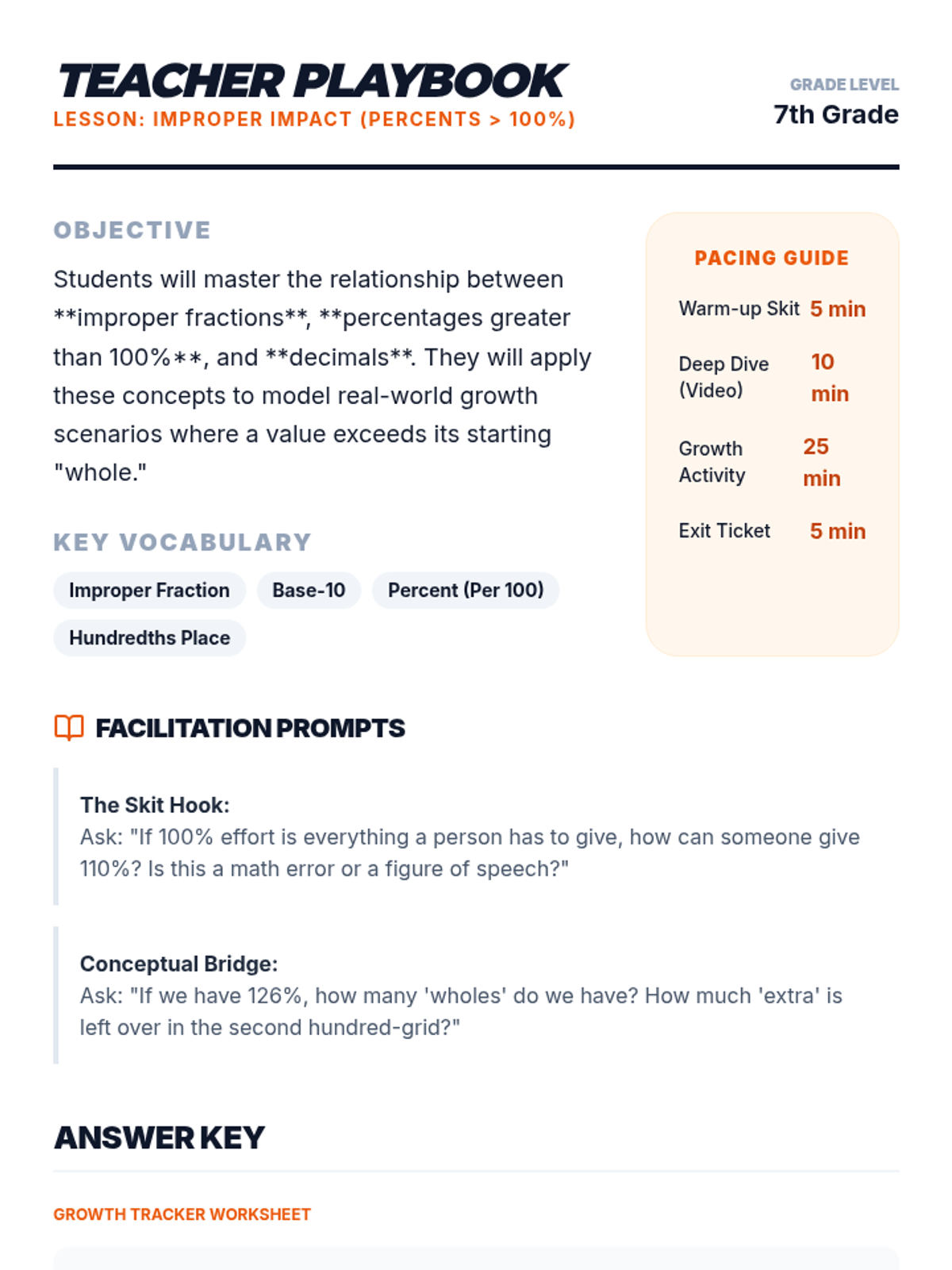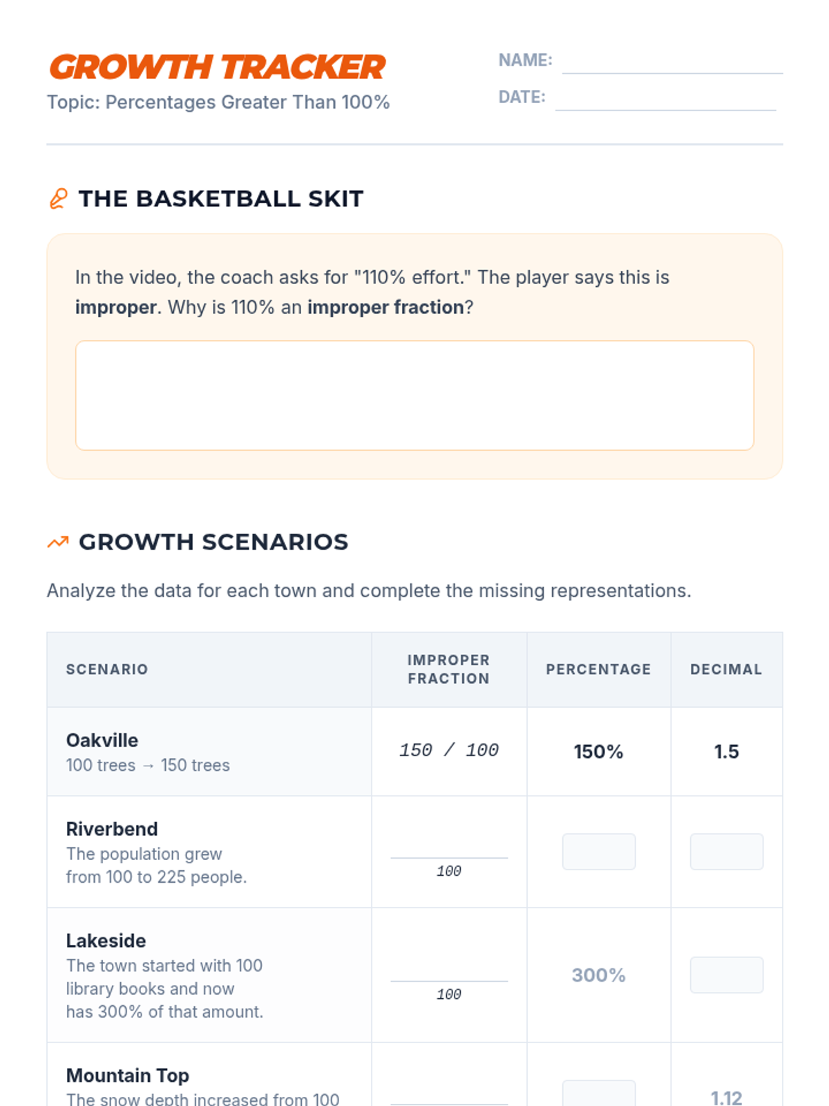 Students explore percentages exceeding 100% by connecting them to improper fractions and decimals, using real-world growth scenarios and a humorous basketball skit as anchors.