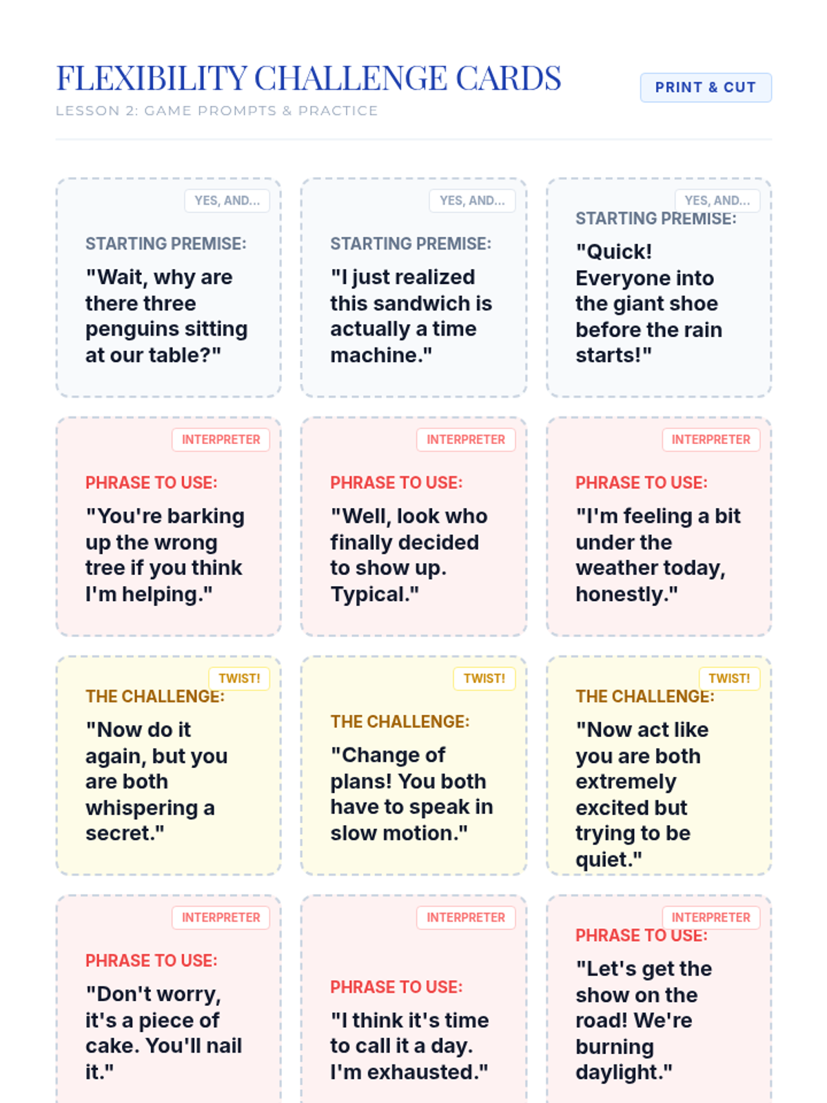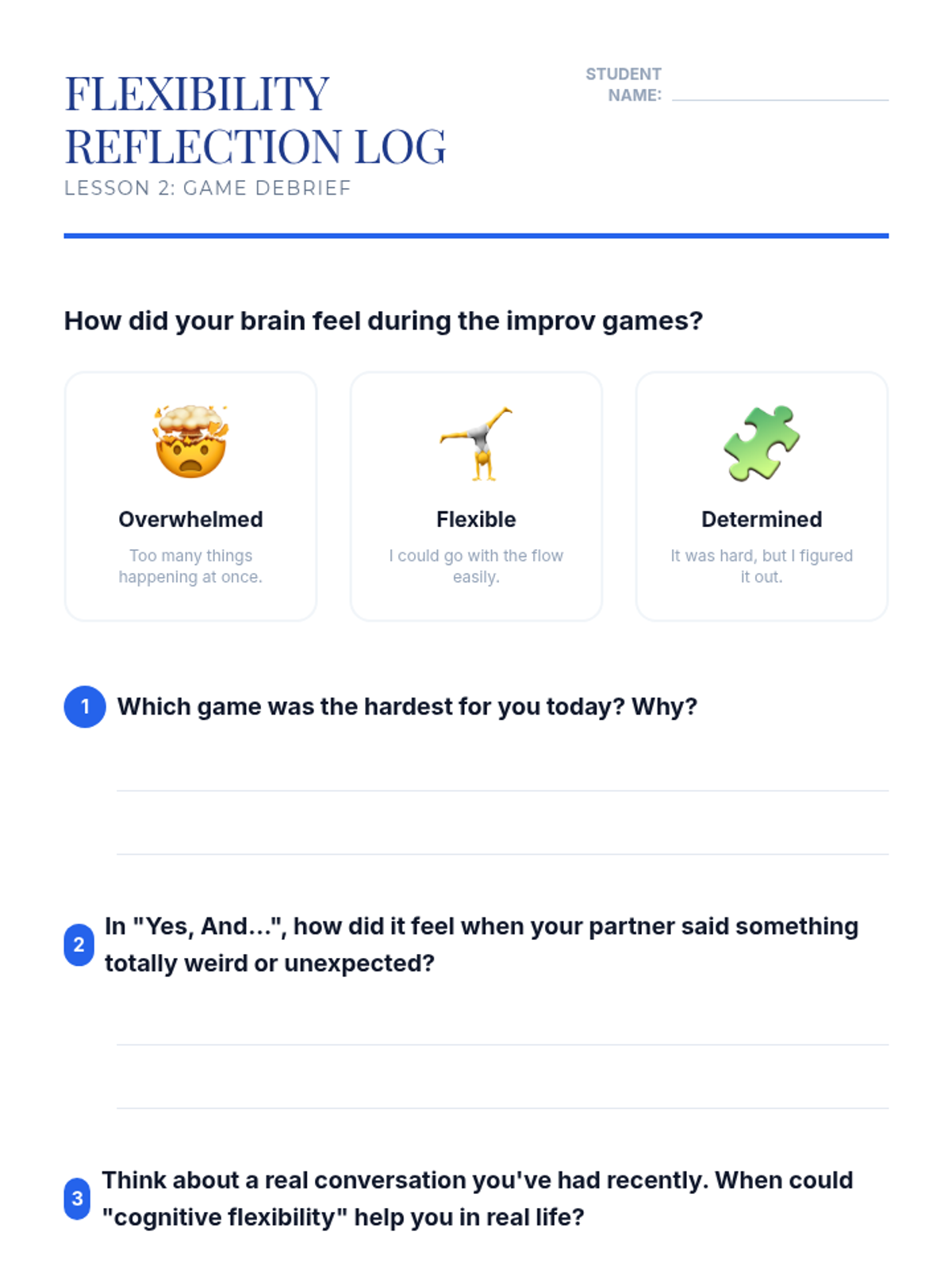 Students use improv games to build cognitive flexibility and practice responding to unexpected social inputs.