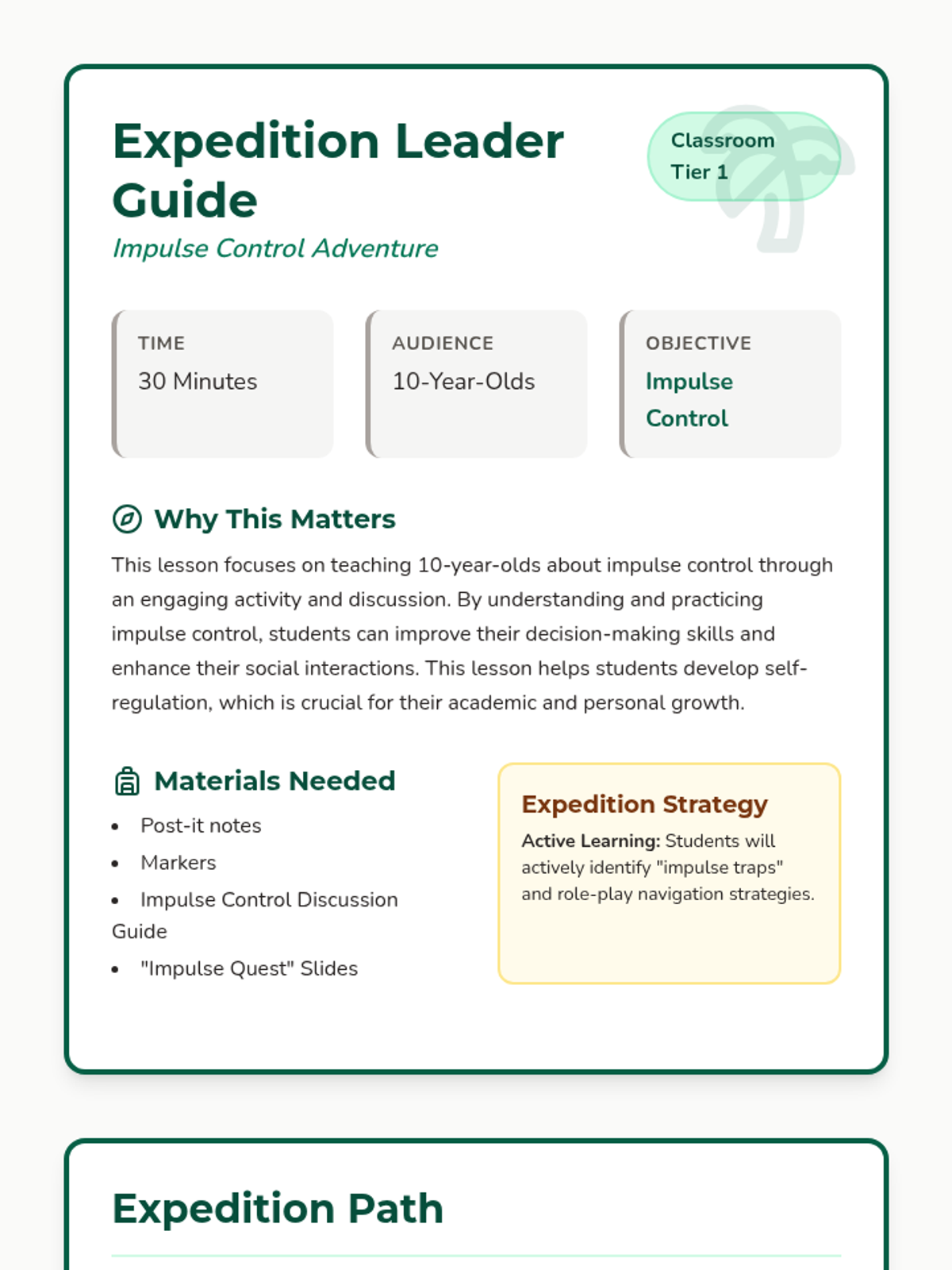 A 30-minute interactive lesson for 10-year-olds that uses a jungle expedition theme to teach self-regulation and impulse control through role-play and guided discussion.