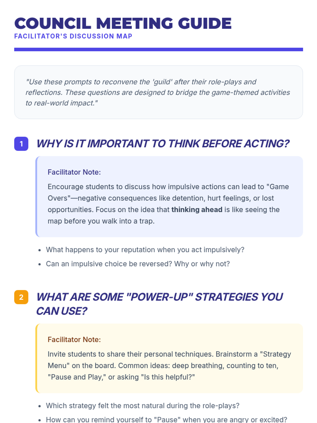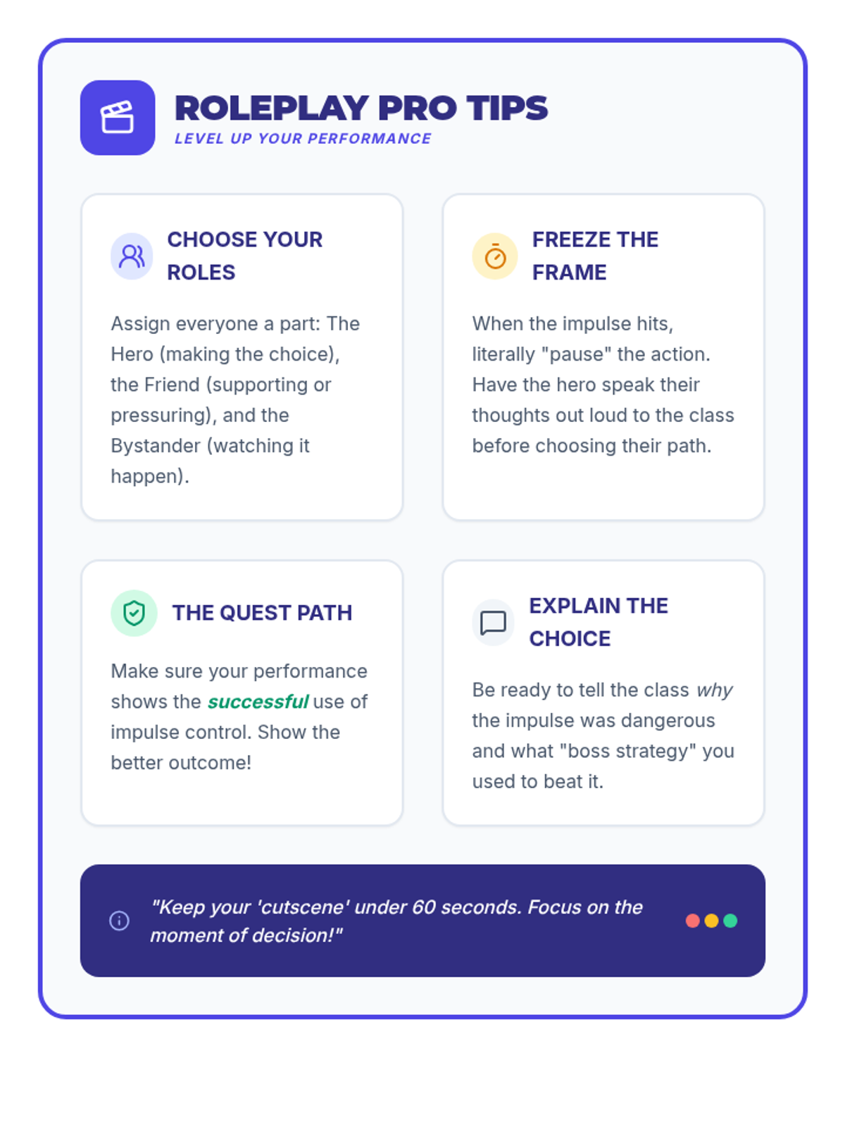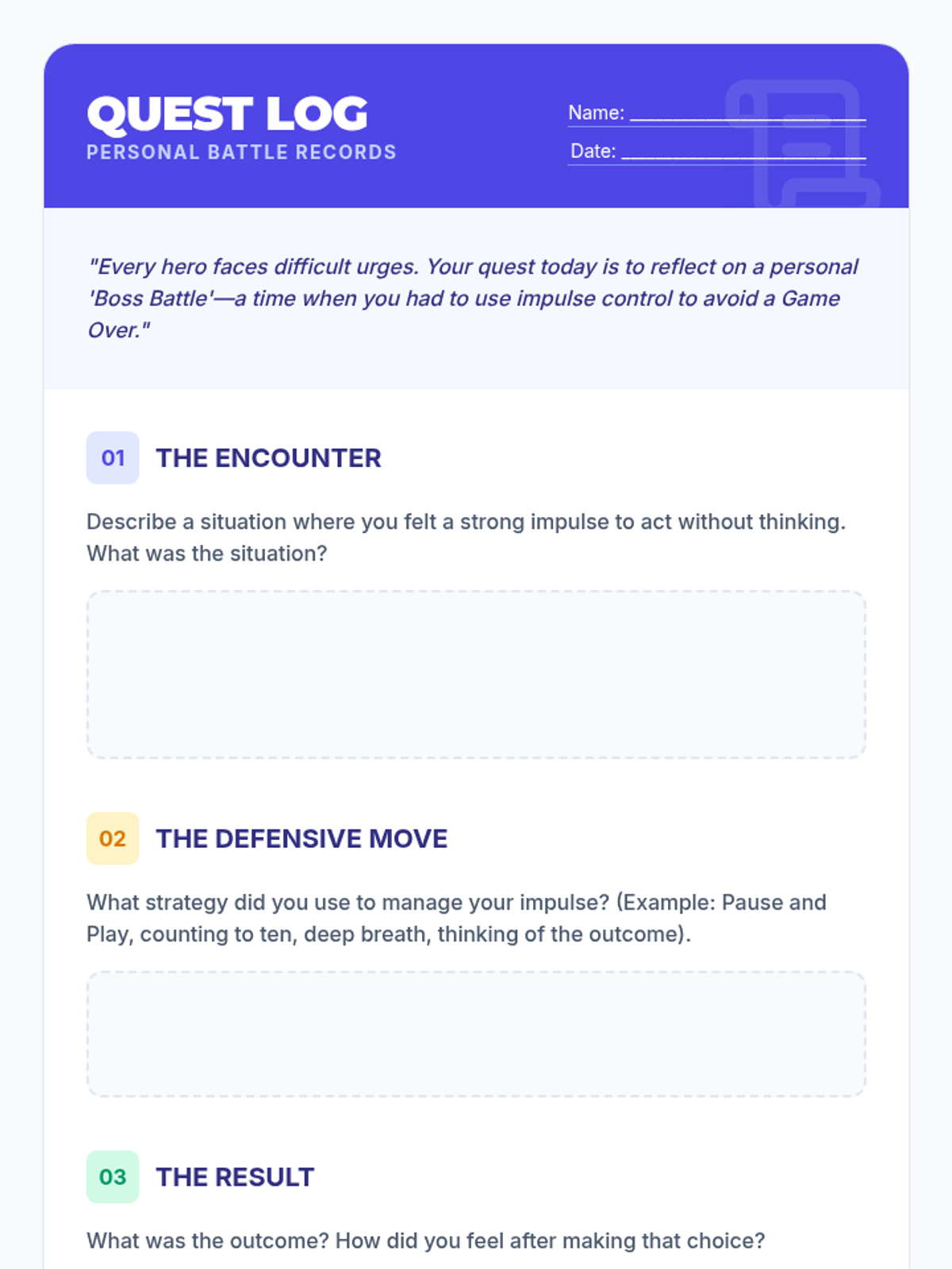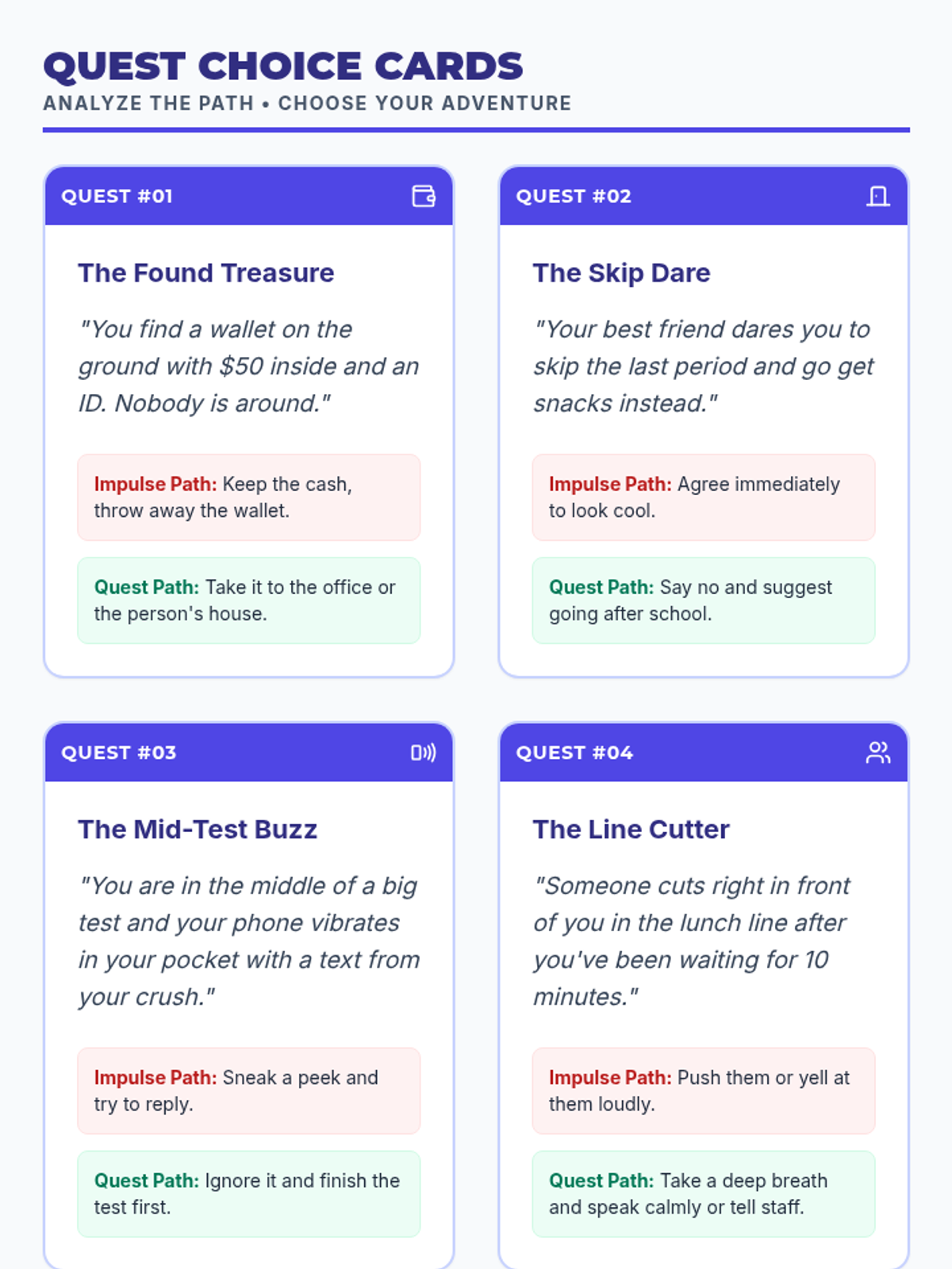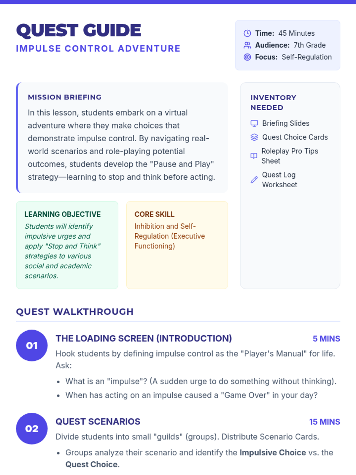 A 7th-grade SEL lesson themed as a 'Quest' where students practice impulse control through scenario analysis, role-playing, and personal reflection. Students learn to 'pause and play' before making impulsive decisions.