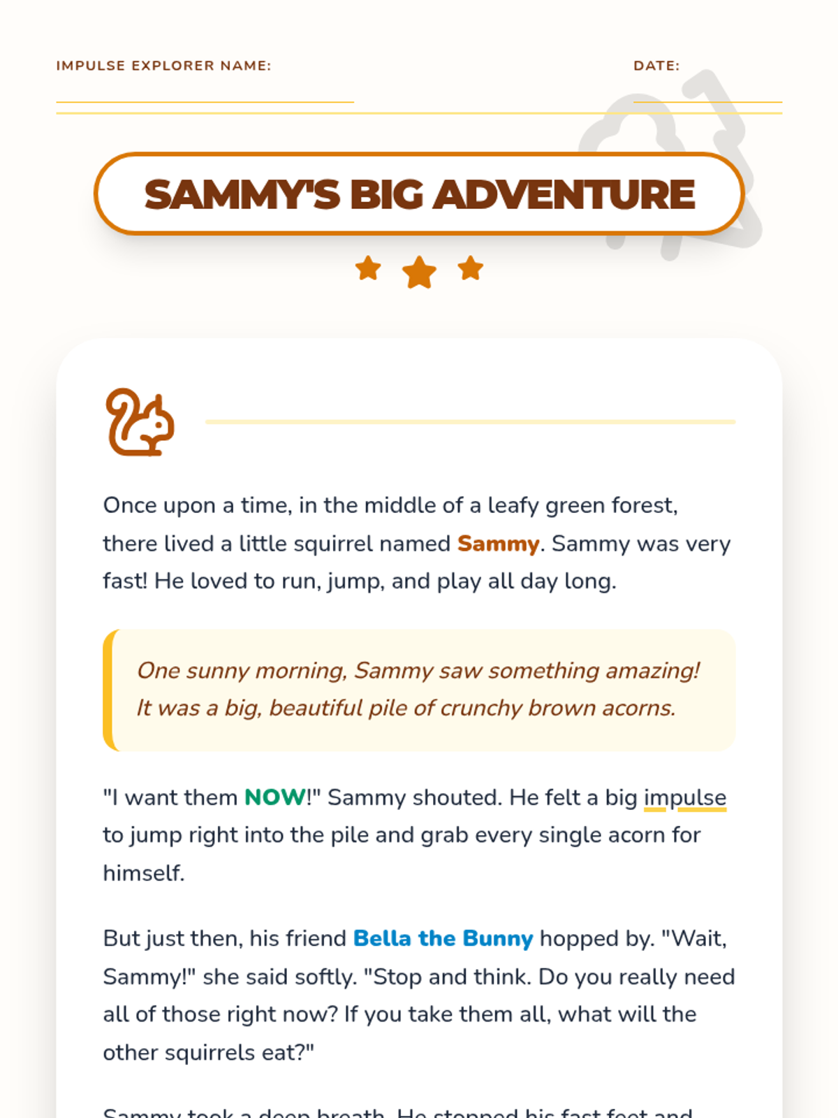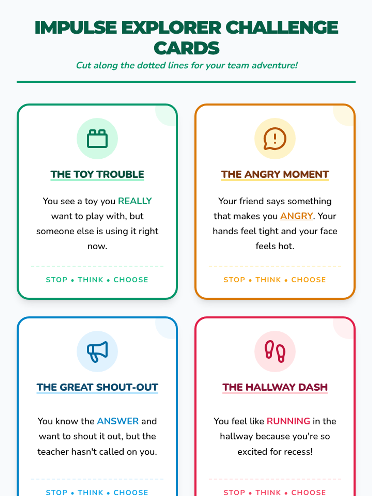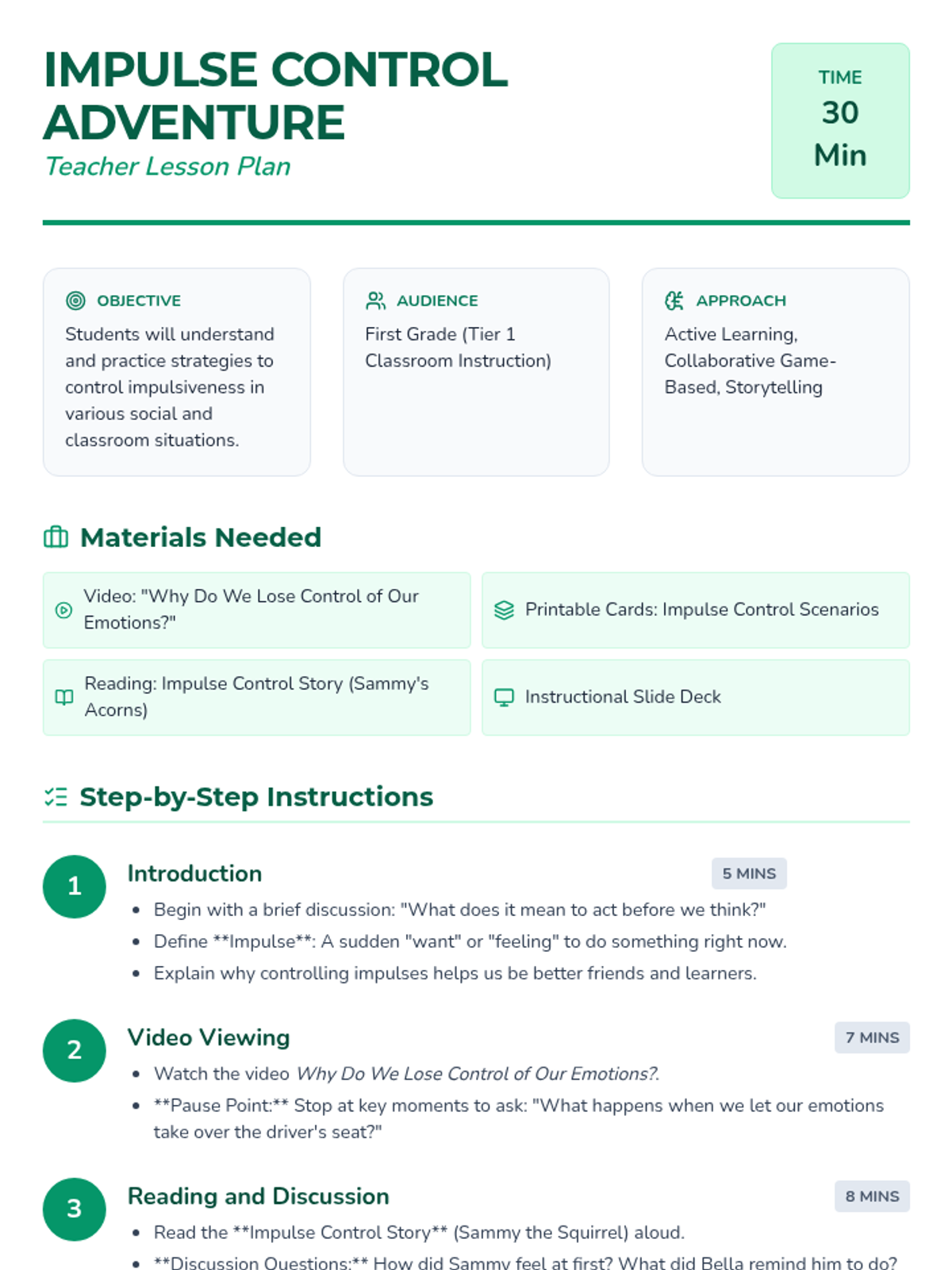 An engaging 1st-grade lesson that uses a forest adventure theme to teach impulse control through stories, videos, and role-playing scenarios.