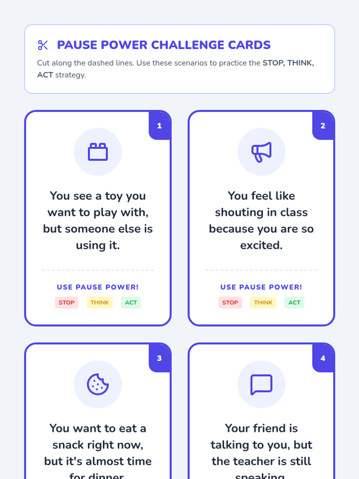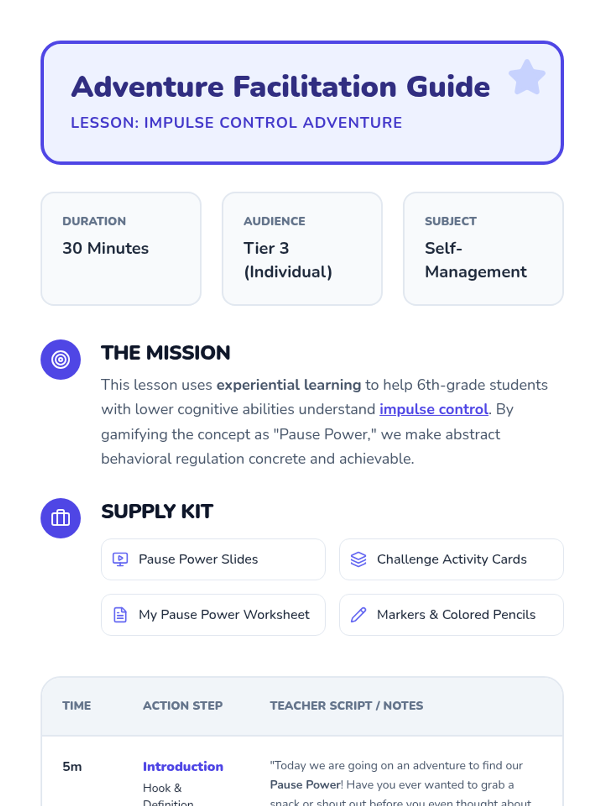 A Tier 3 intervention lesson designed for a 6th-grade student with low cognitive and reading abilities, focusing on identifying impulses and practicing 'Pause Power' strategies through game-based learning.