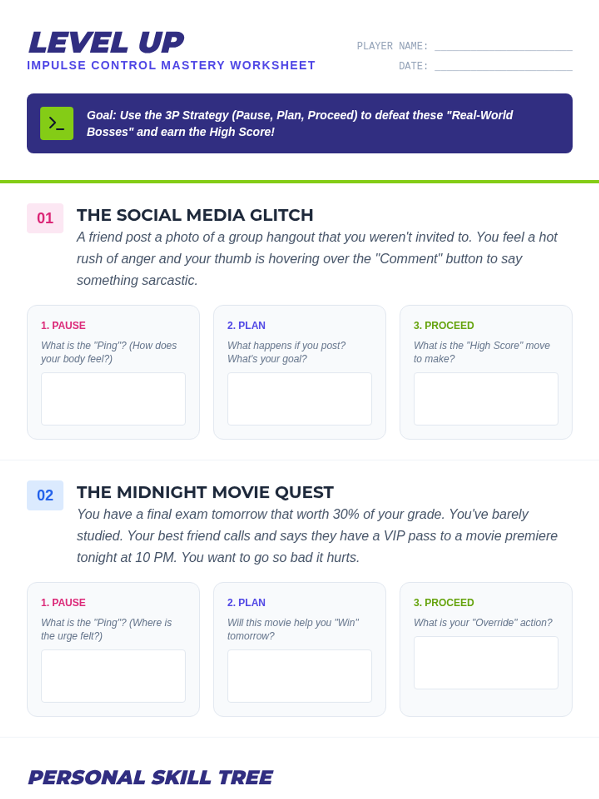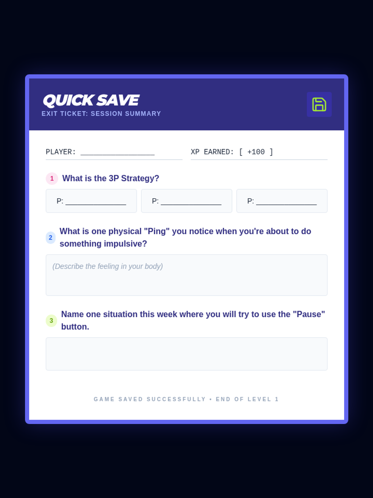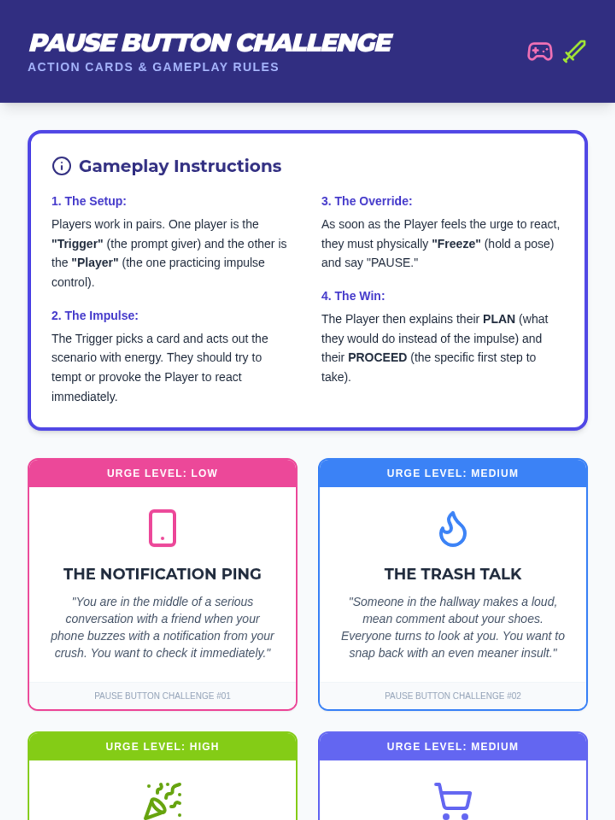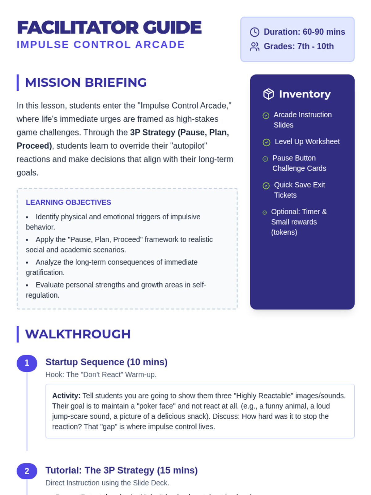 A retro arcade-themed lesson for 7th-10th graders focusing on impulse control through game-based strategies like the 'Pause, Plan, Proceed' method. Students participate in challenges that simulate real-world urges to help them build self-regulation skills.