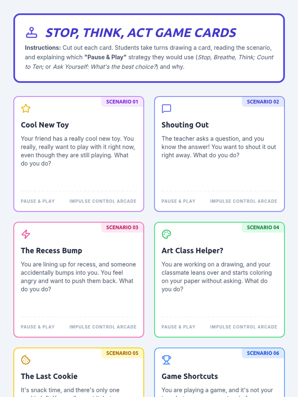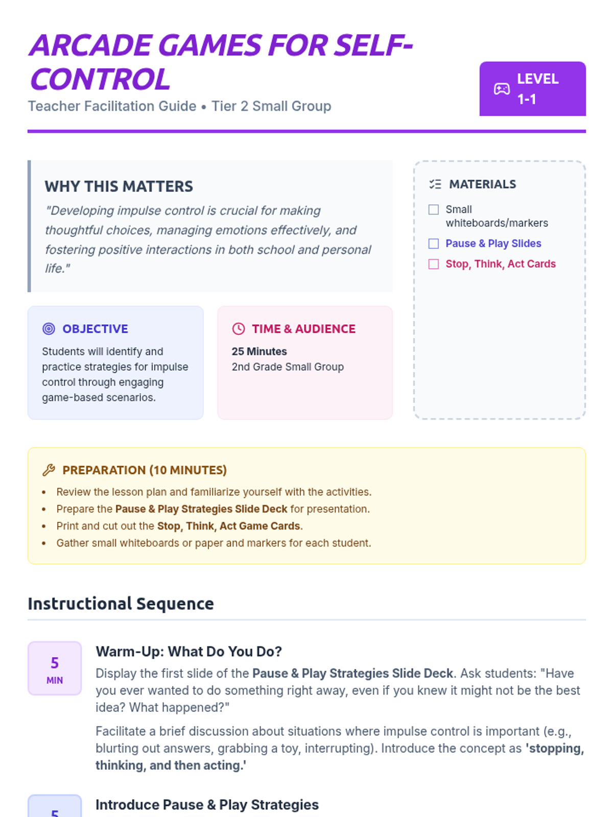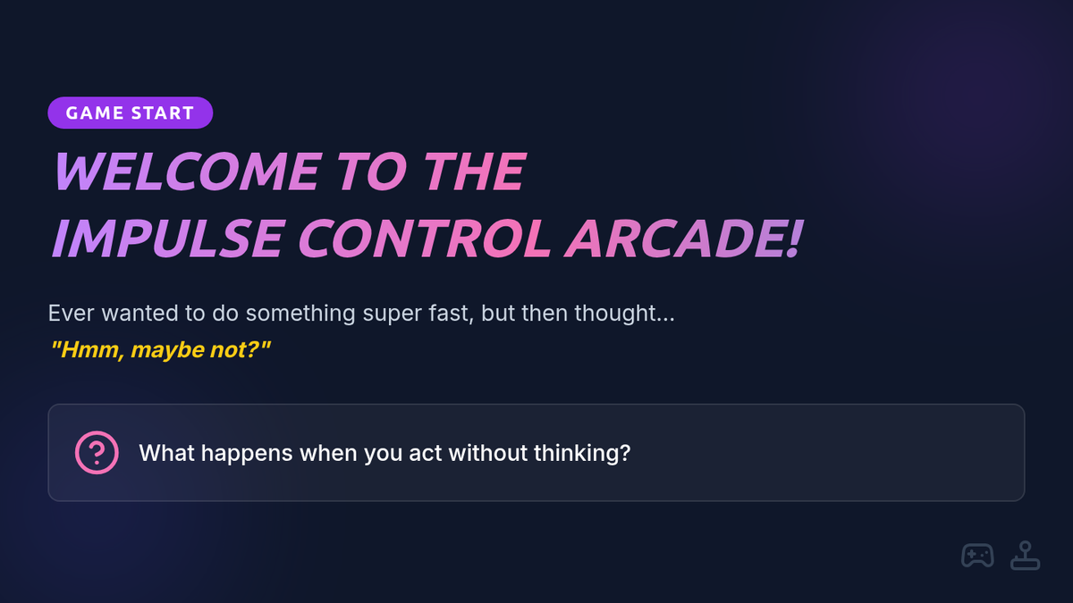 A high-energy, small-group lesson for 2nd graders that uses arcade-themed games and strategies like 'Pause & Play' to teach impulse control and self-regulation.