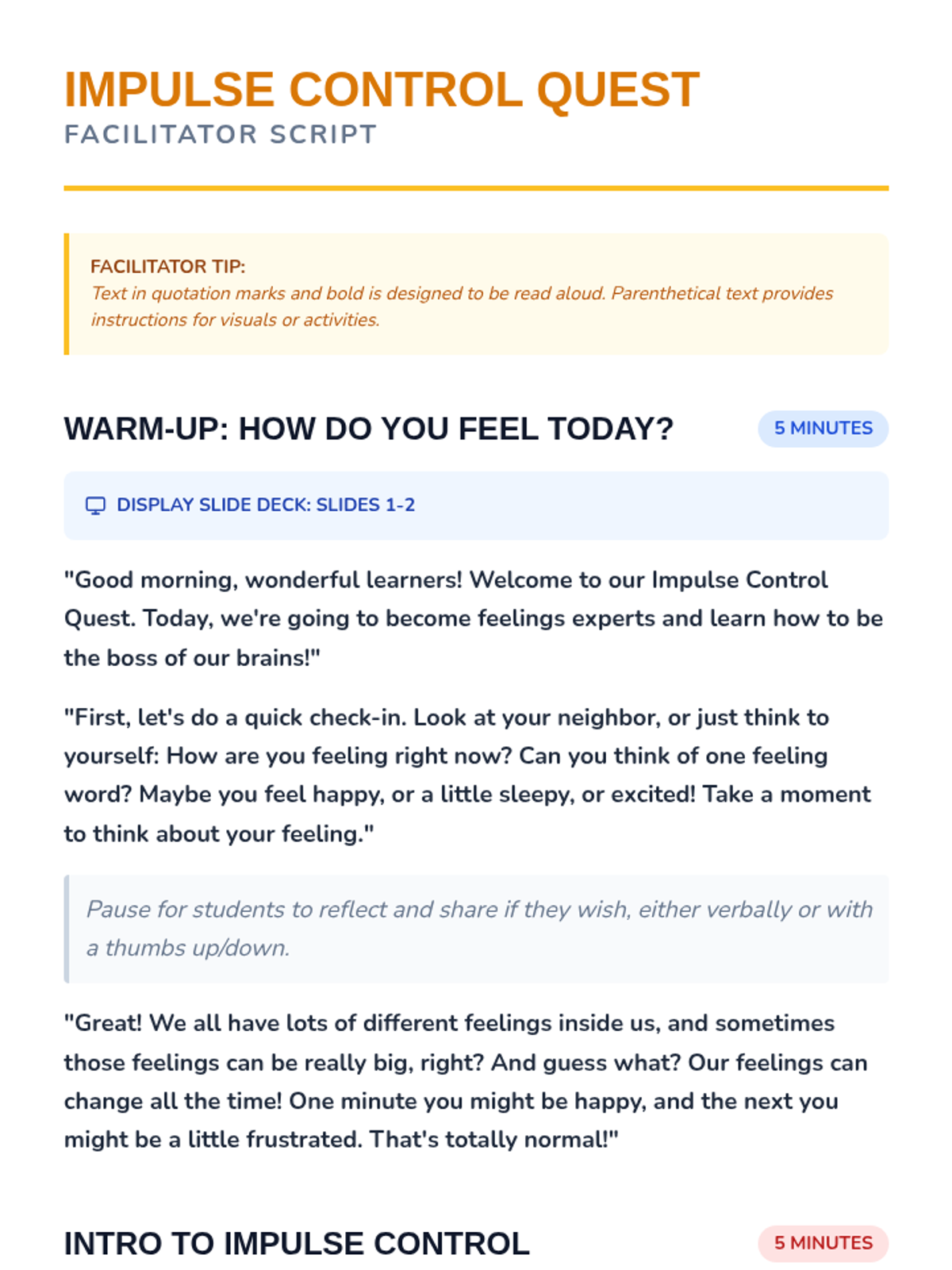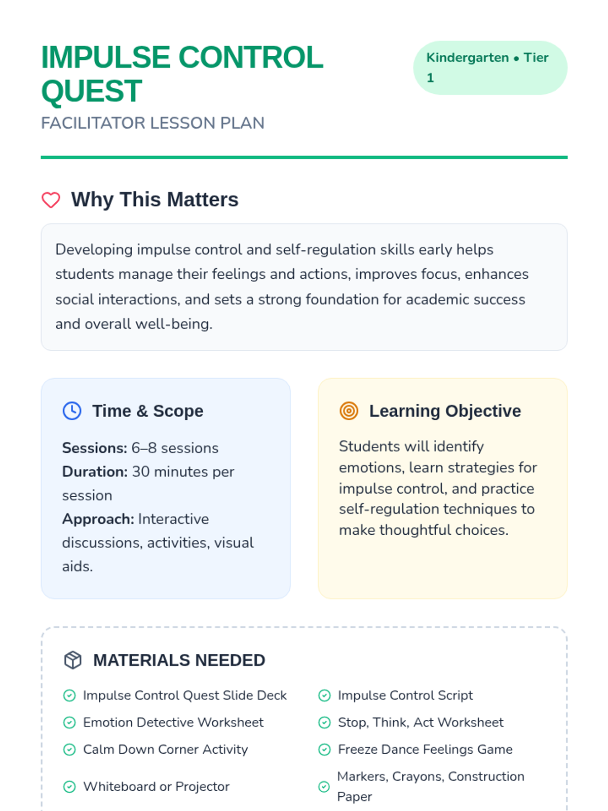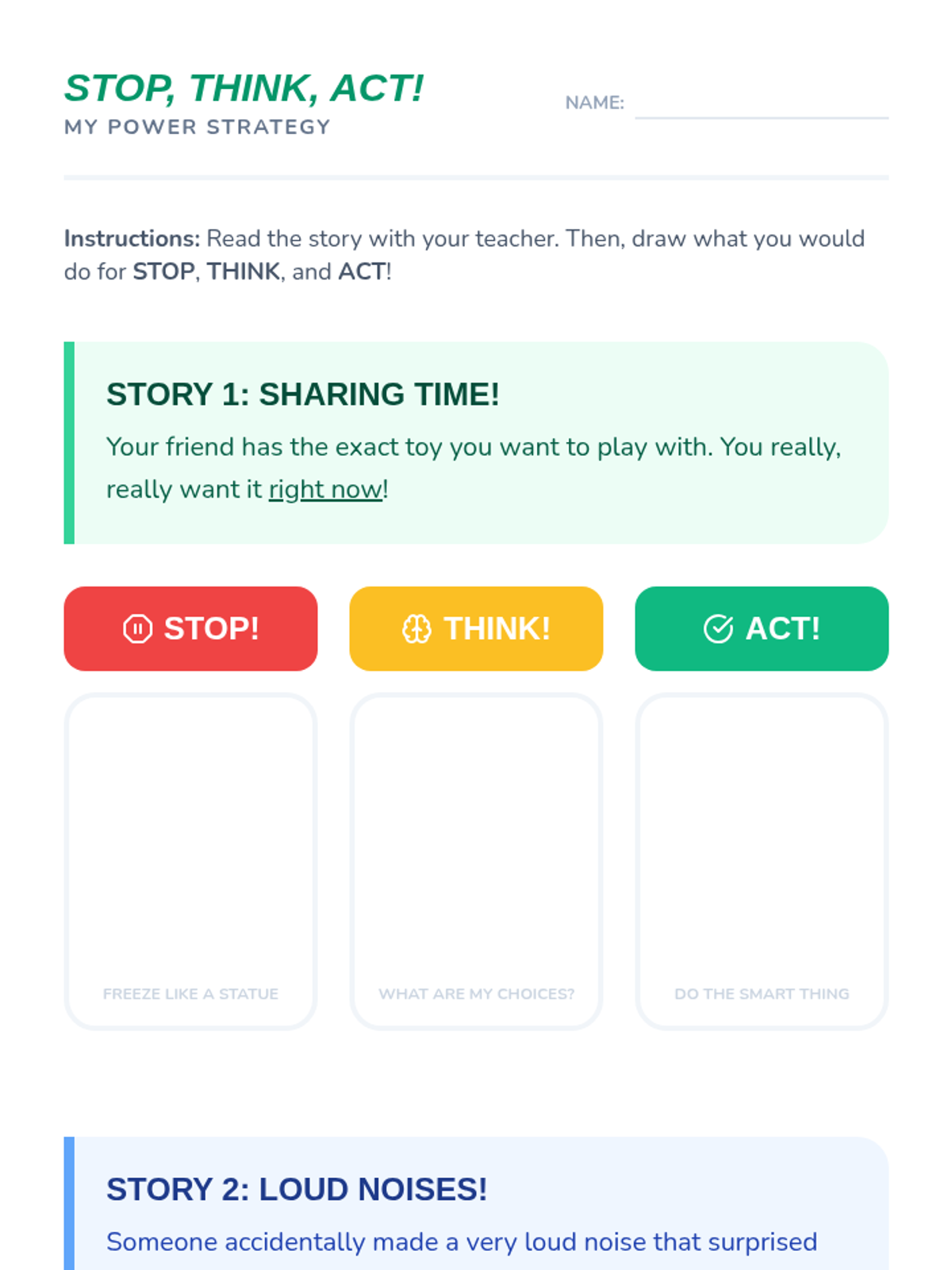 This lesson introduces students to identifying emotions and the 'Stop, Think, Act' strategy to manage impulses and make thoughtful choices.