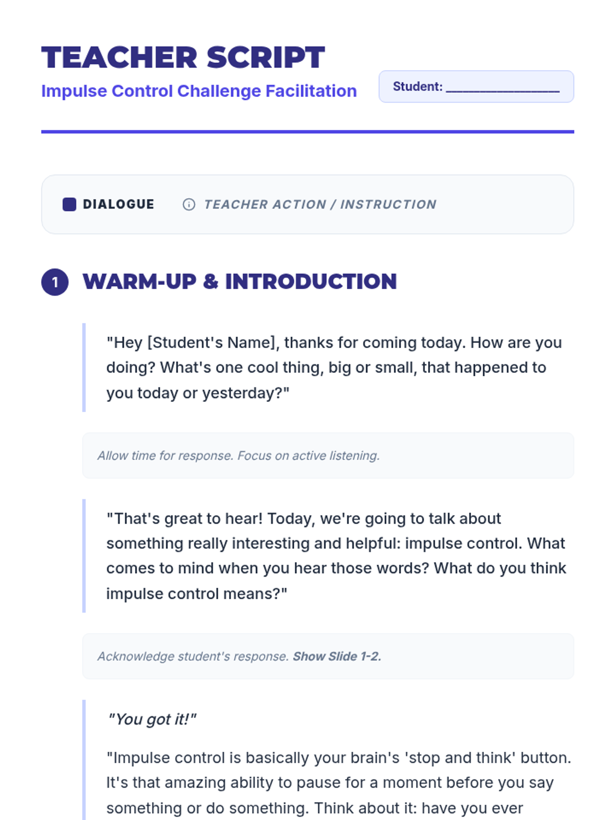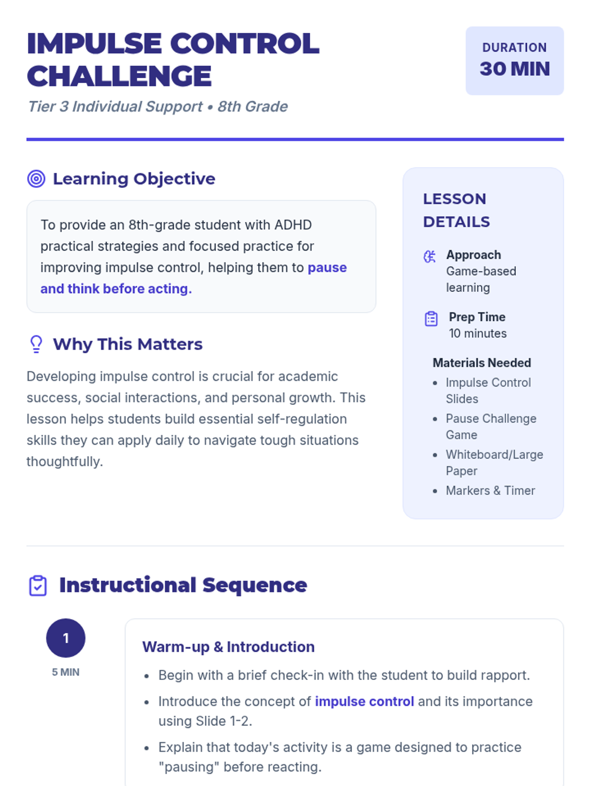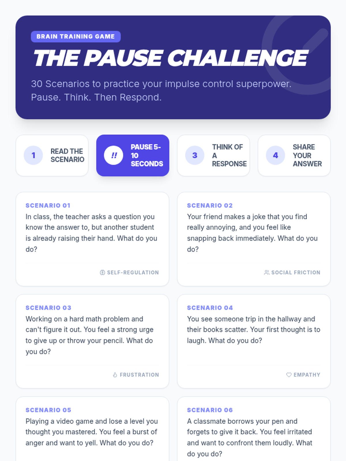 A high-energy, 30-minute individual lesson for 8th-grade students with ADHD to practice impulse control using 'The Pause Challenge' game, focusing on developing a 'stop and think' muscle.