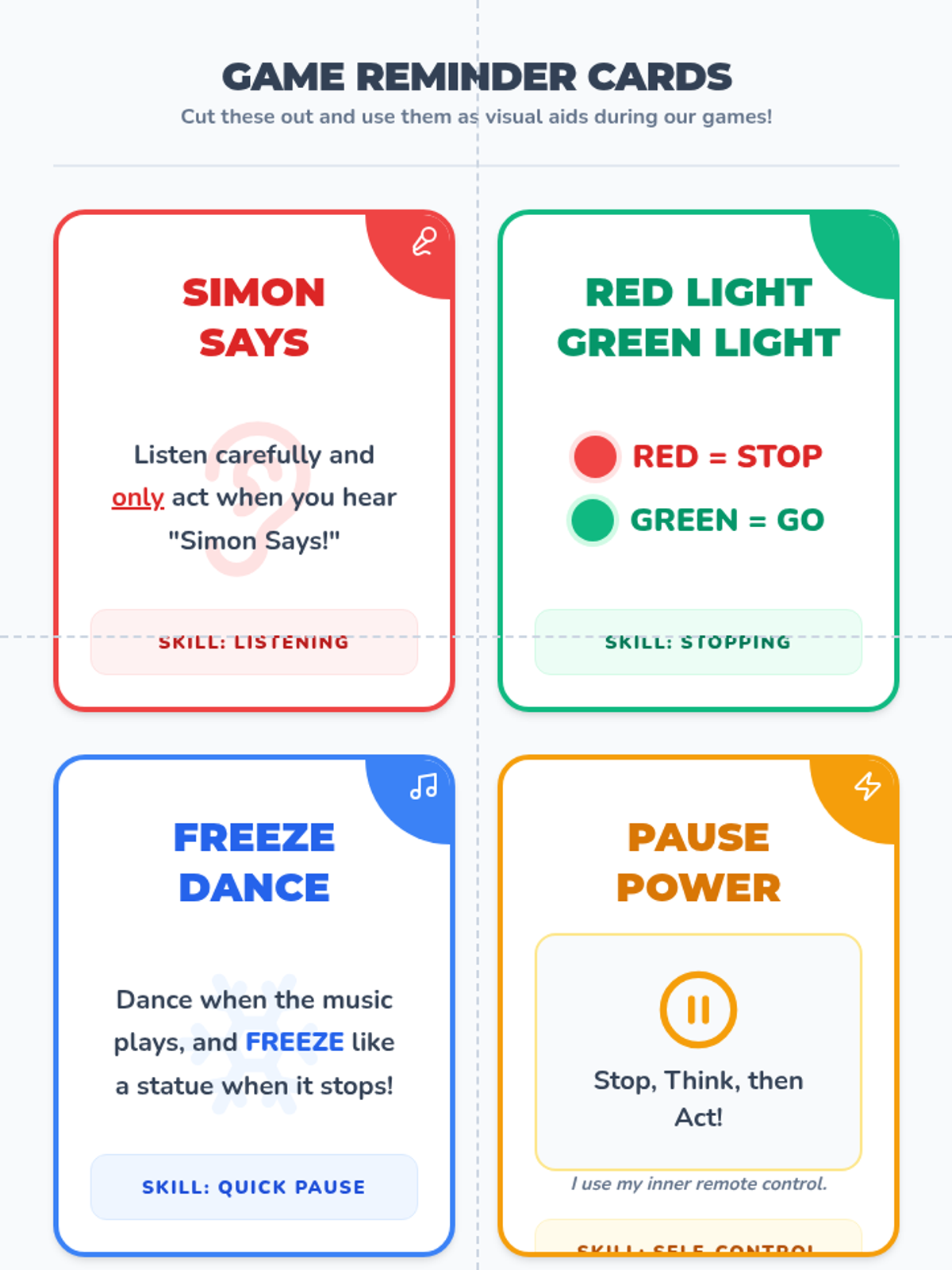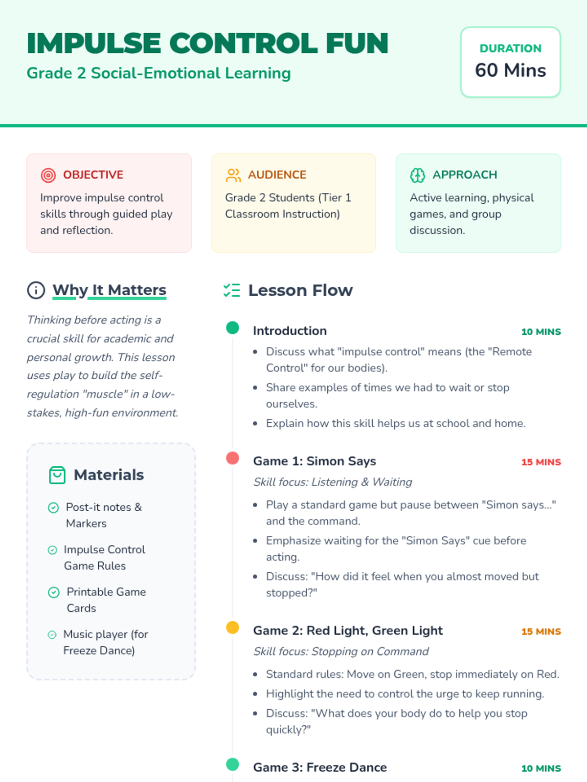 A Grade 2 lesson focused on developing self-regulation through interactive games like Simon Says and Red Light, Green Light. Students learn to pause, listen, and control their actions in a fun, high-energy environment.