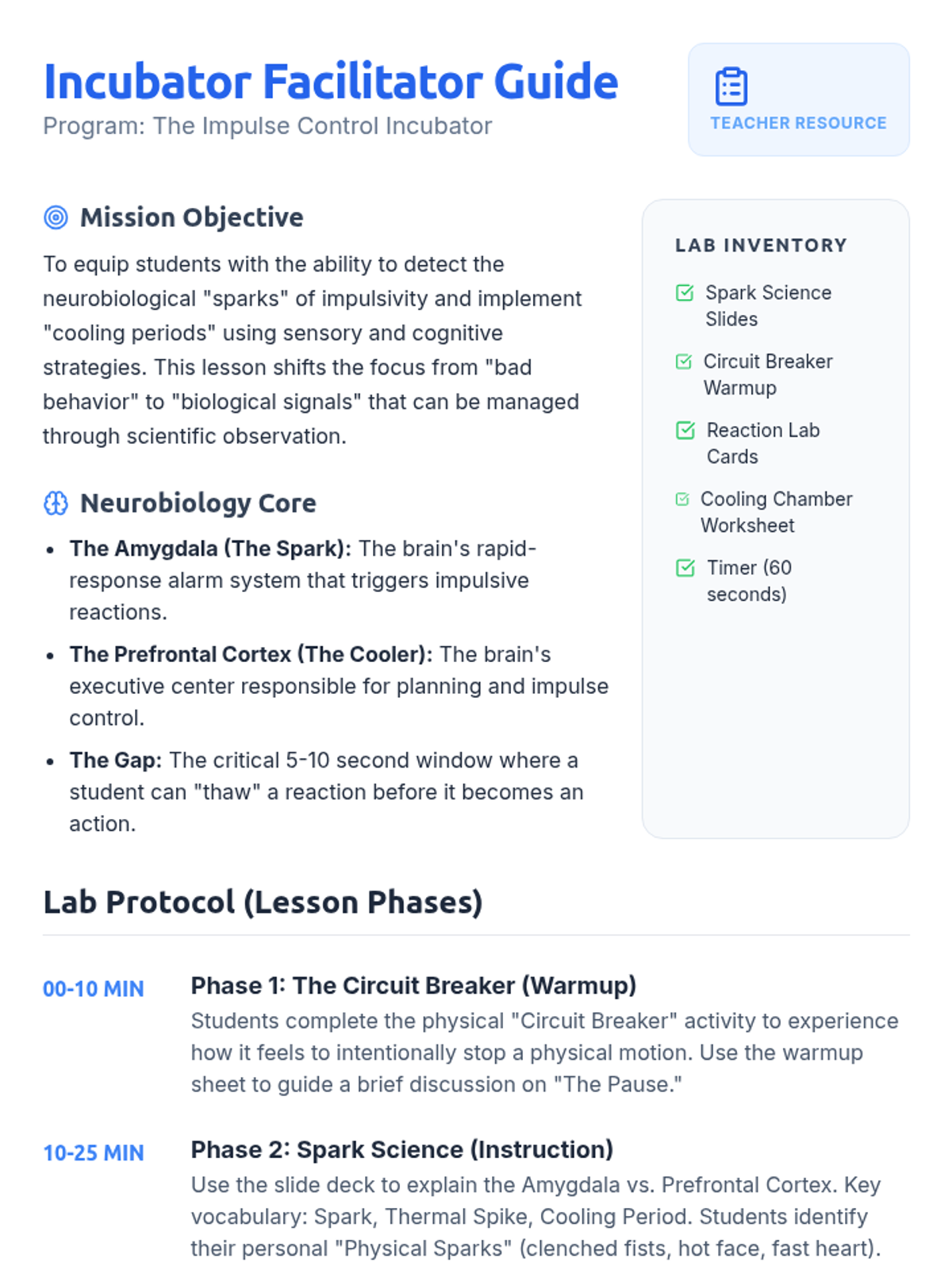 A neurobiology-based program that teaches students to identify physical 'spark' sensations and apply 'cooling' strategies to manage impulsive reactions. Through laboratory-themed experiments, students learn to regulate behaviors before they escalate.