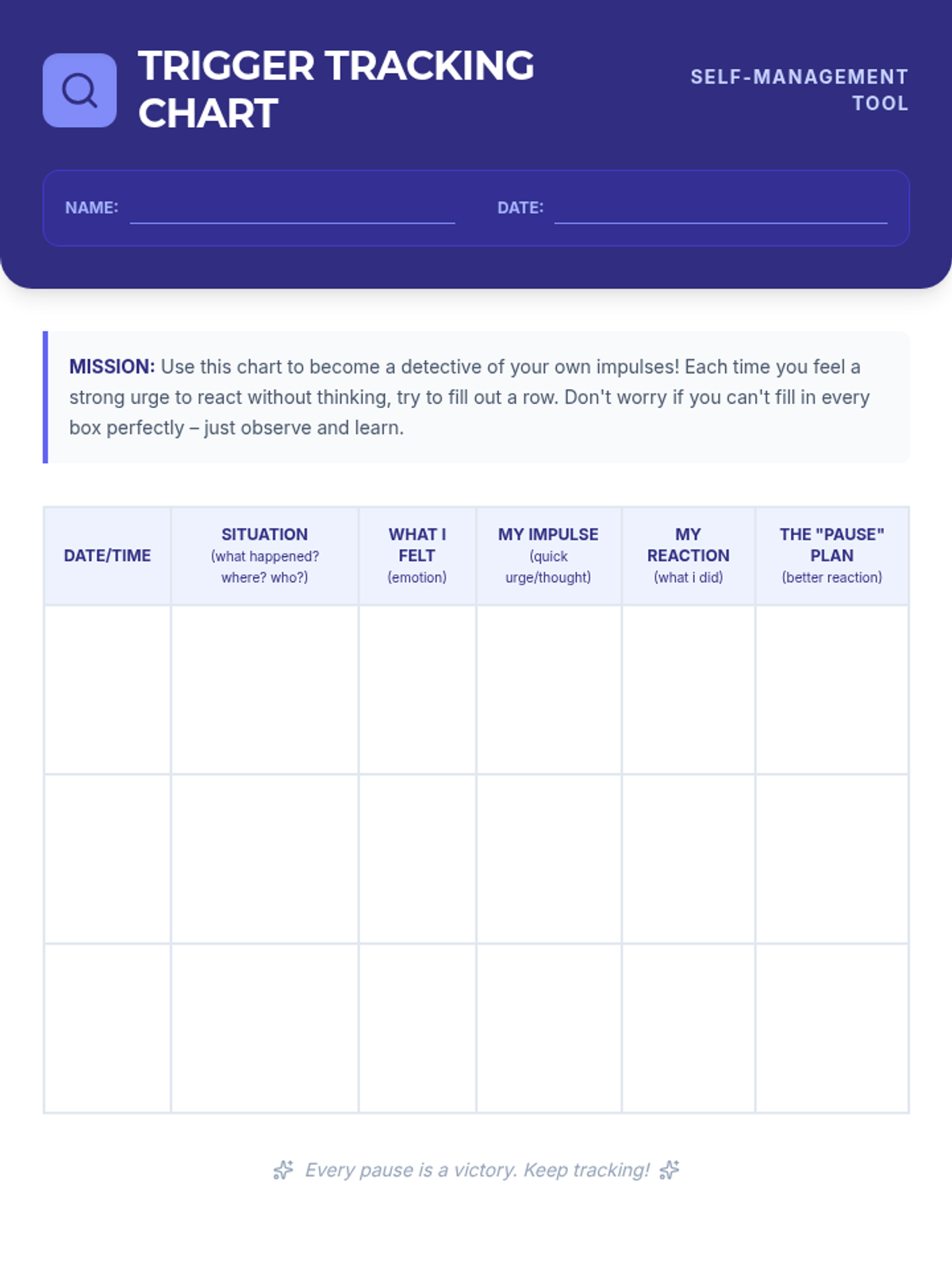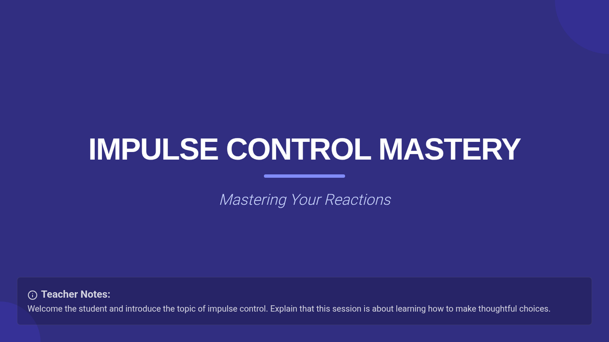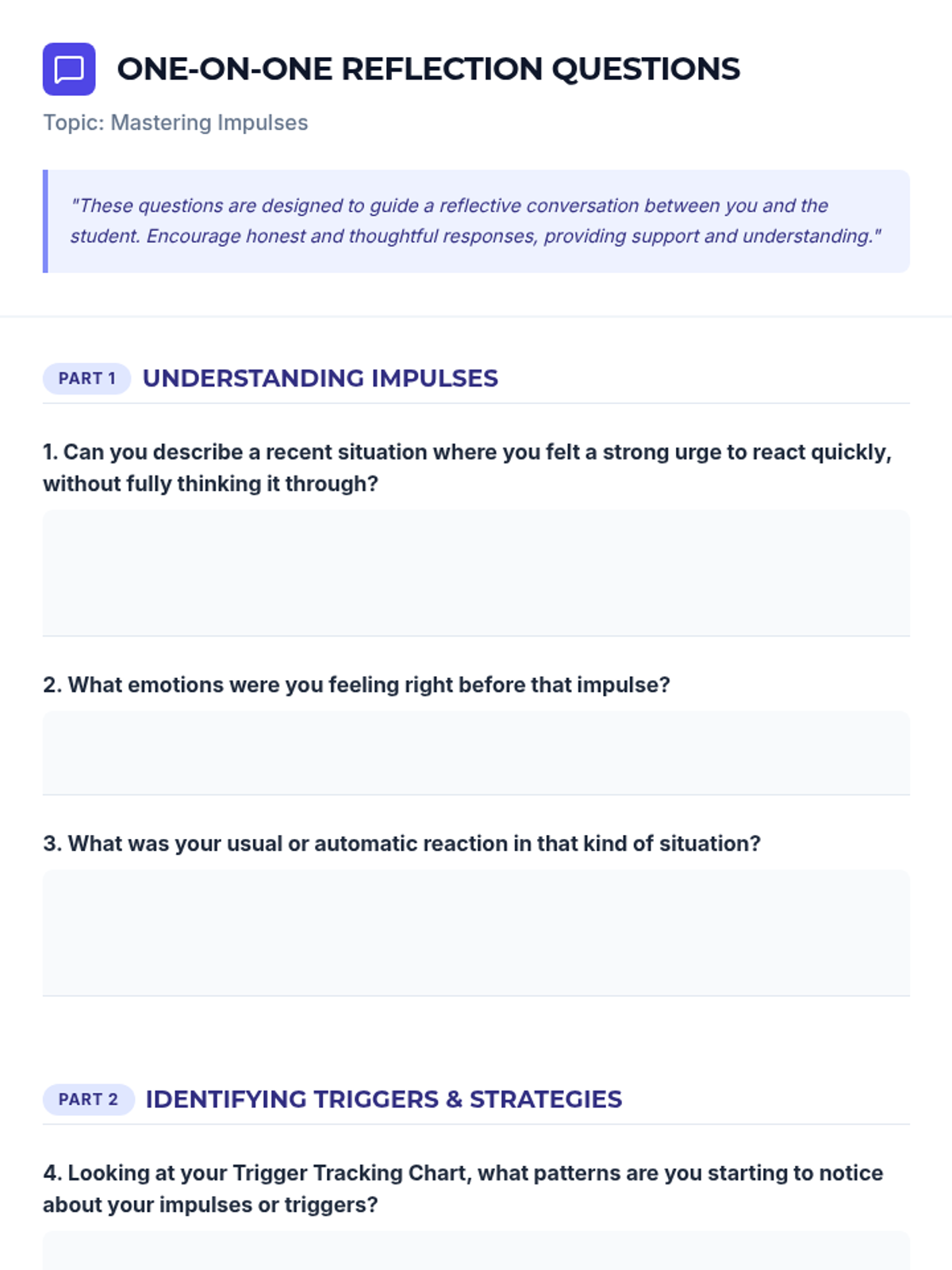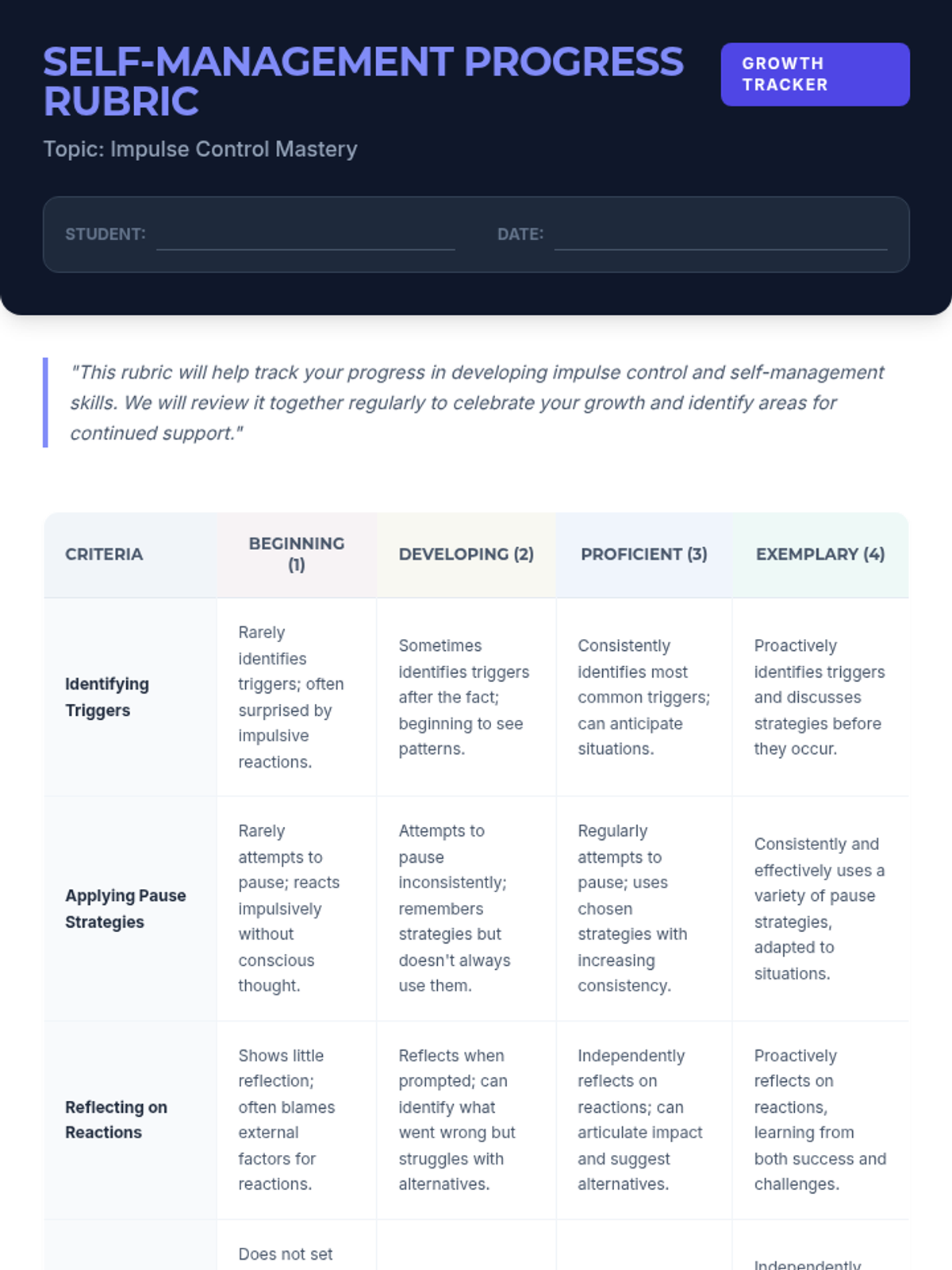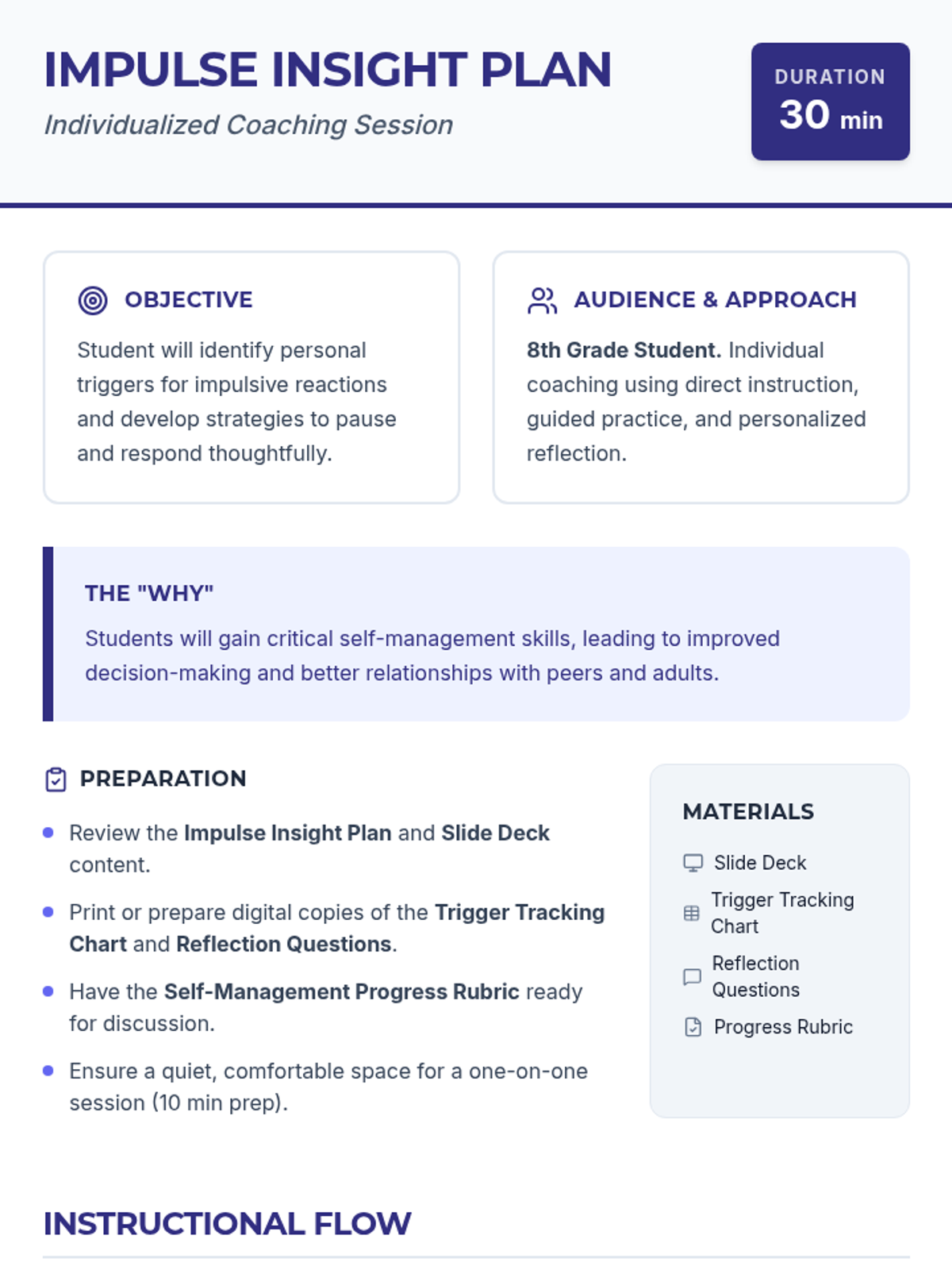An individualized coaching session for 8th-grade students to develop impulse control through identifying triggers and practicing "pause" strategies.