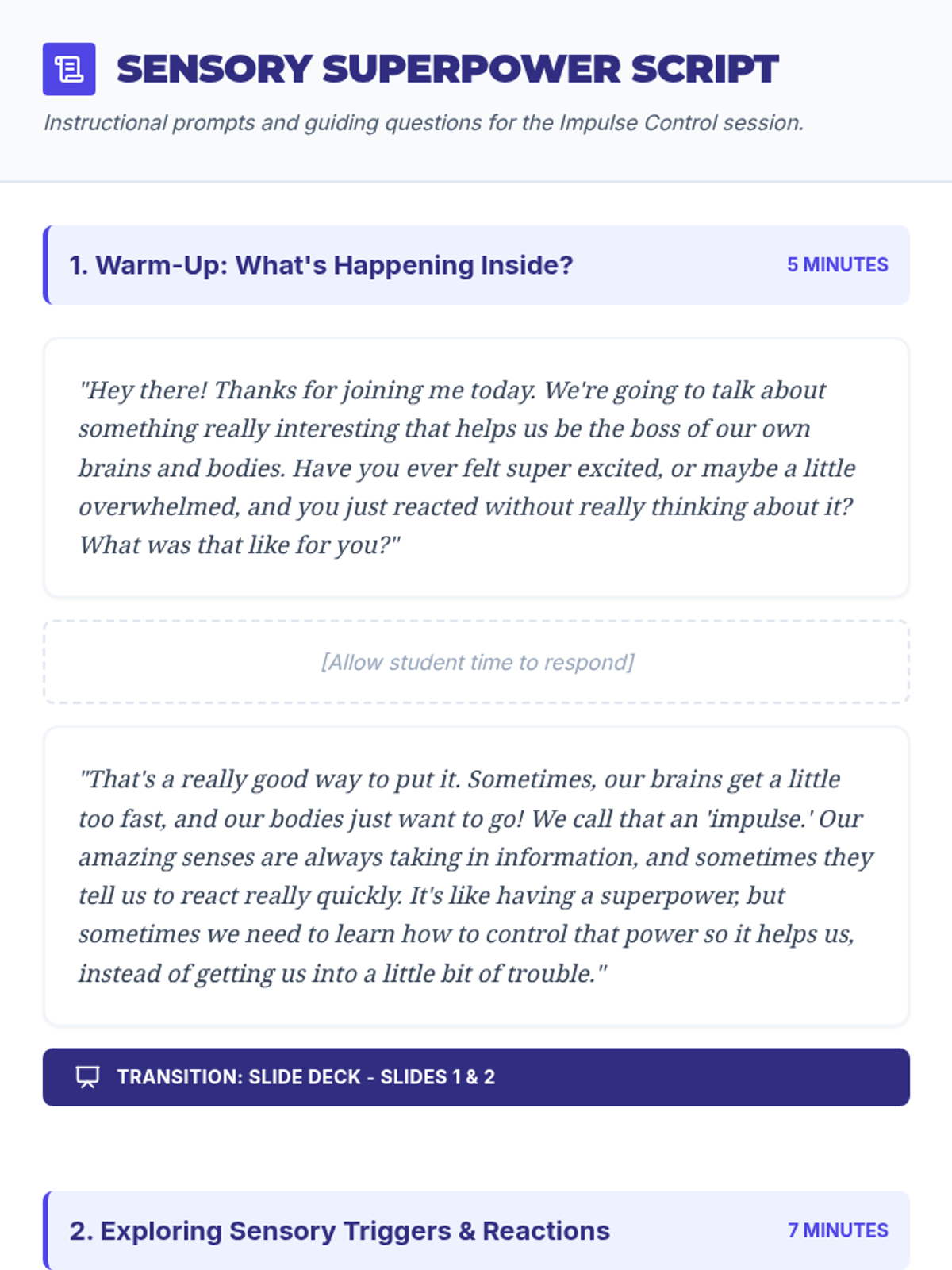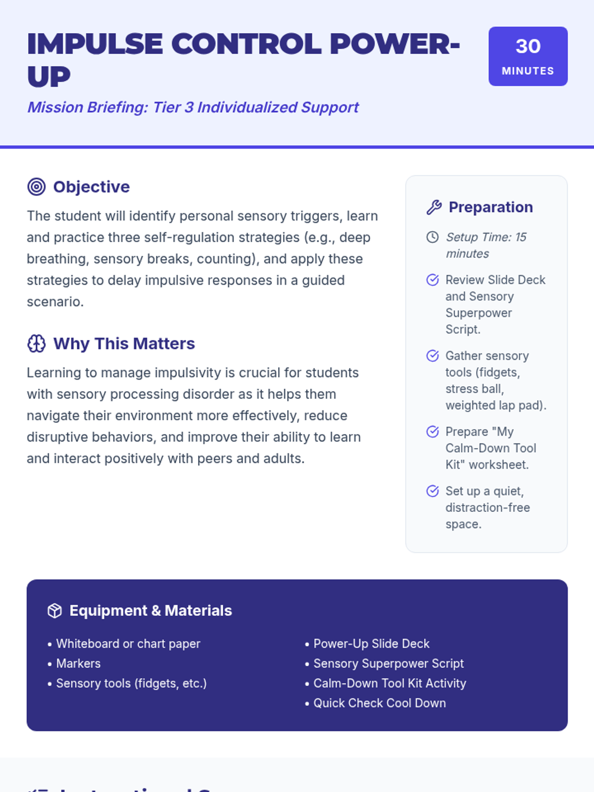 A 30-minute Tier 3 individualized lesson designed for a student with sensory processing disorder to develop impulse control strategies through sensory awareness and self-regulation techniques.