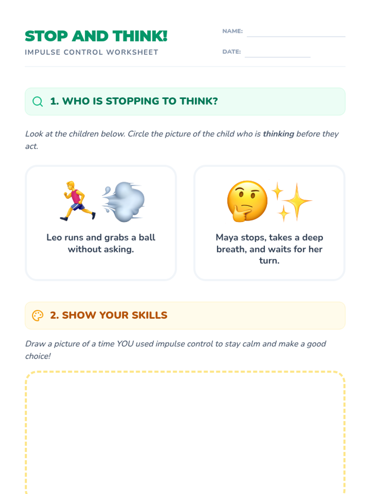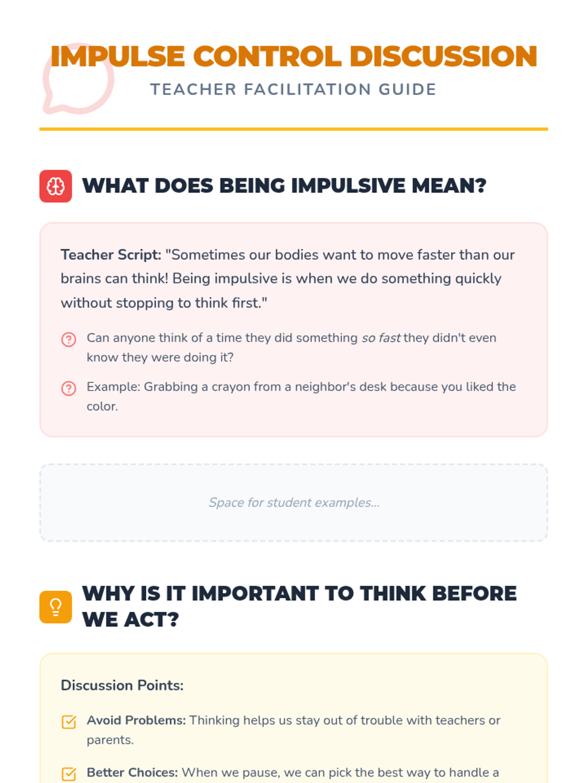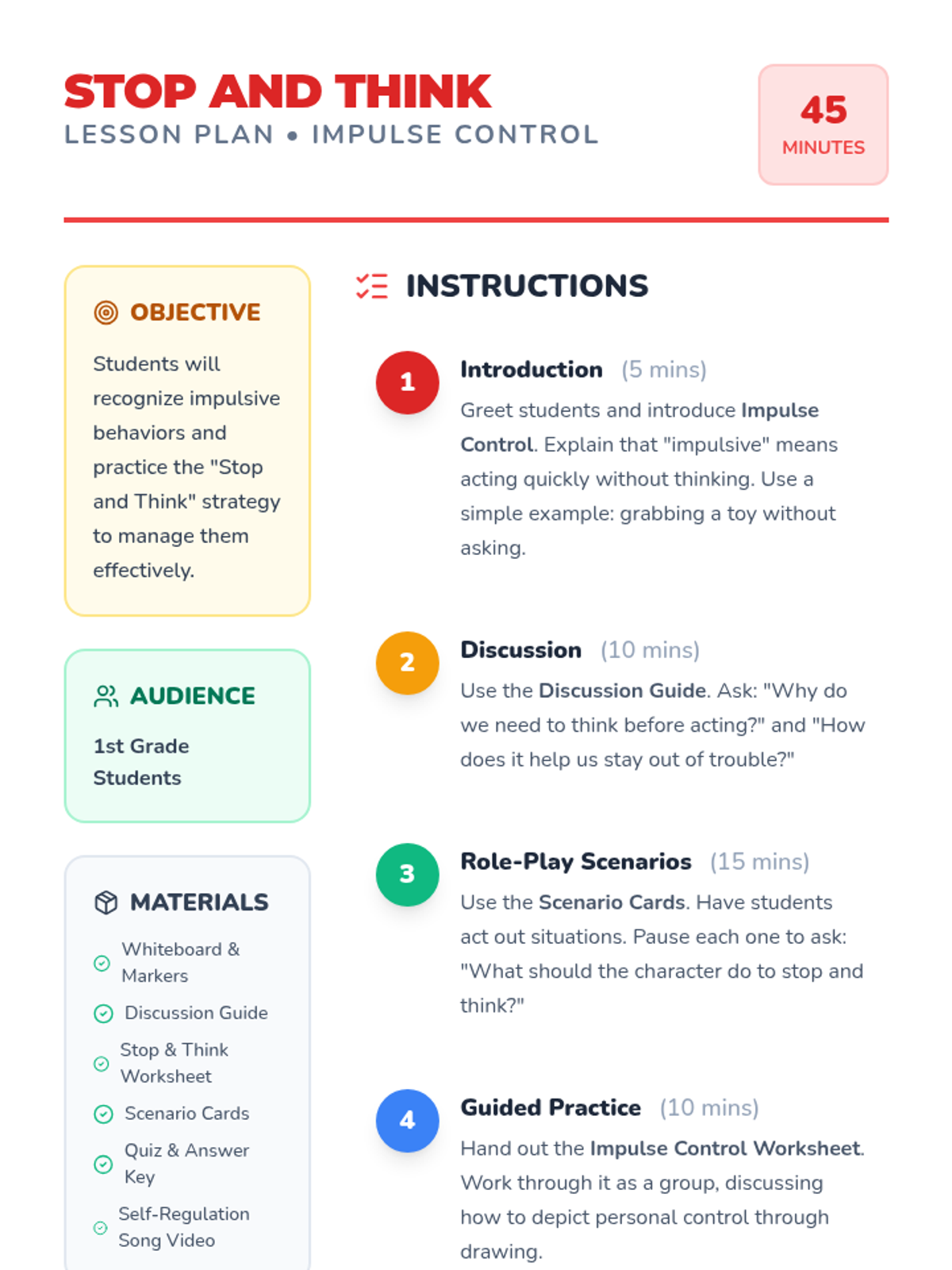 This lesson helps 1st-grade students identify impulsive behaviors and learn the 'Stop and Think' strategy through discussion, role-play, and creative activities. Students will explore how pausing before acting leads to better choices and stronger friendships.