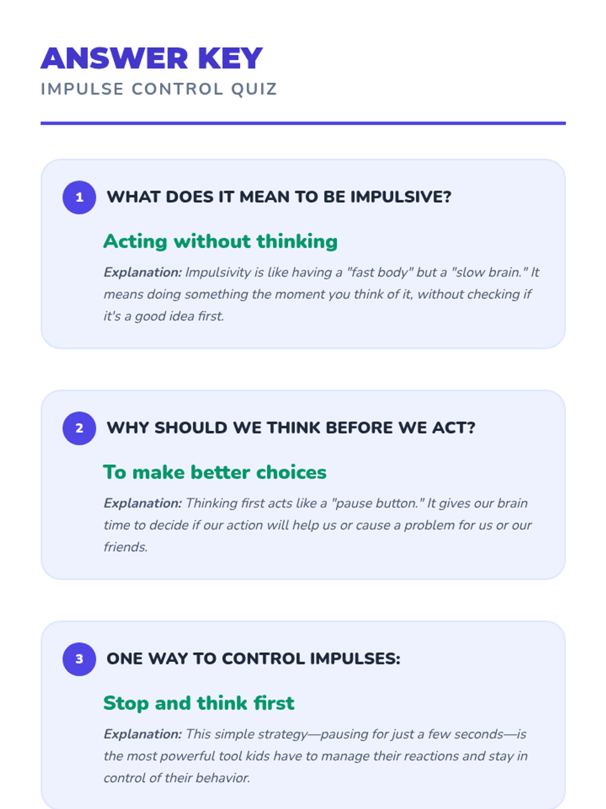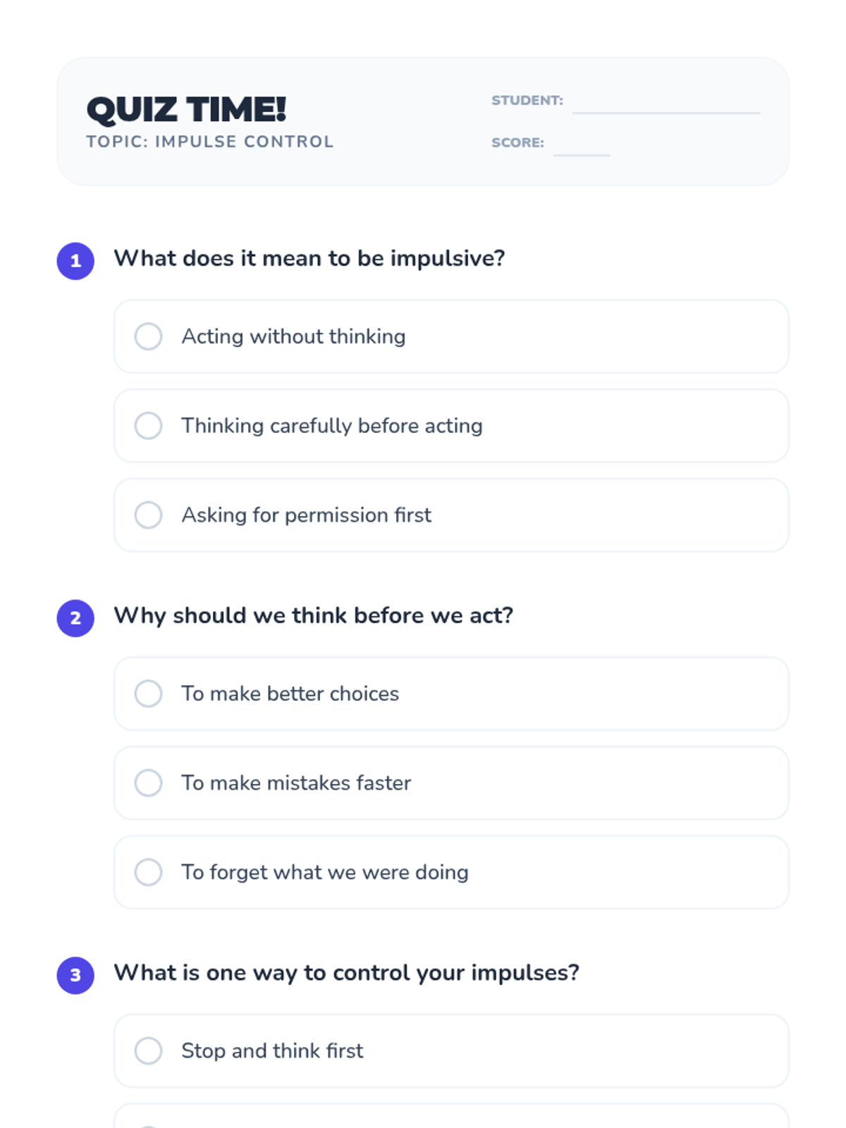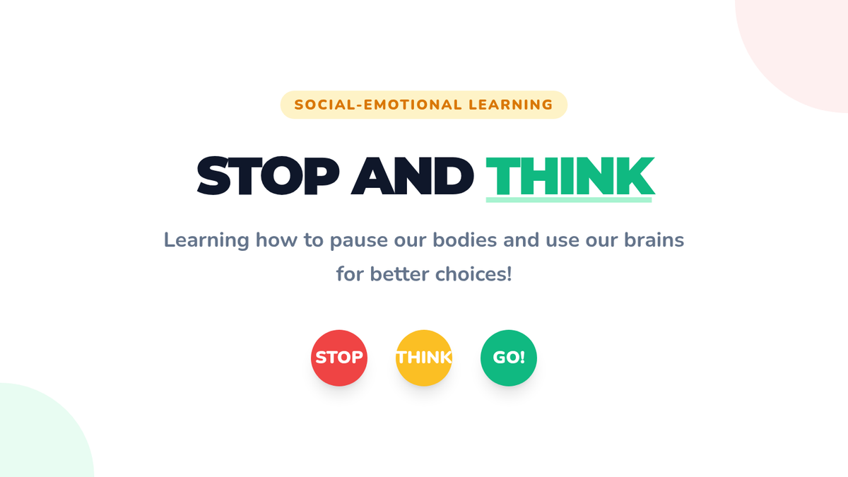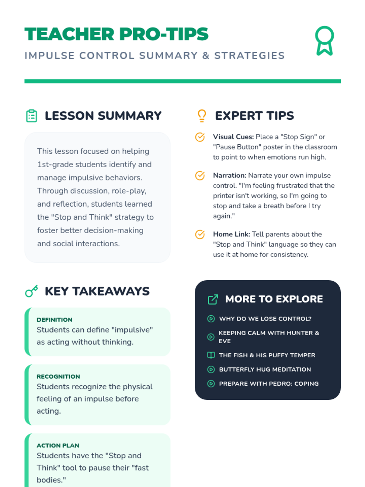 This lesson helps 1st-grade students identify impulsive behaviors and learn the 'Stop and Think' strategy through discussion, role-play, and creative activities. Students will explore how pausing before acting leads to better choices and stronger friendships.