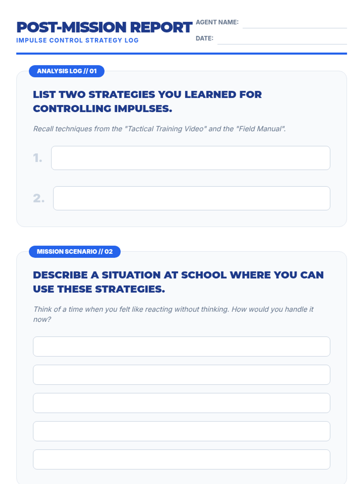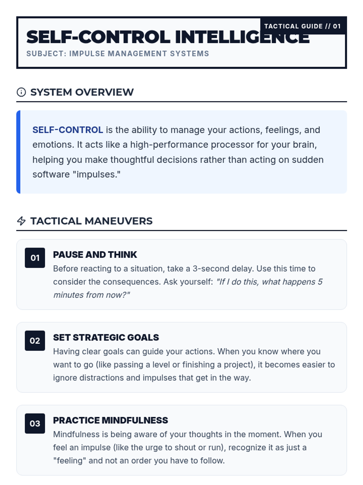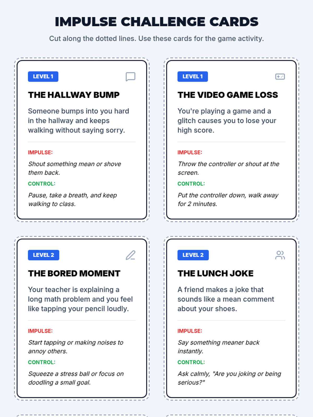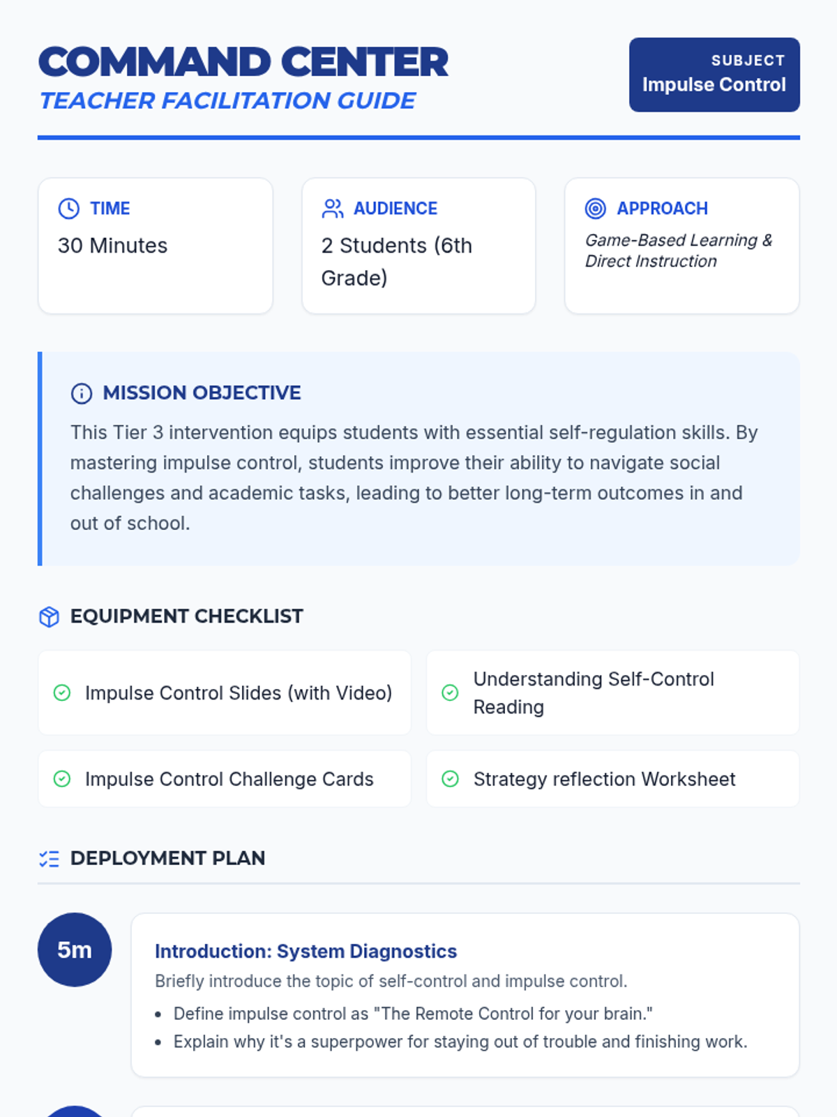 A Tier 3 intervention lesson for 6th-grade students focused on practical self-control and impulse management techniques through discussion, video, and games.