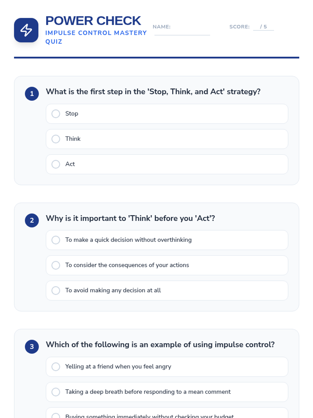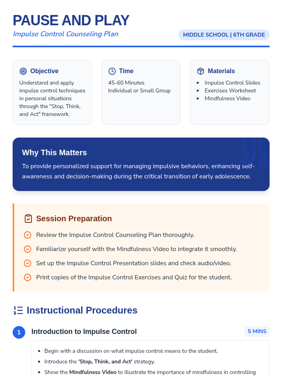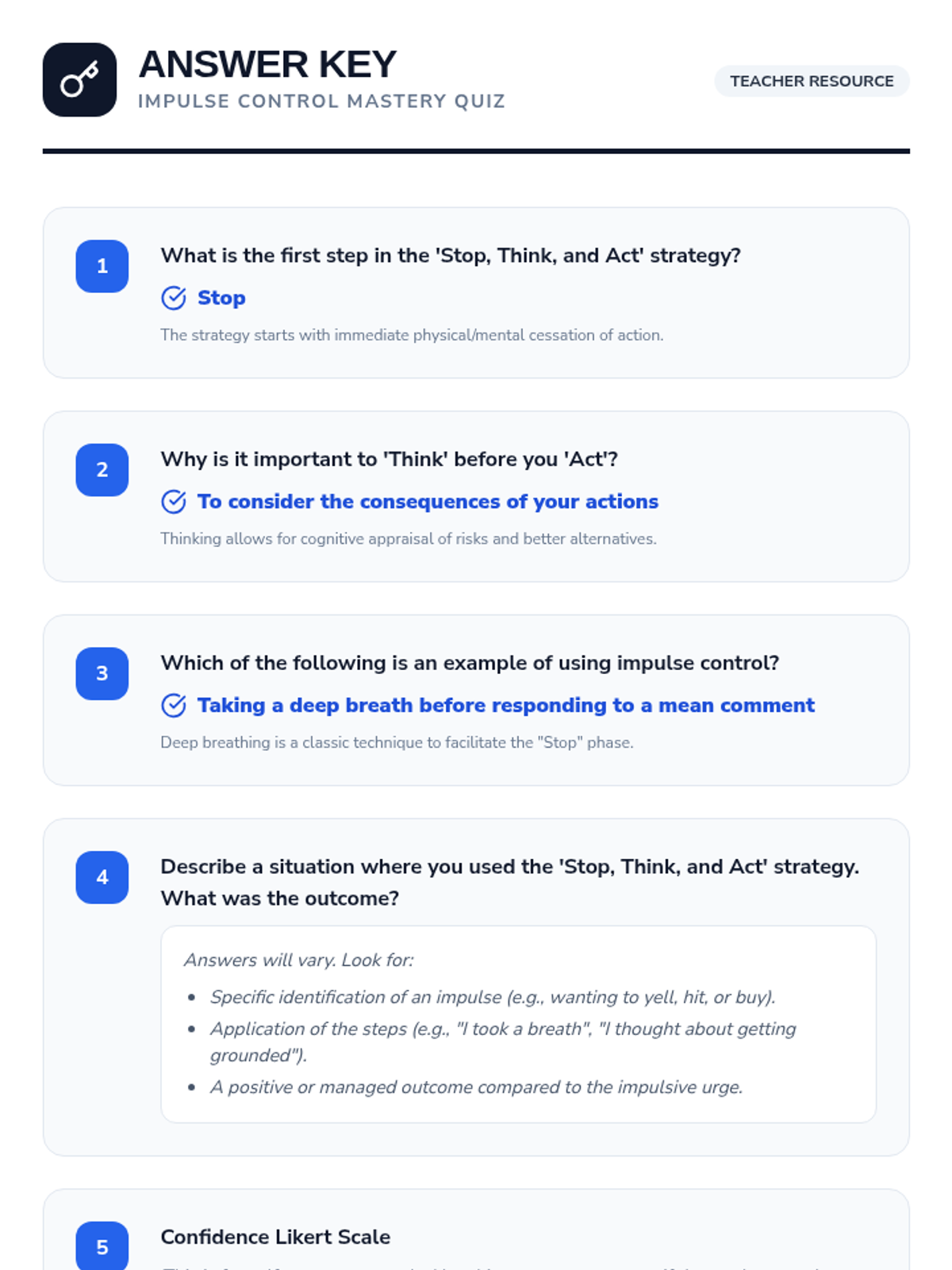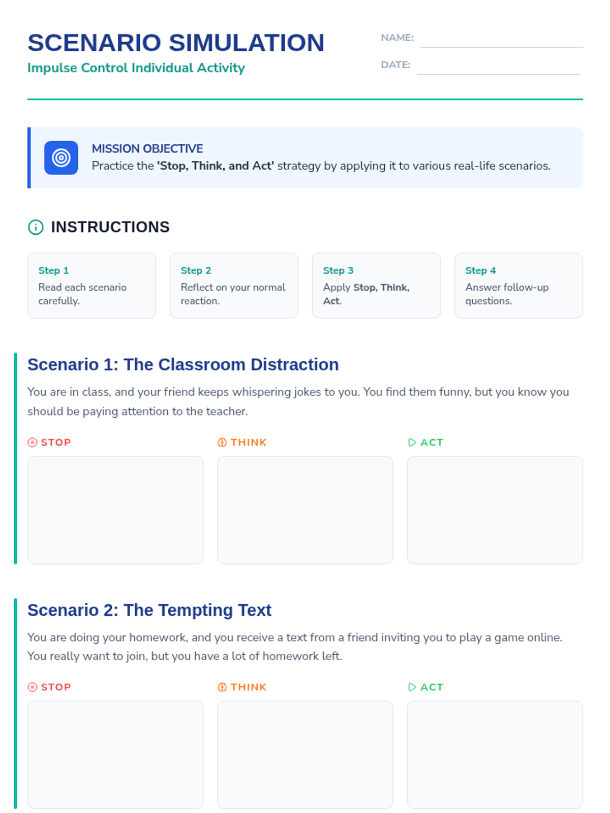 A comprehensive Social-Emotional Learning lesson designed for 6th graders to understand impulsive urges and master the 'Stop, Think, and Act' strategy for better decision-making.