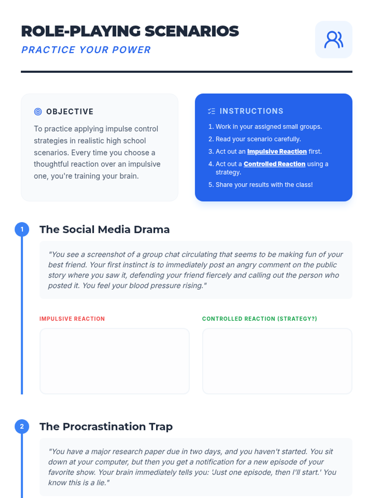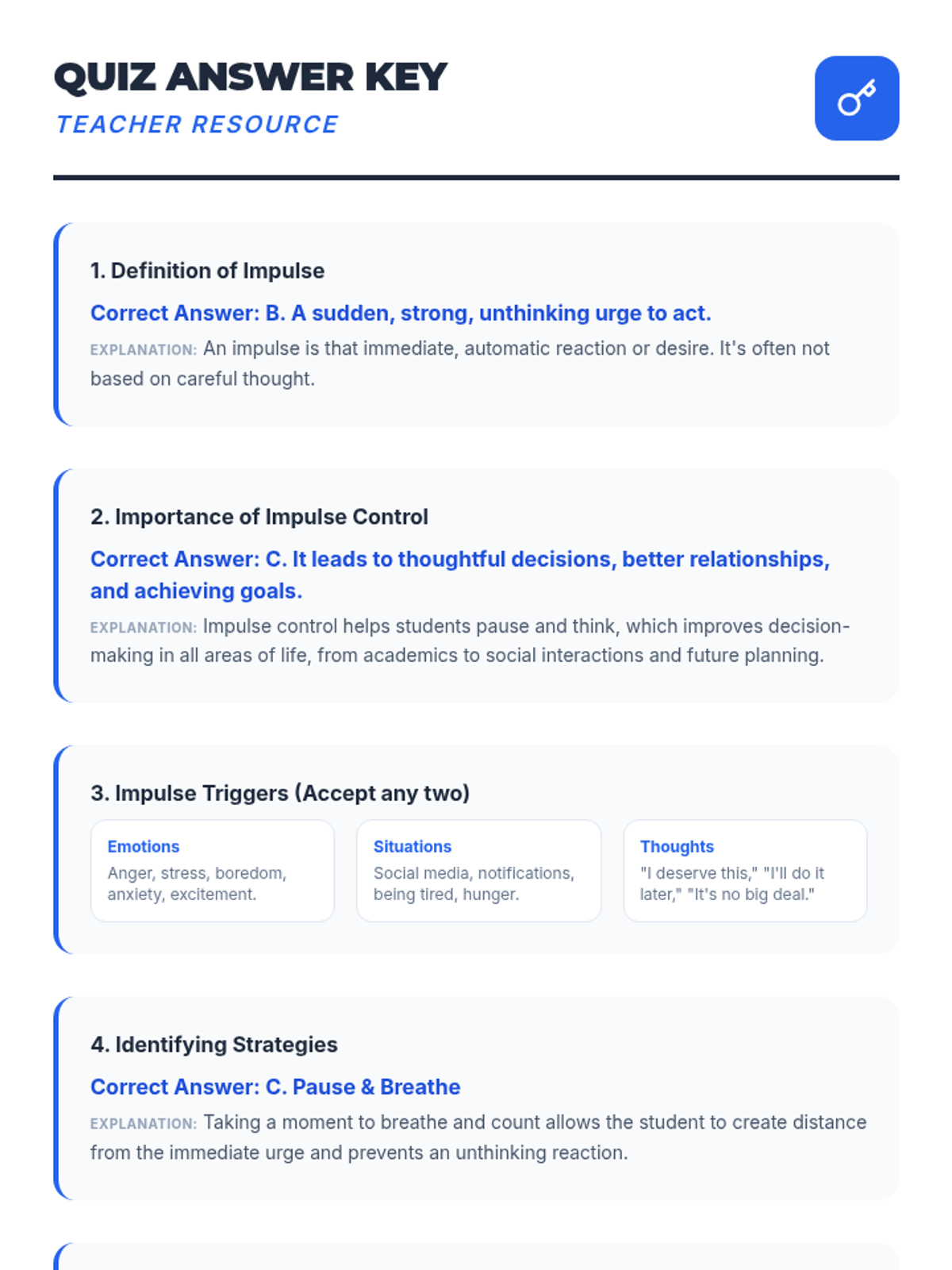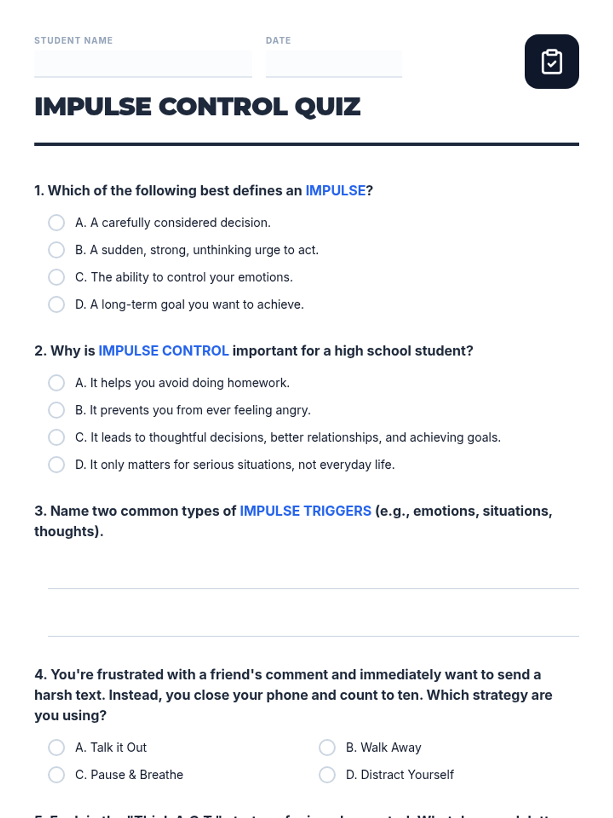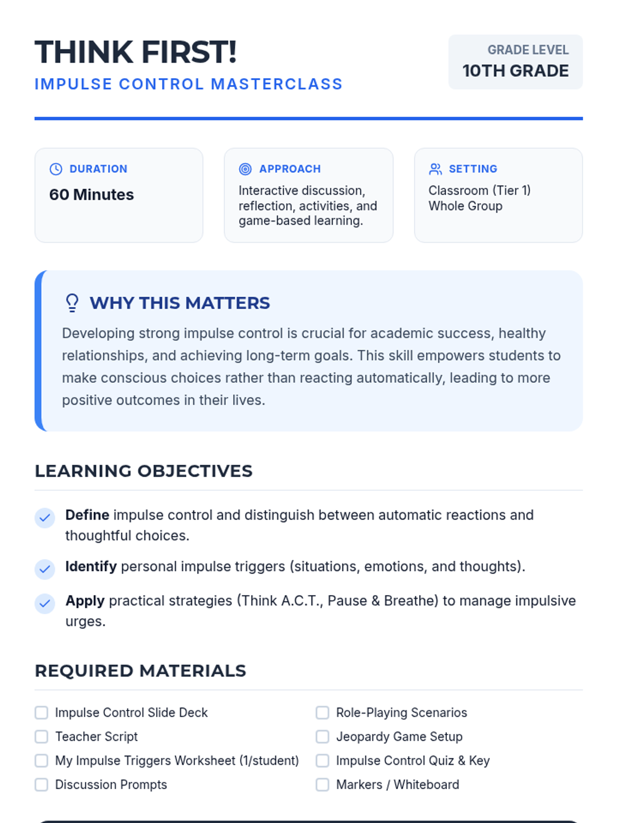 This interactive lesson empowers 10th-grade students to understand the mechanisms of impulse control, identify personal triggers, and apply practical strategies like Think A.C.T. to make more thoughtful, long-term decisions.