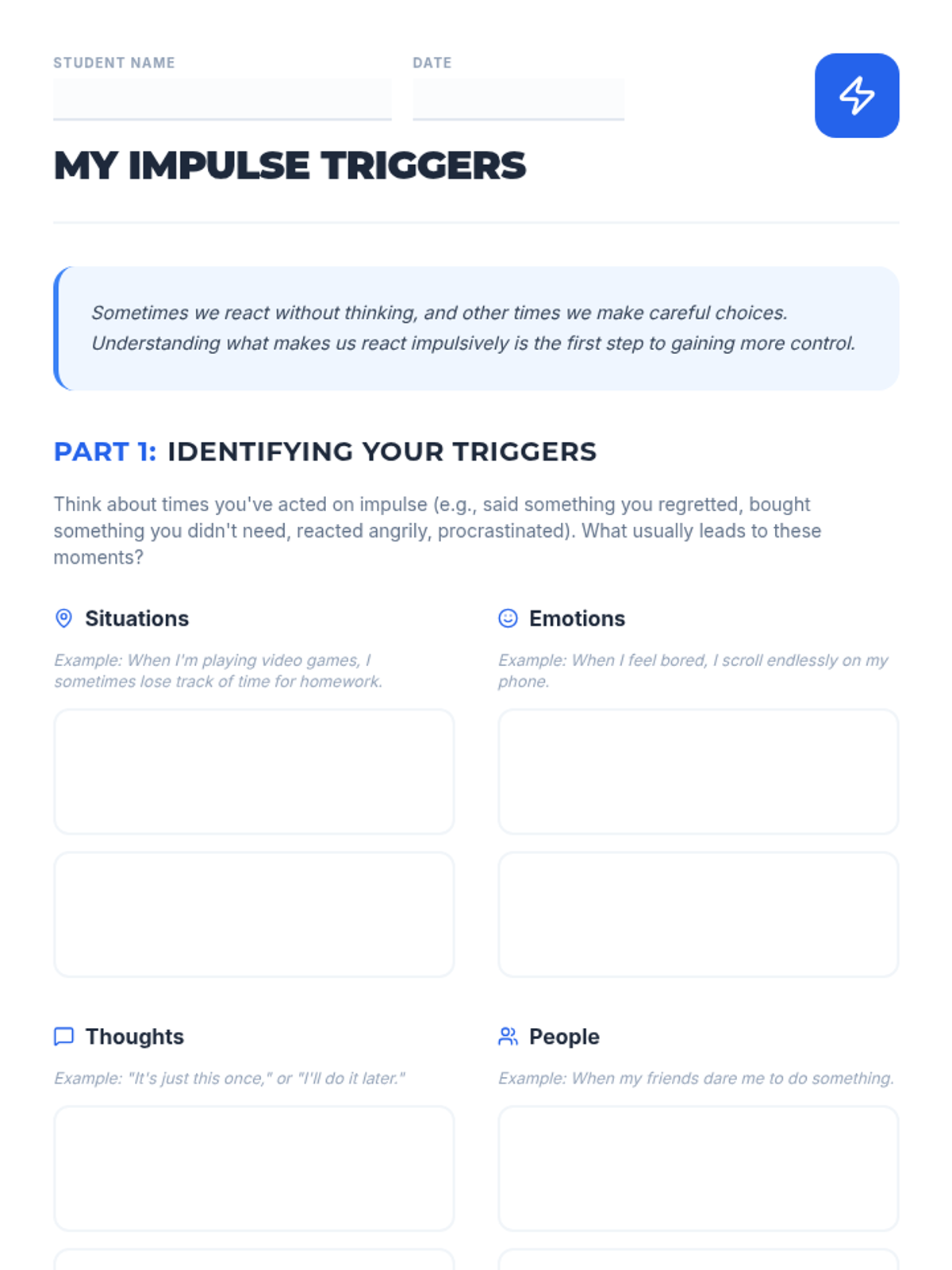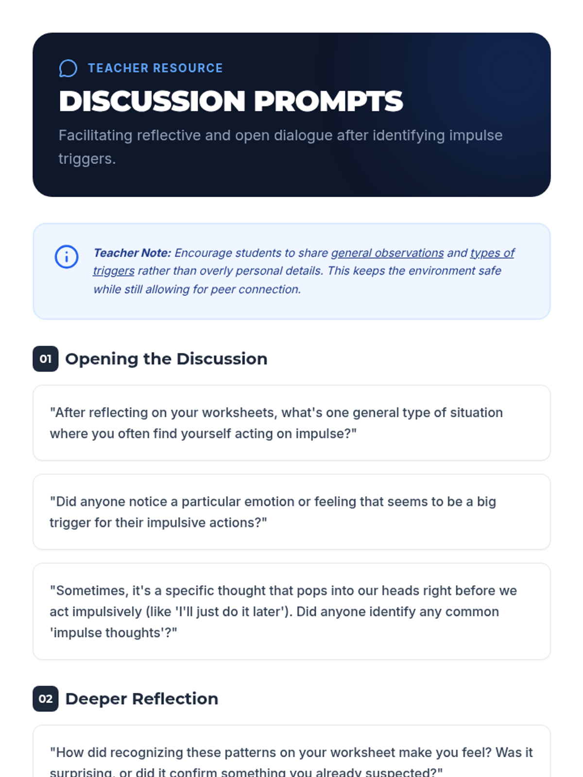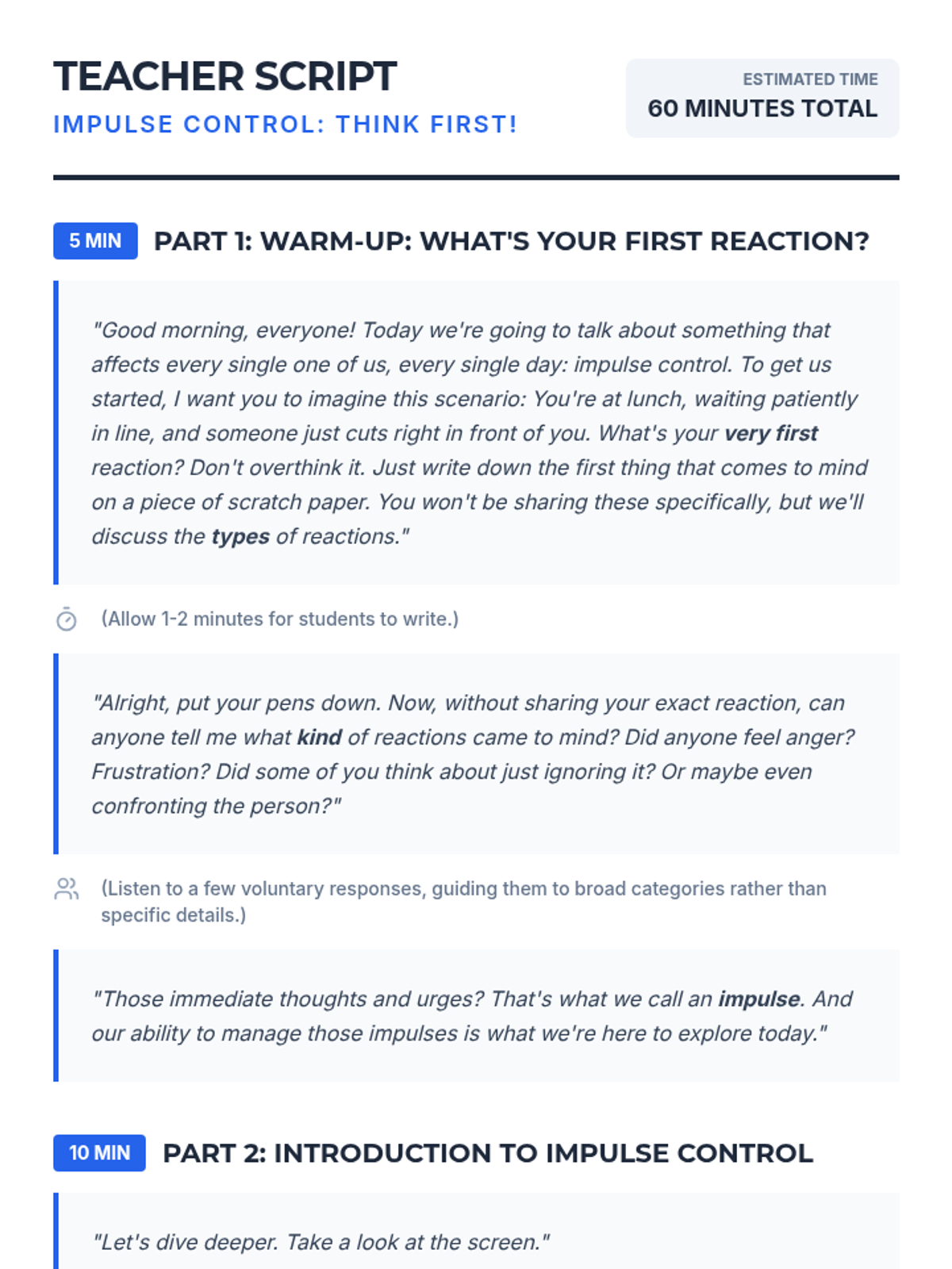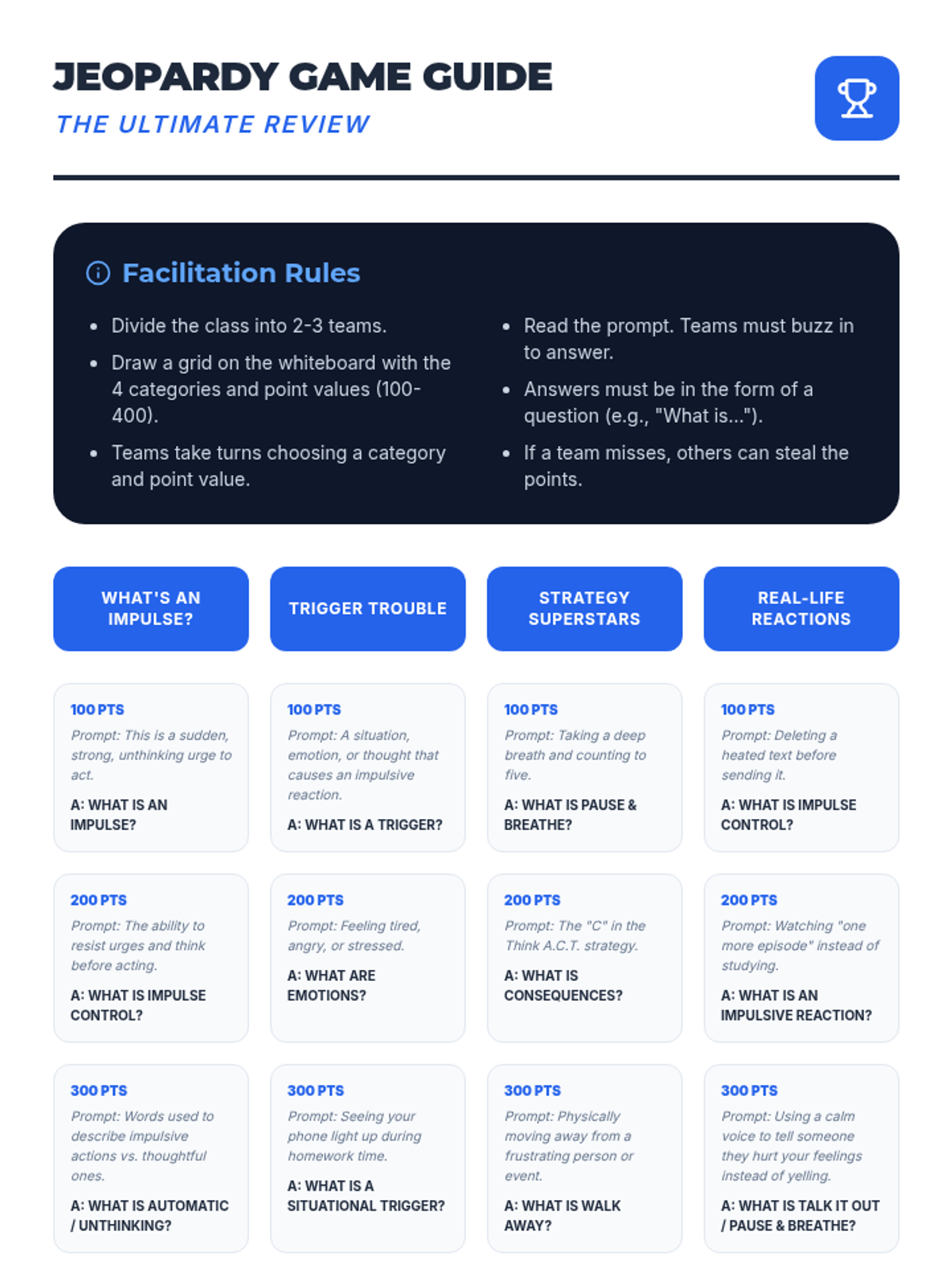 This interactive lesson empowers 10th-grade students to understand the mechanisms of impulse control, identify personal triggers, and apply practical strategies like Think A.C.T. to make more thoughtful, long-term decisions.