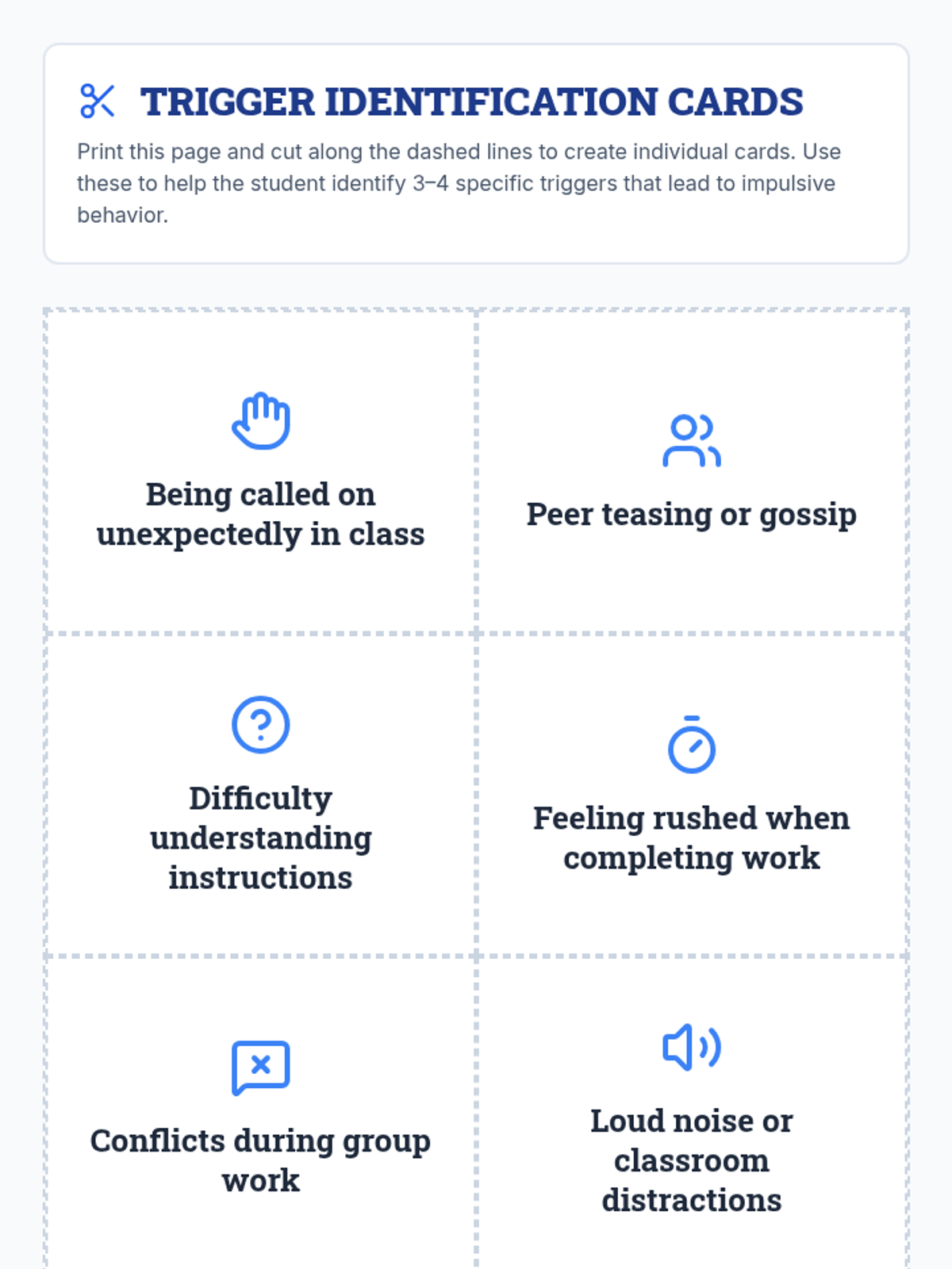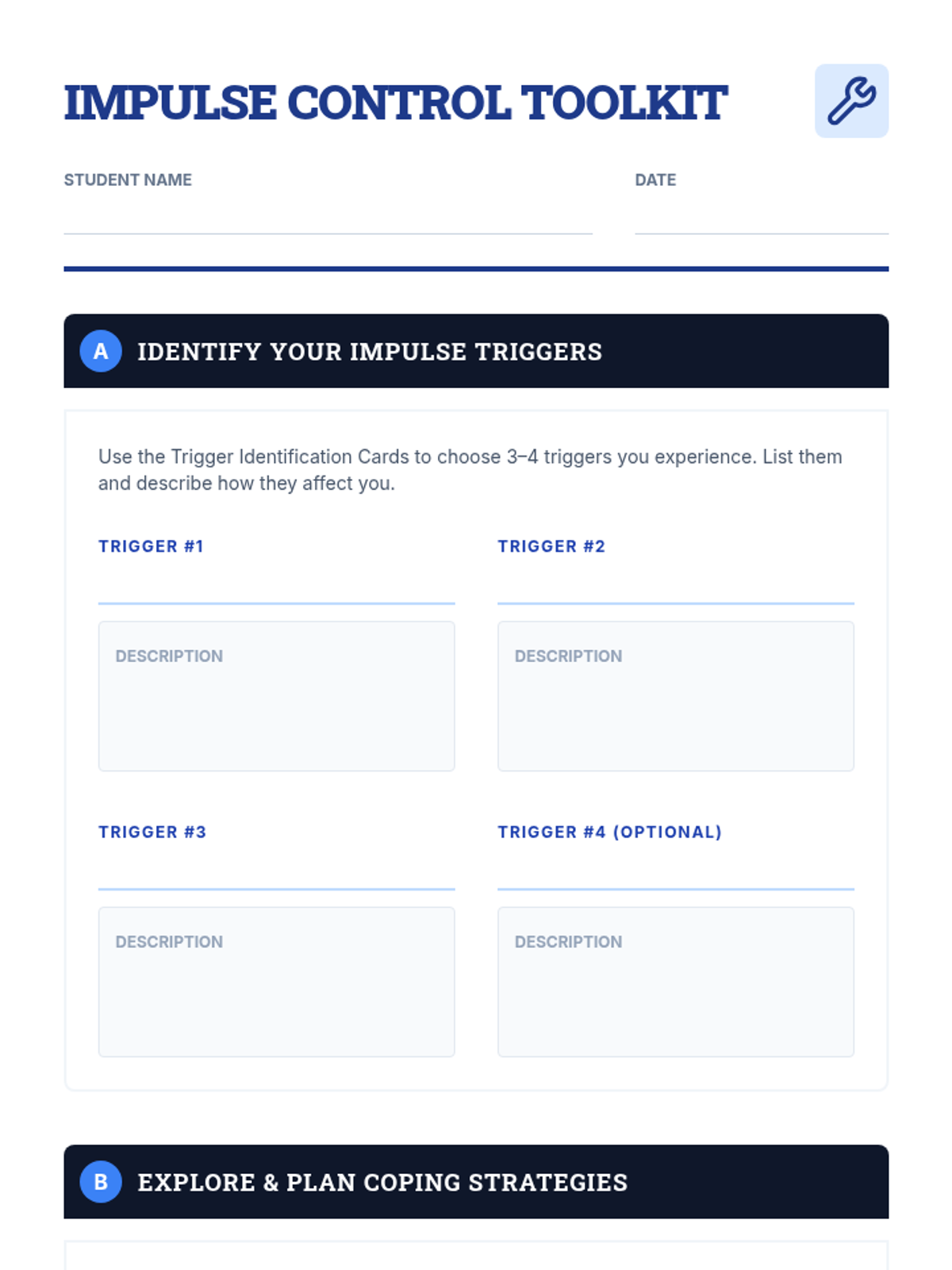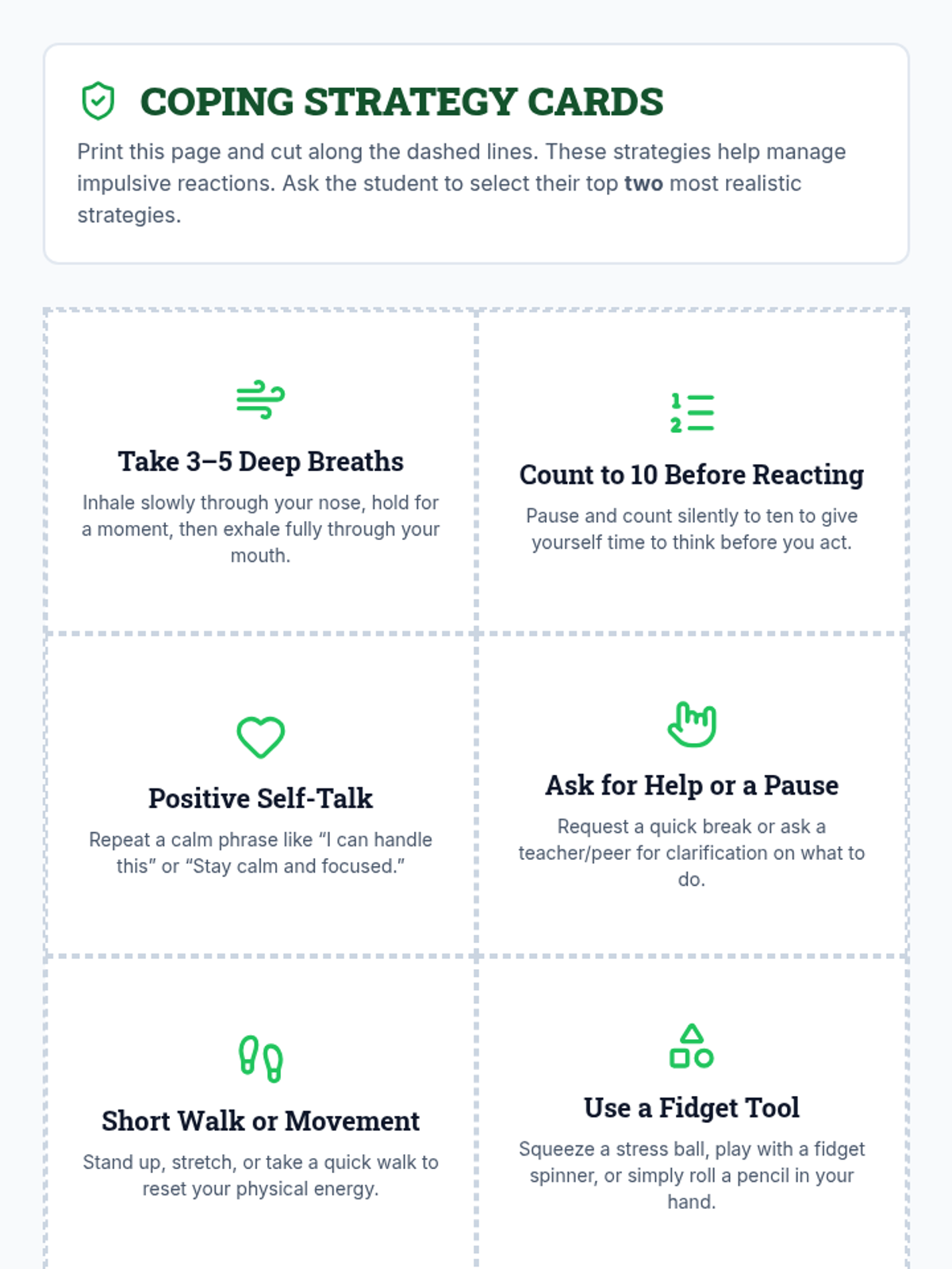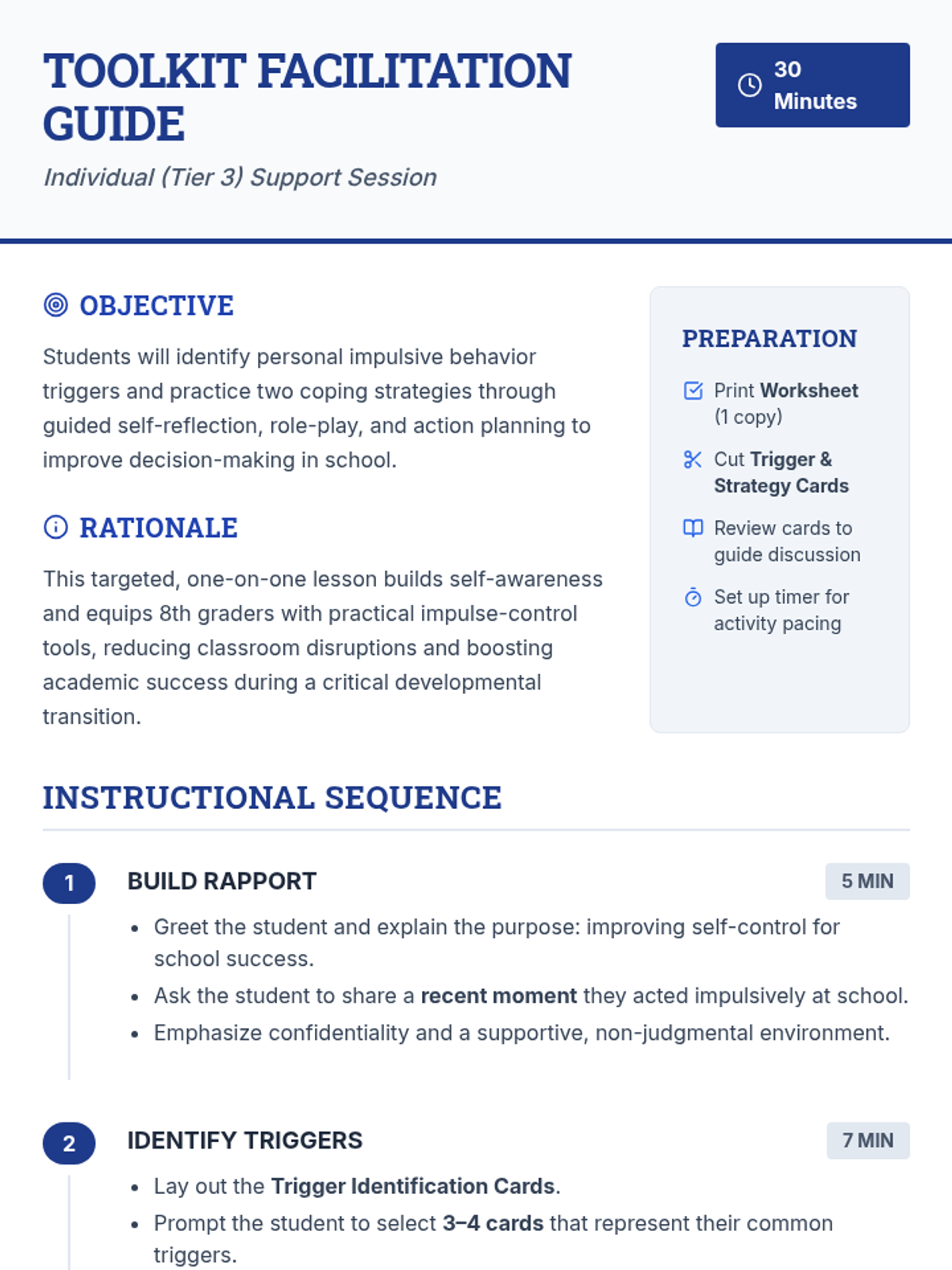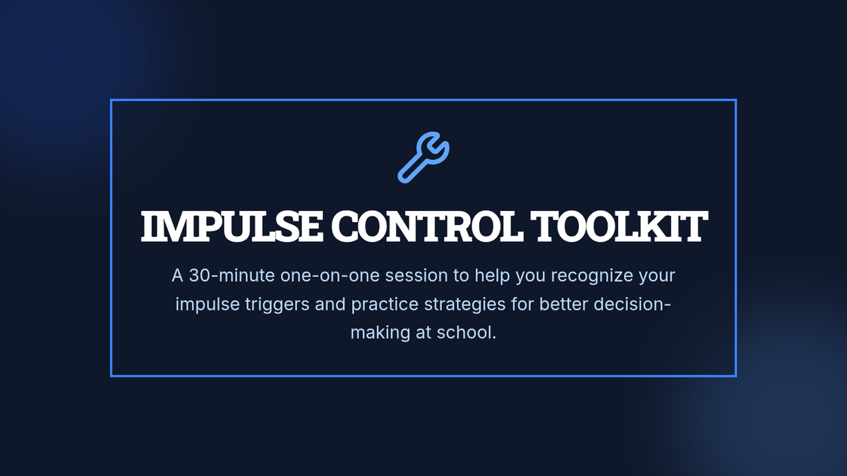 A 30-minute, one-on-one session for 8th graders to identify triggers and practice impulse control strategies.