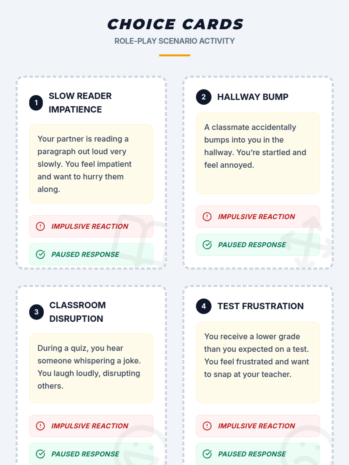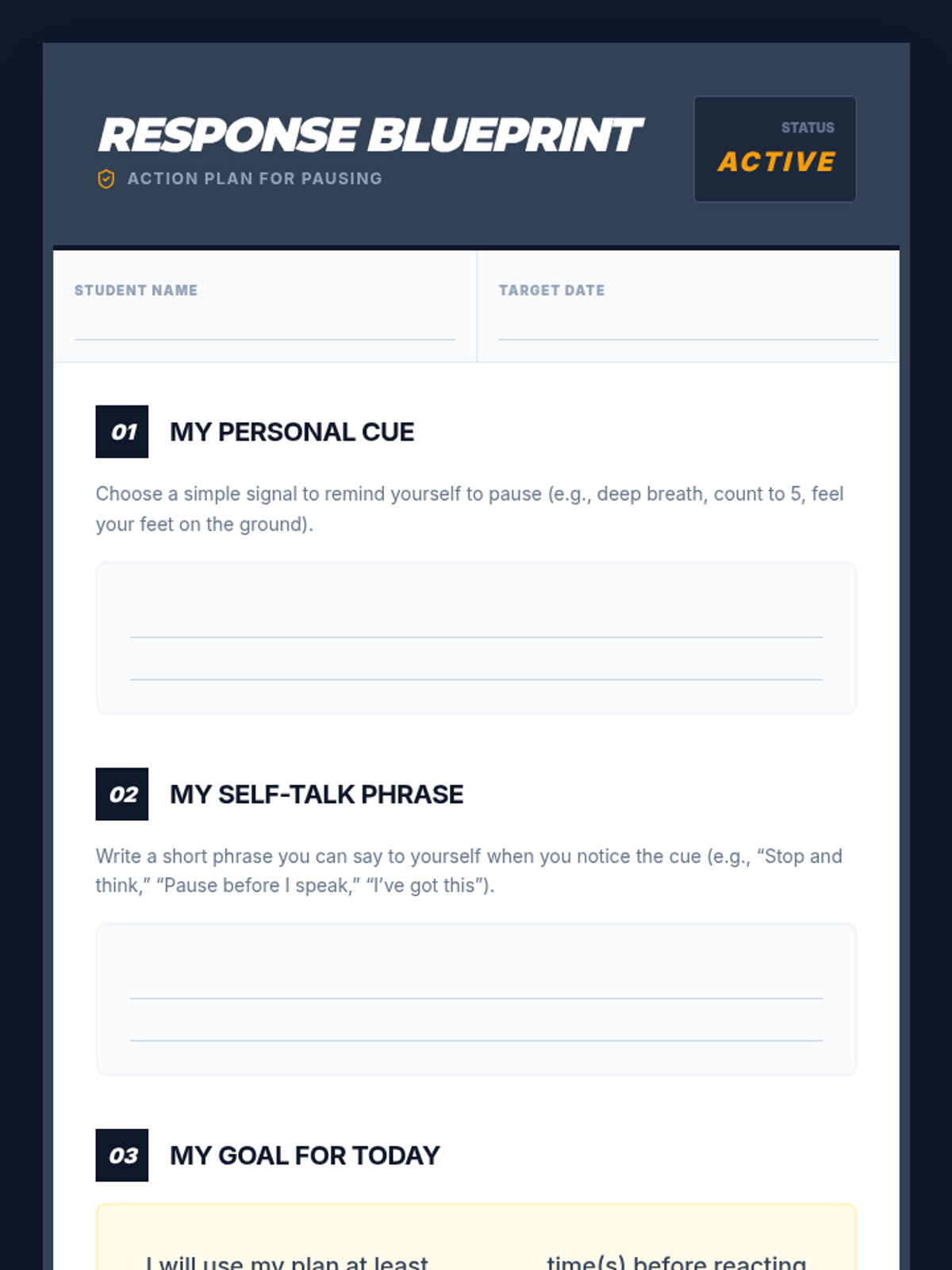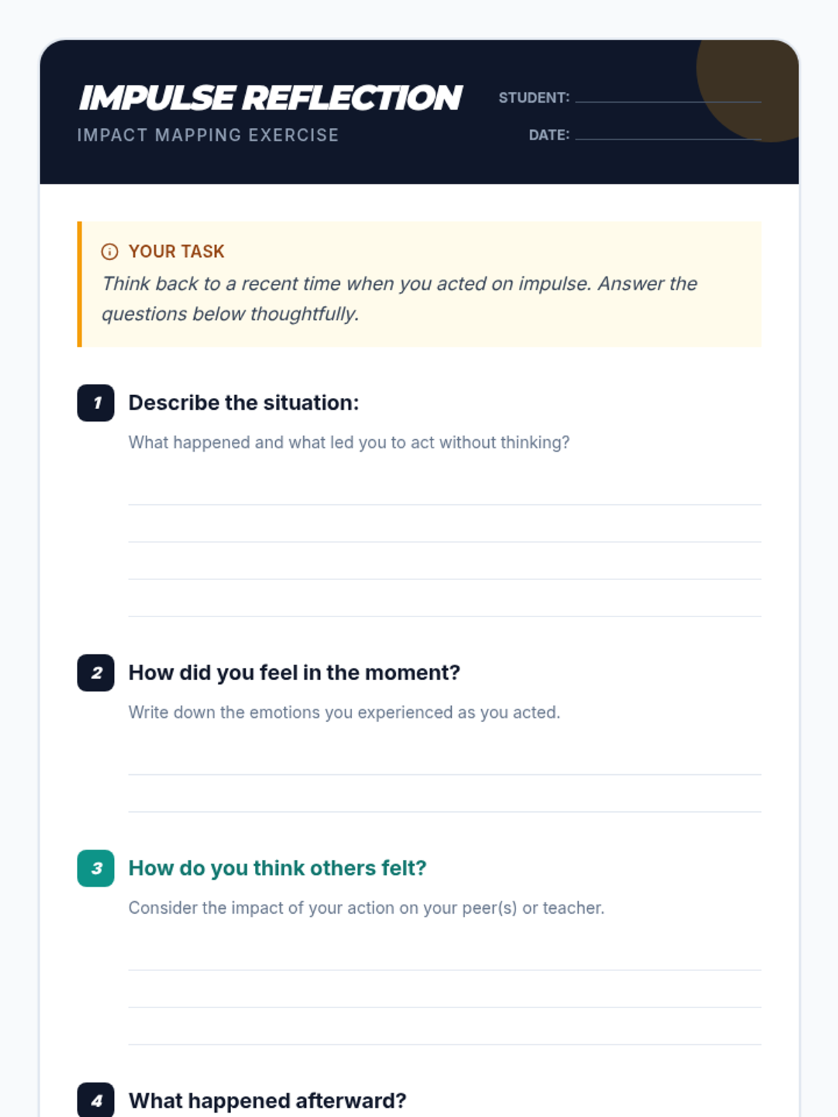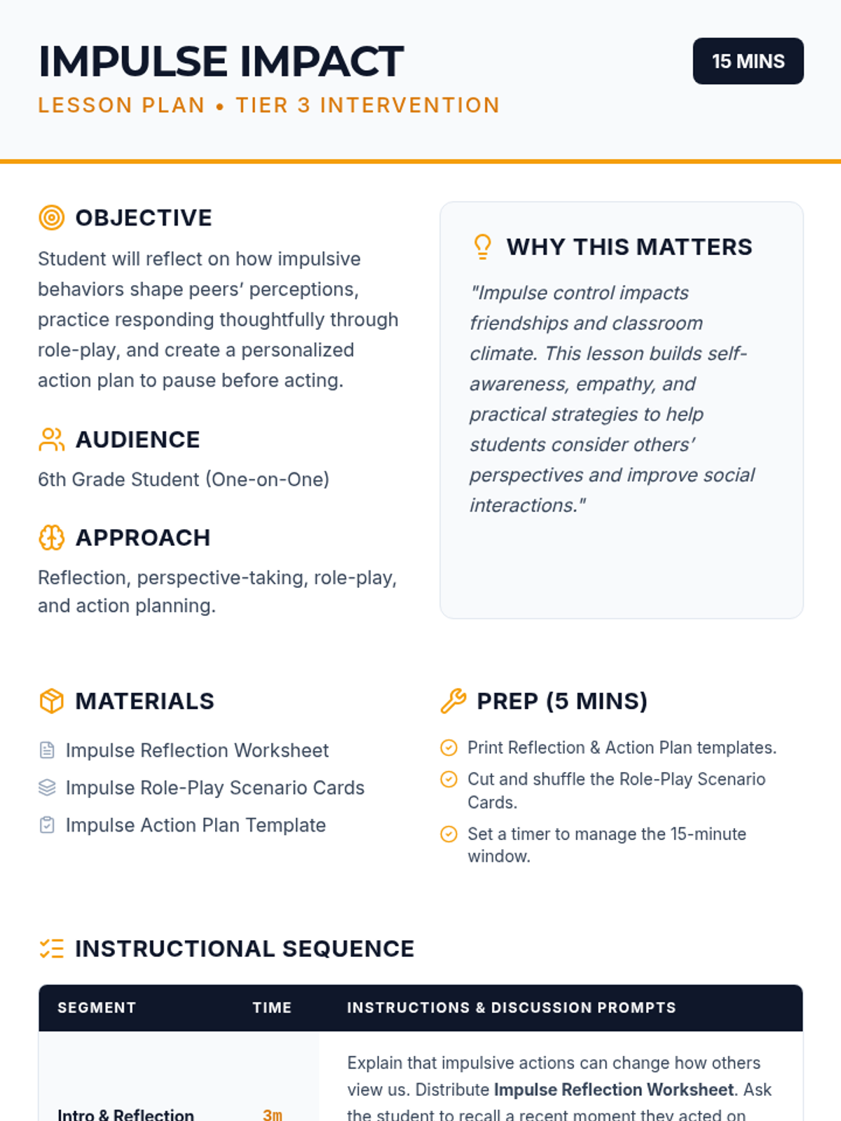 A 15-minute, one-on-one Tier 3 session helping students understand how impulsive actions affect others and developing a personalized strategy to pause and reflect before responding.