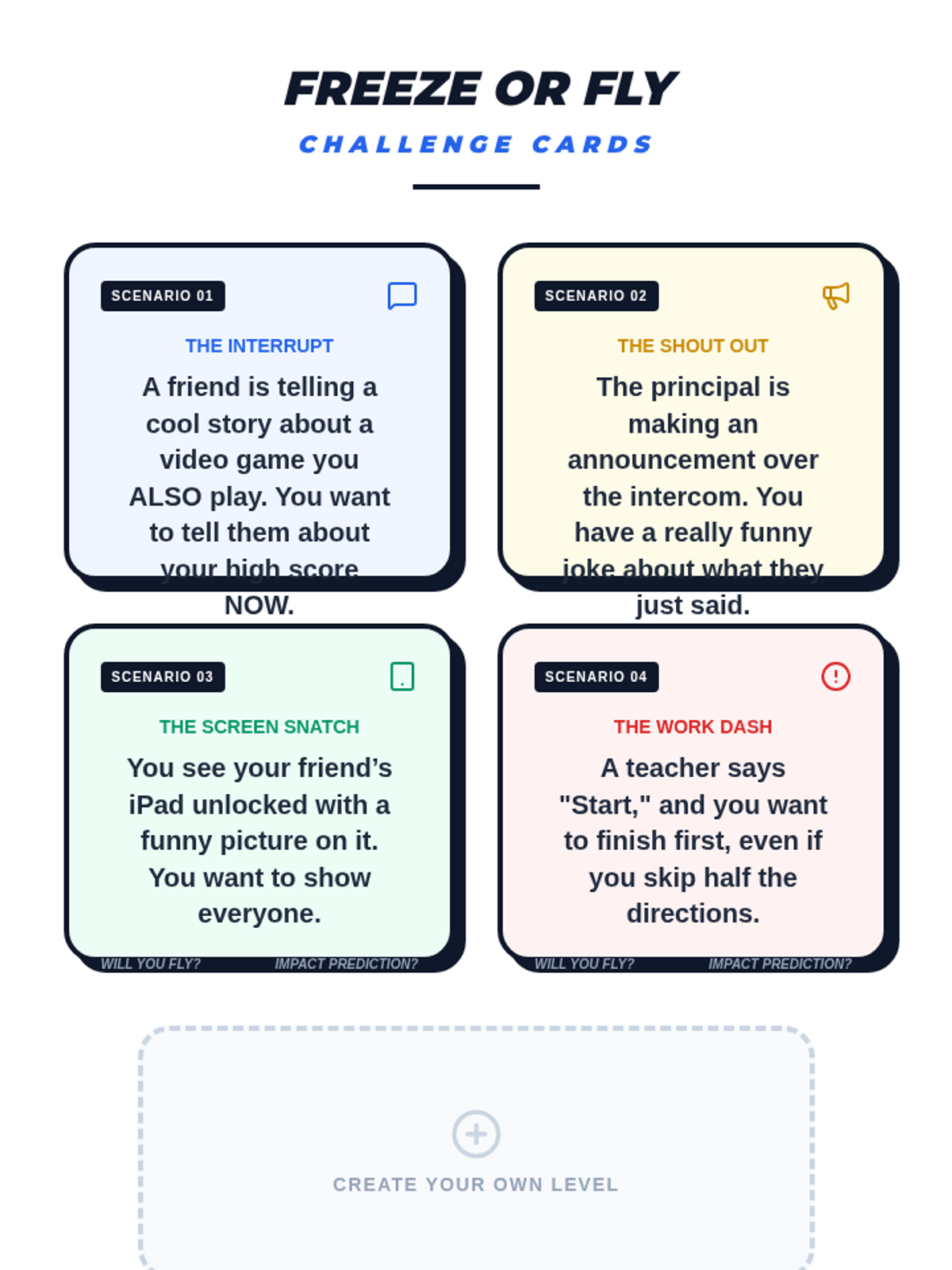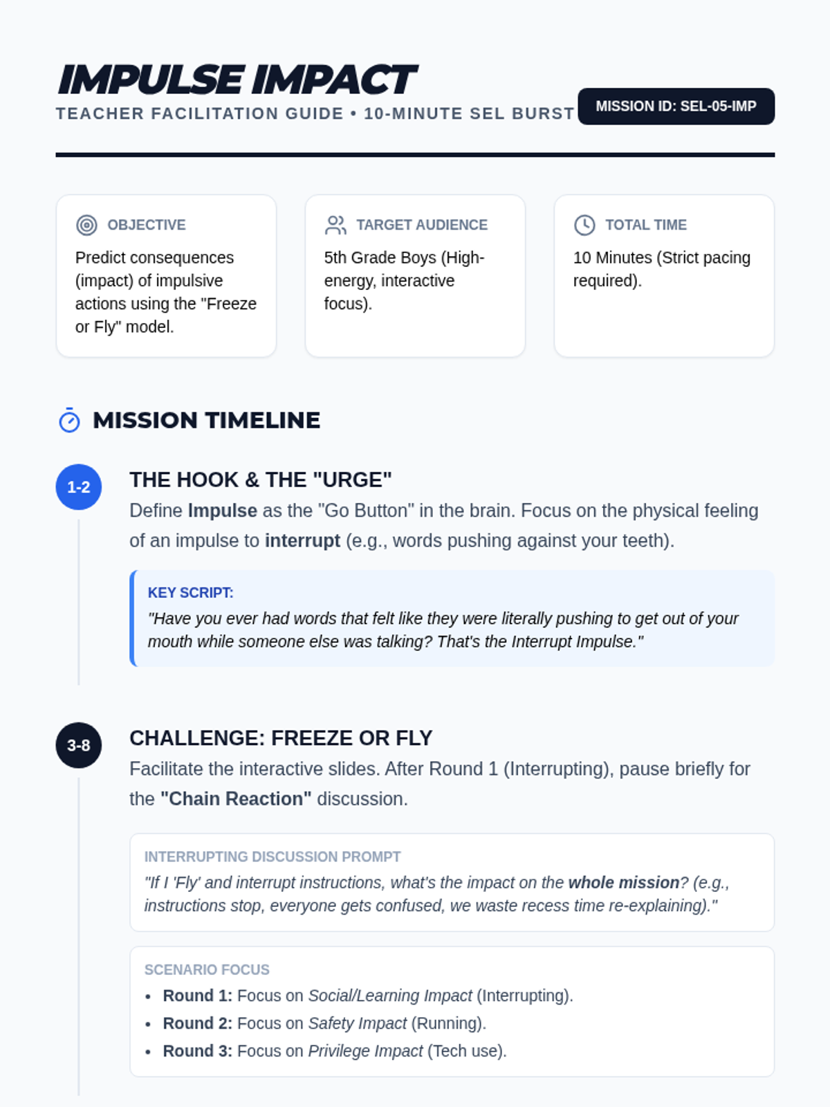 A fast-paced, 10-minute SEL burst designed for 5th-grade boys to identify impulsive urges and predict their consequences through a "Freeze or Fly" challenge.