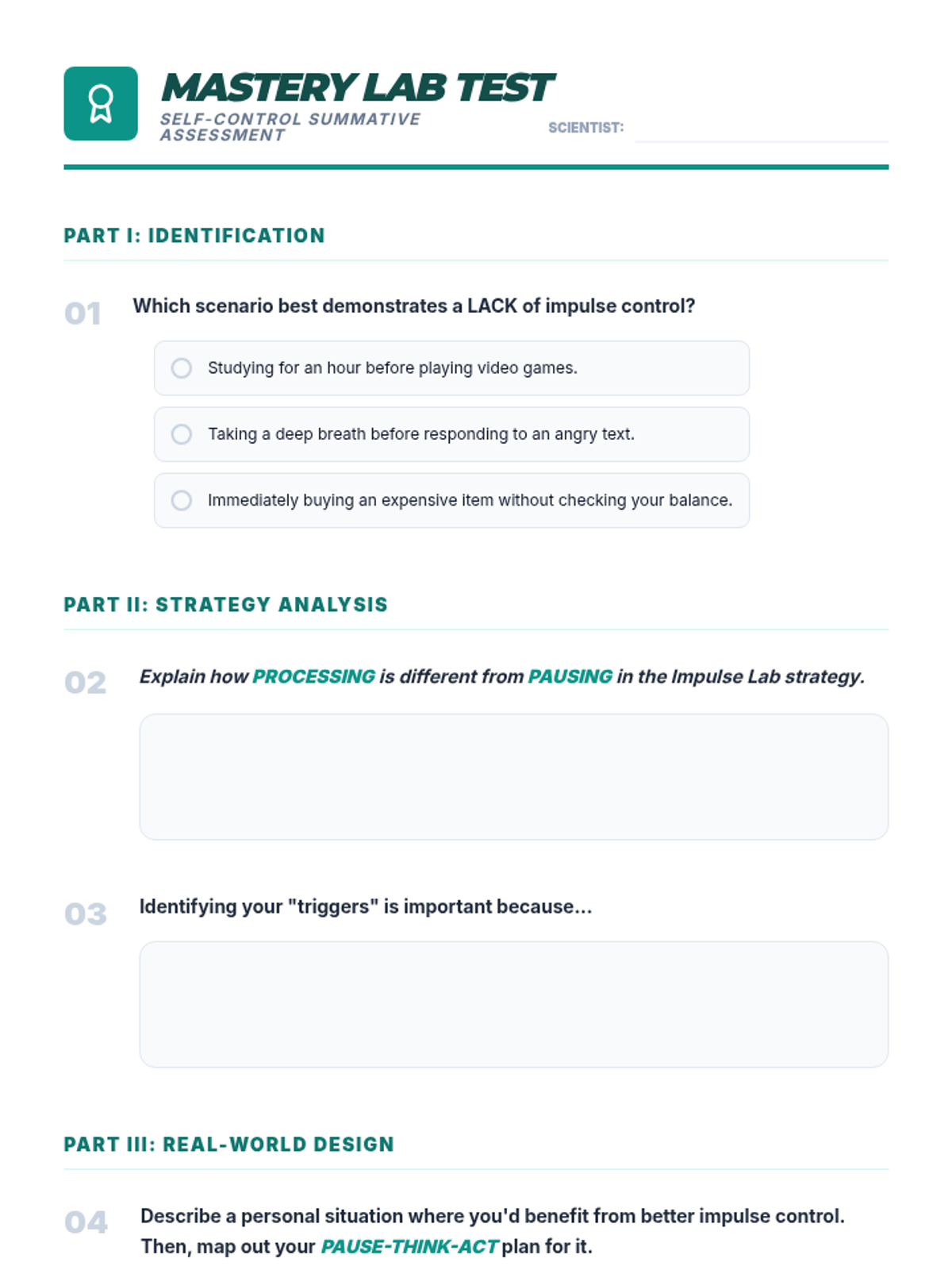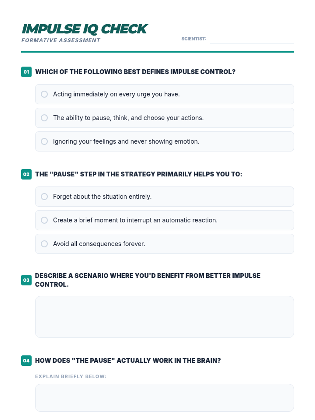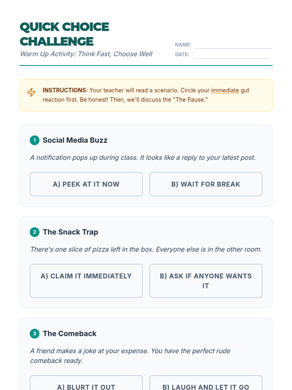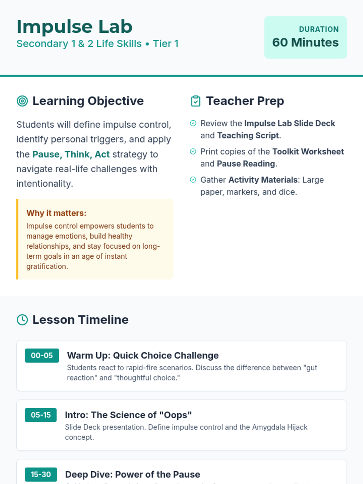 A comprehensive 60-minute lesson designed for Secondary 1 and 2 students to develop impulse control through the 'Pause, Think, Act' framework. Includes interactive discussions, hands-on activities, and personal reflection tools.