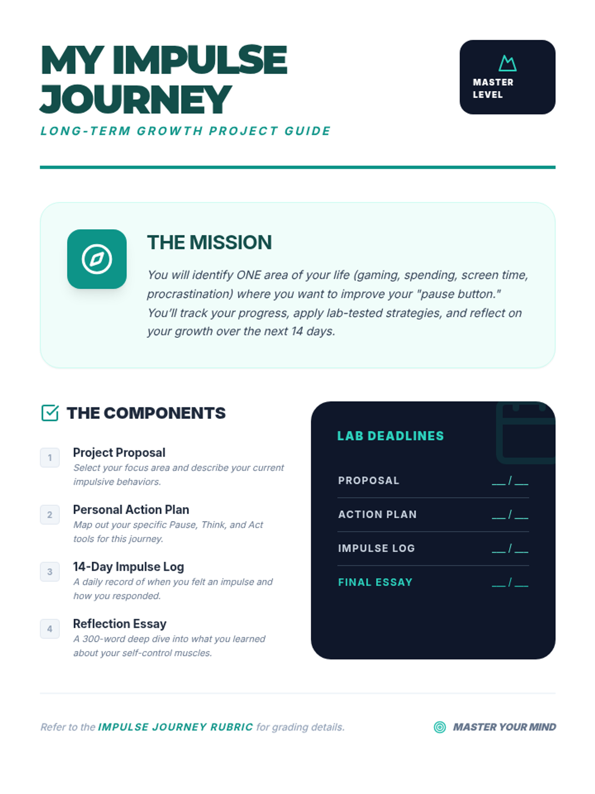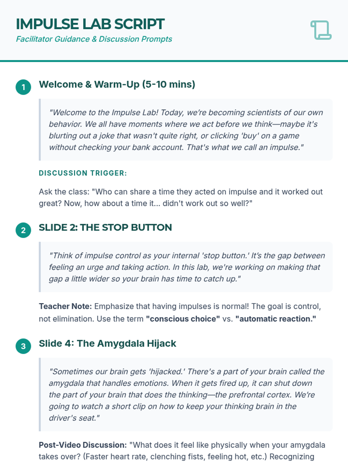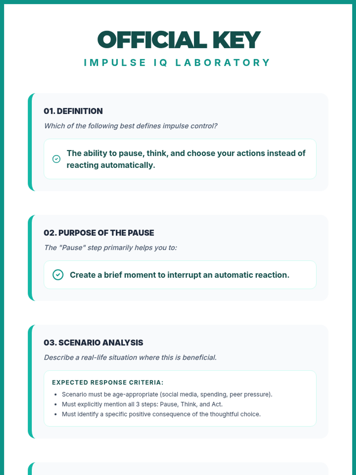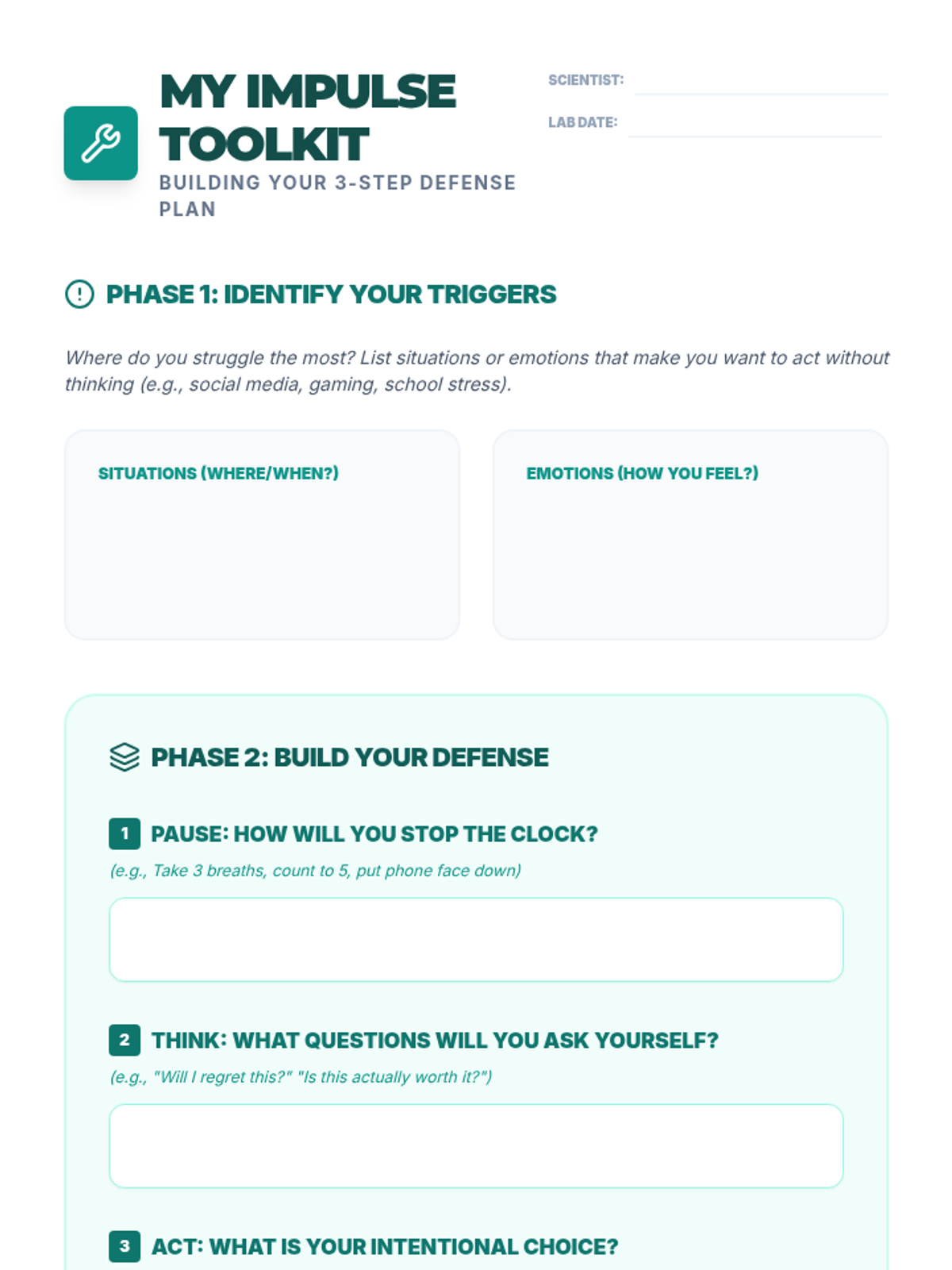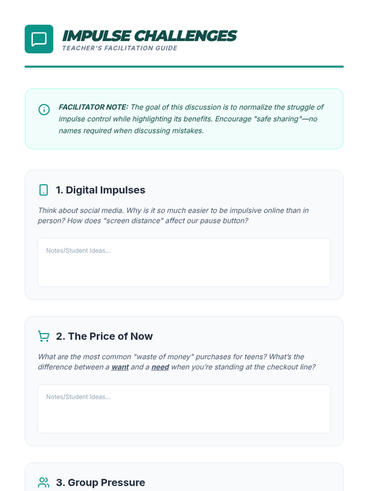 A comprehensive 60-minute lesson designed for Secondary 1 and 2 students to develop impulse control through the 'Pause, Think, Act' framework. Includes interactive discussions, hands-on activities, and personal reflection tools.