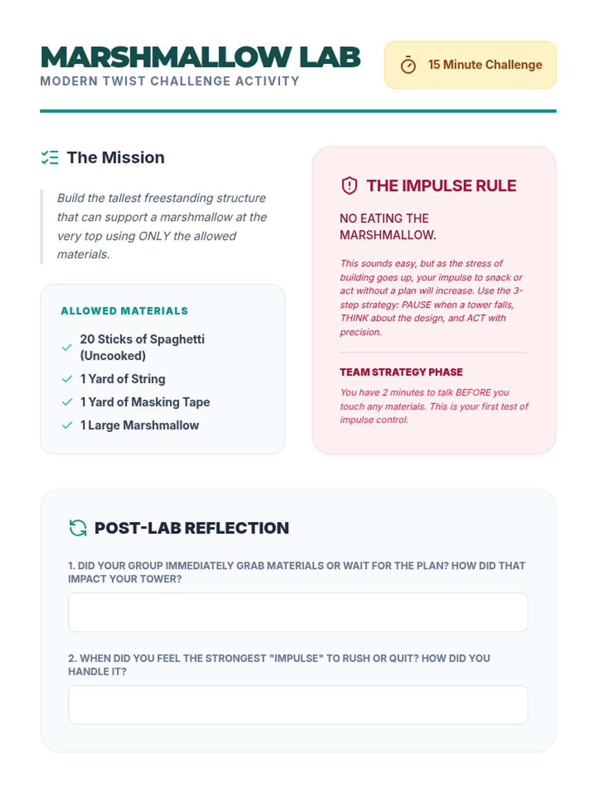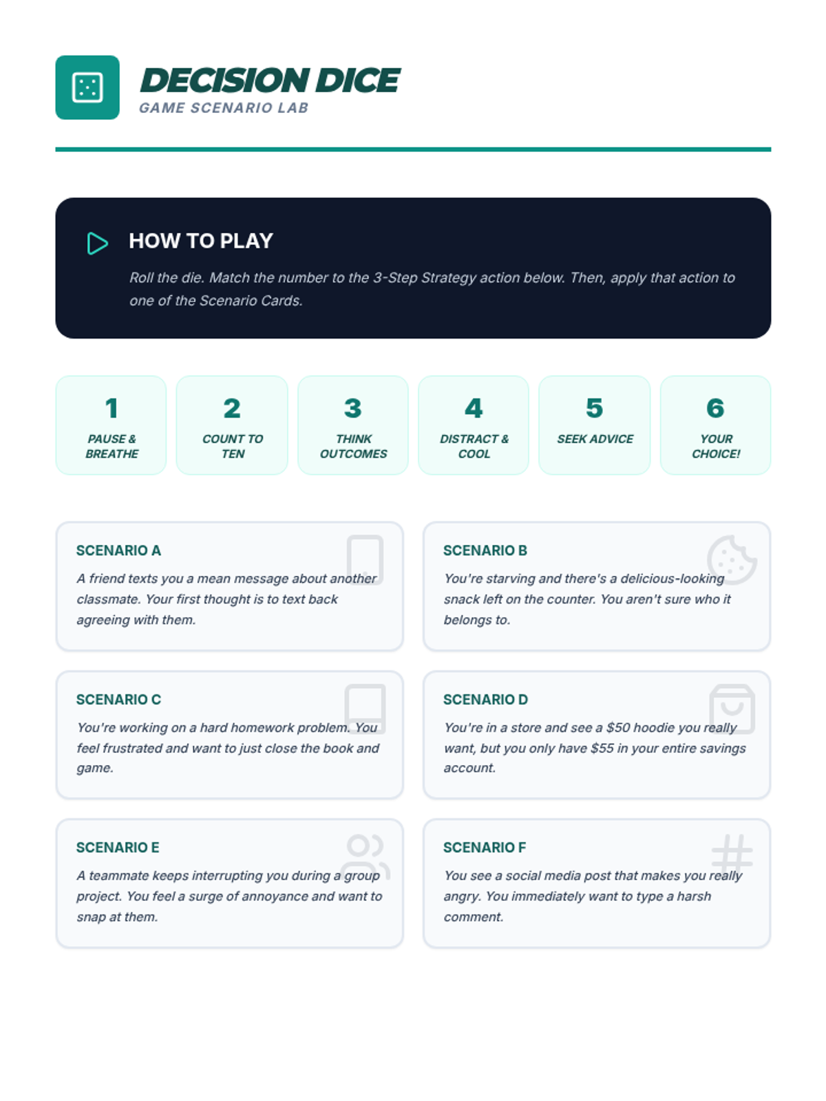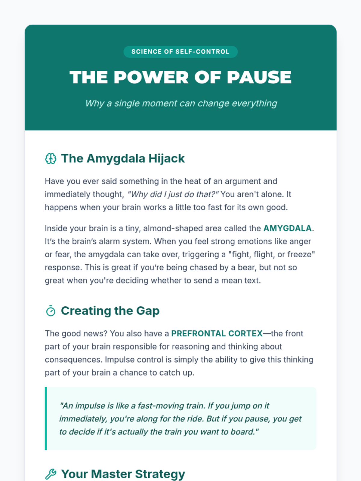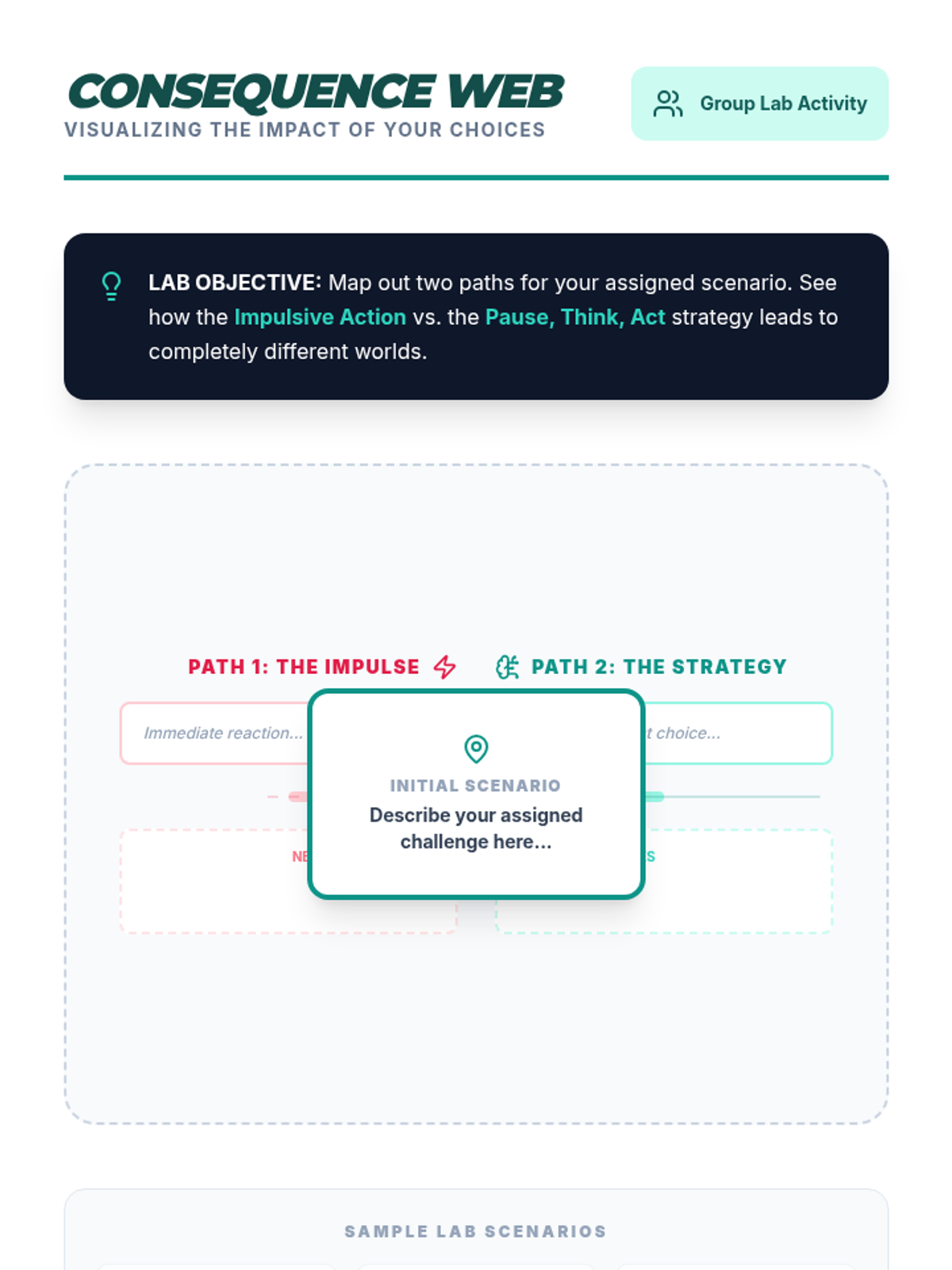 A comprehensive 60-minute lesson designed for Secondary 1 and 2 students to develop impulse control through the 'Pause, Think, Act' framework. Includes interactive discussions, hands-on activities, and personal reflection tools.