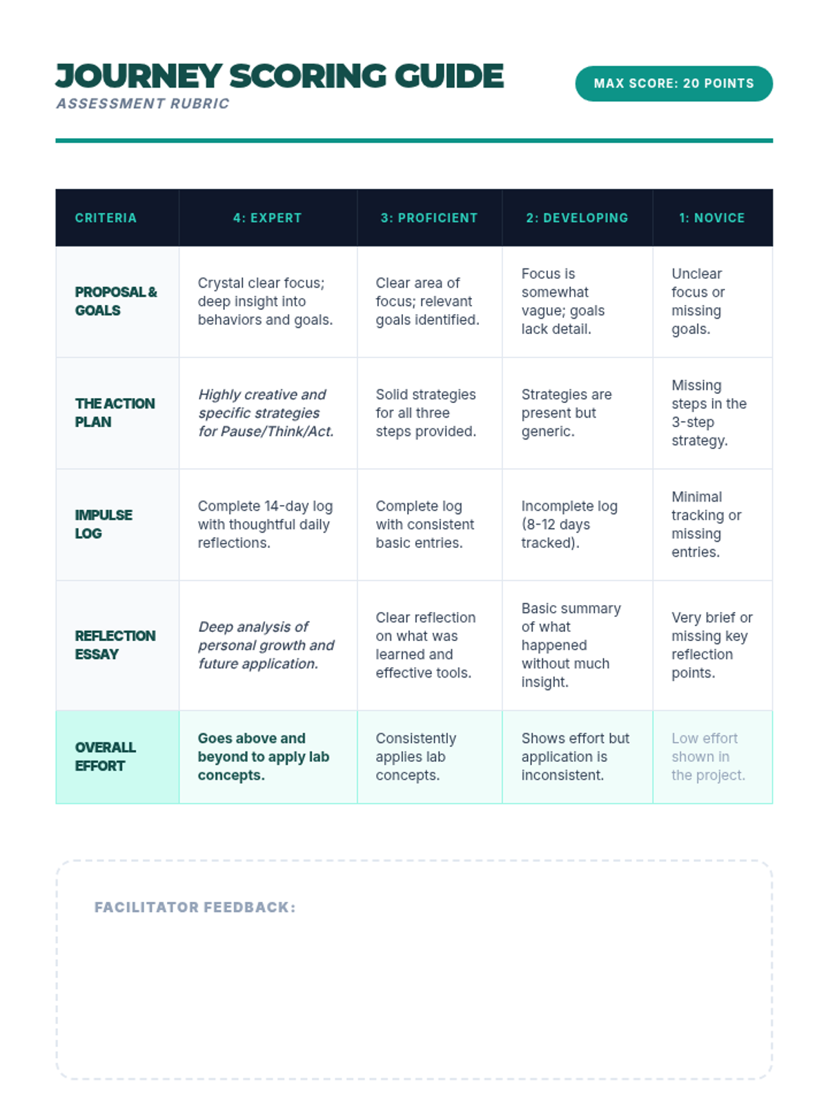 A final reflection on the 8-week journey. Students map out how they will carry their authentic 'blueprint' into their future goals and relationships.