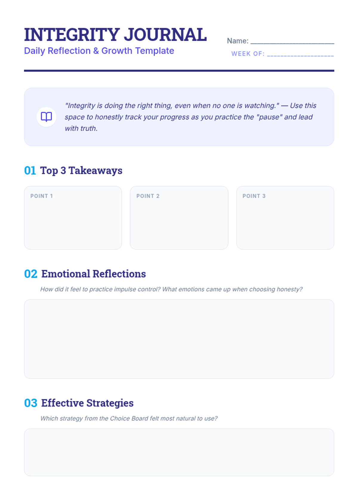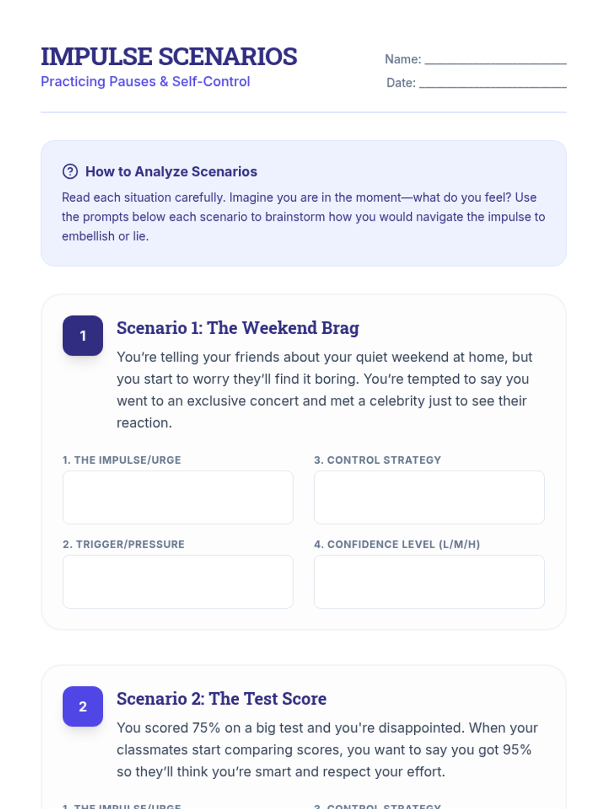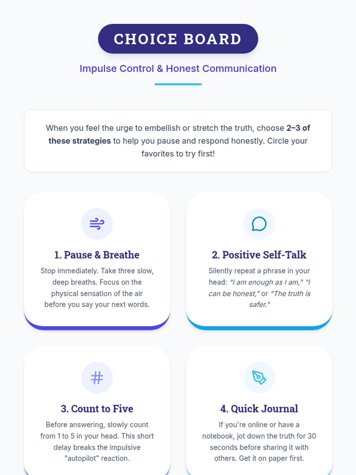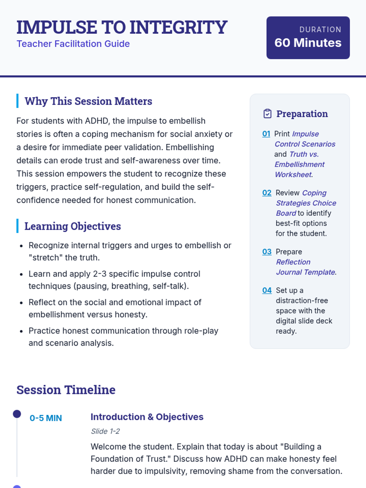 A 60-minute individual Tier 3 session for 11th graders with ADHD focused on mastering impulse control and practicing honest communication to build trust and integrity.