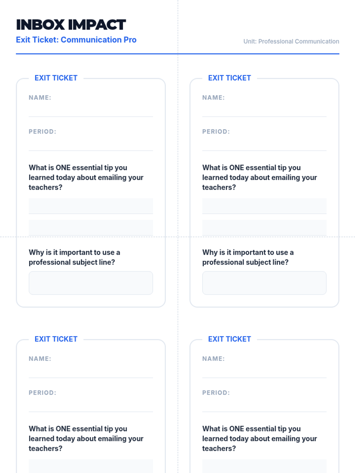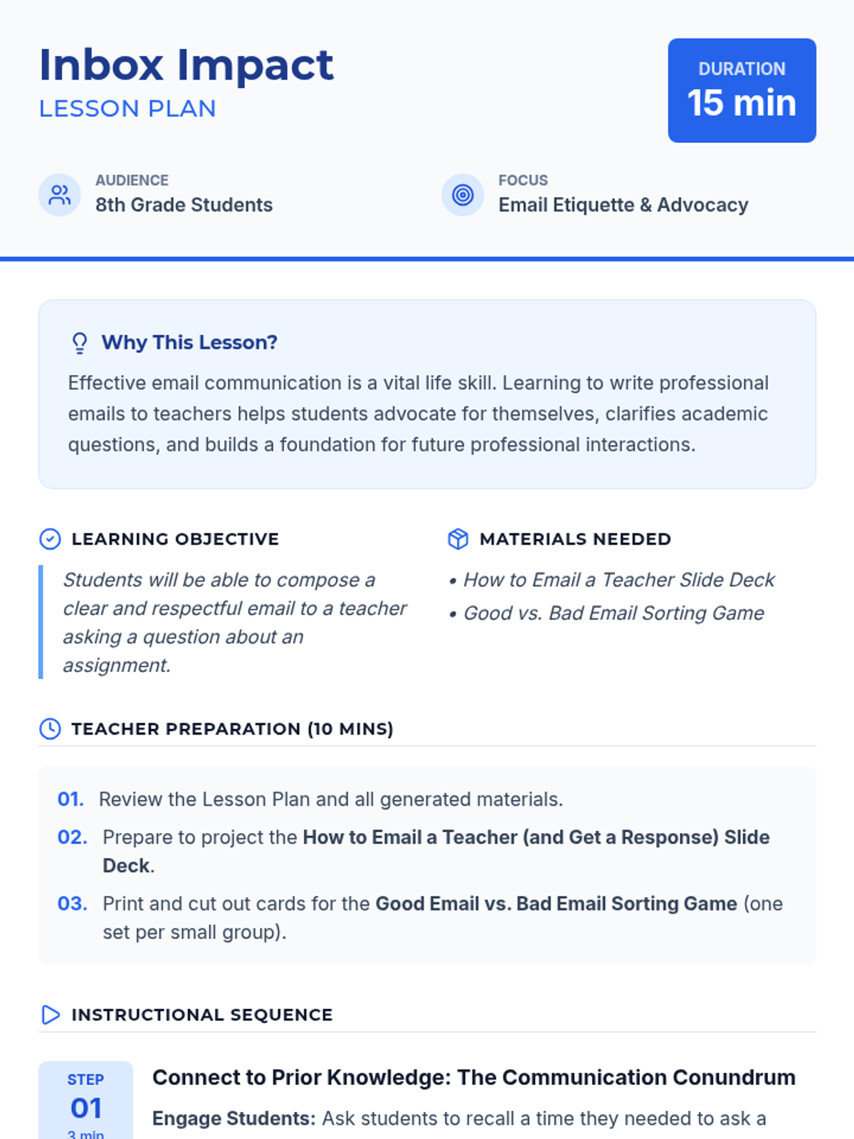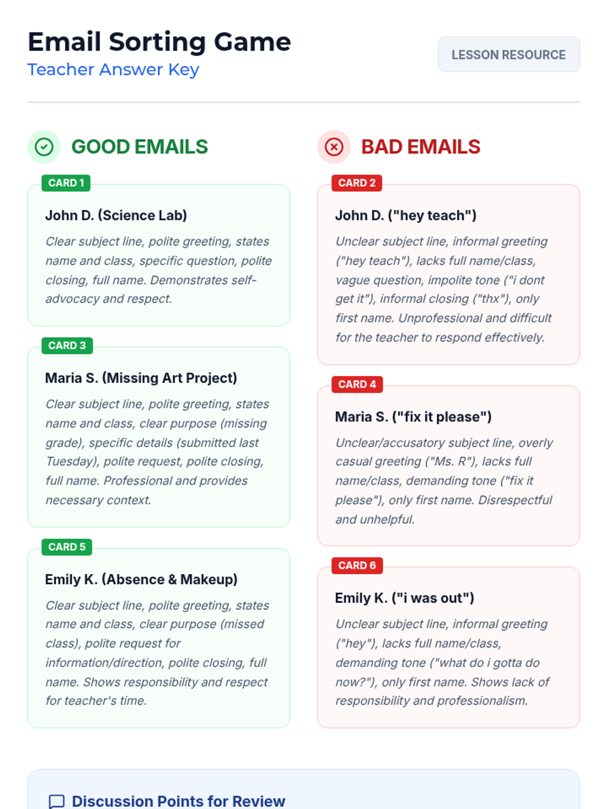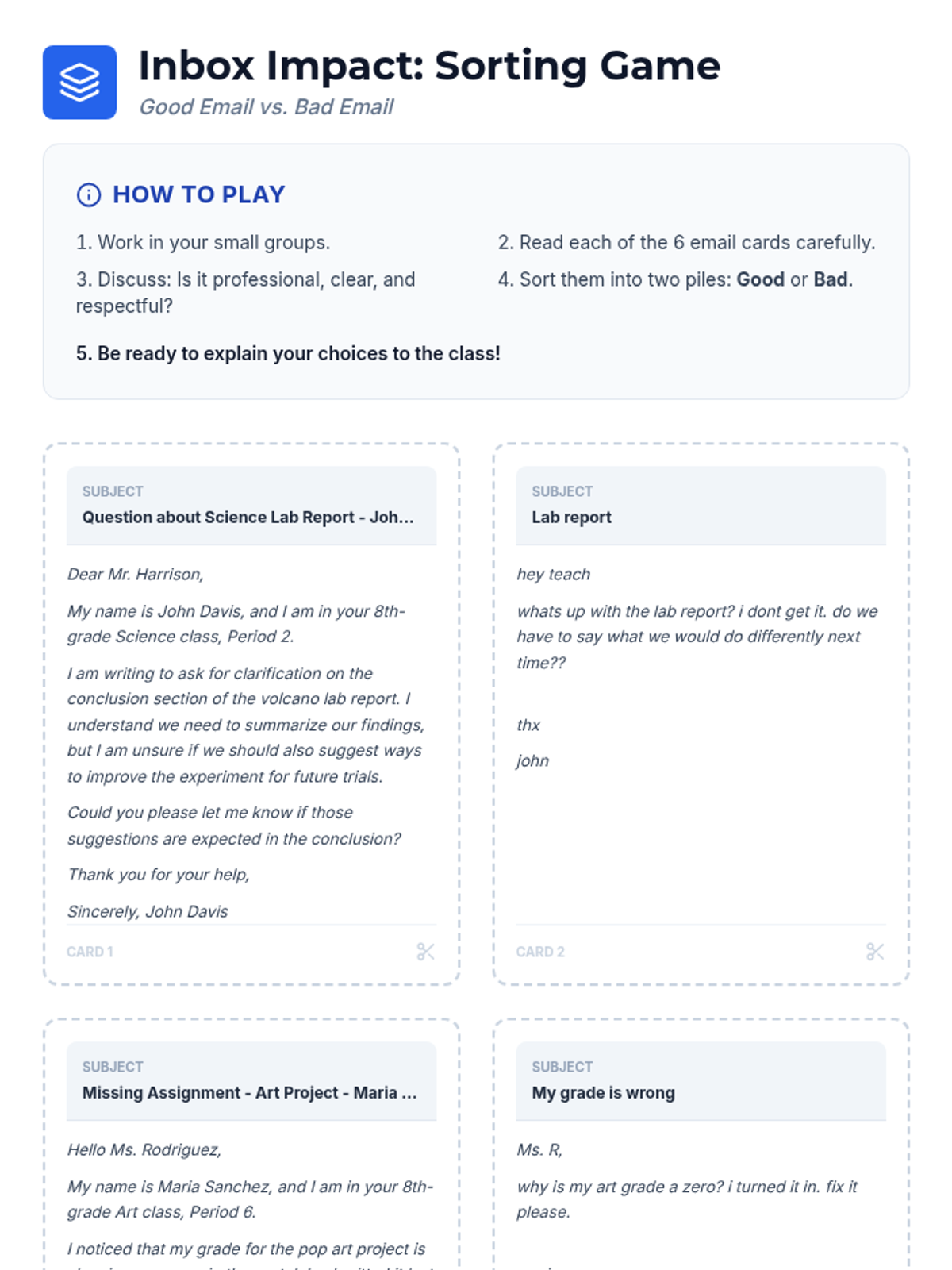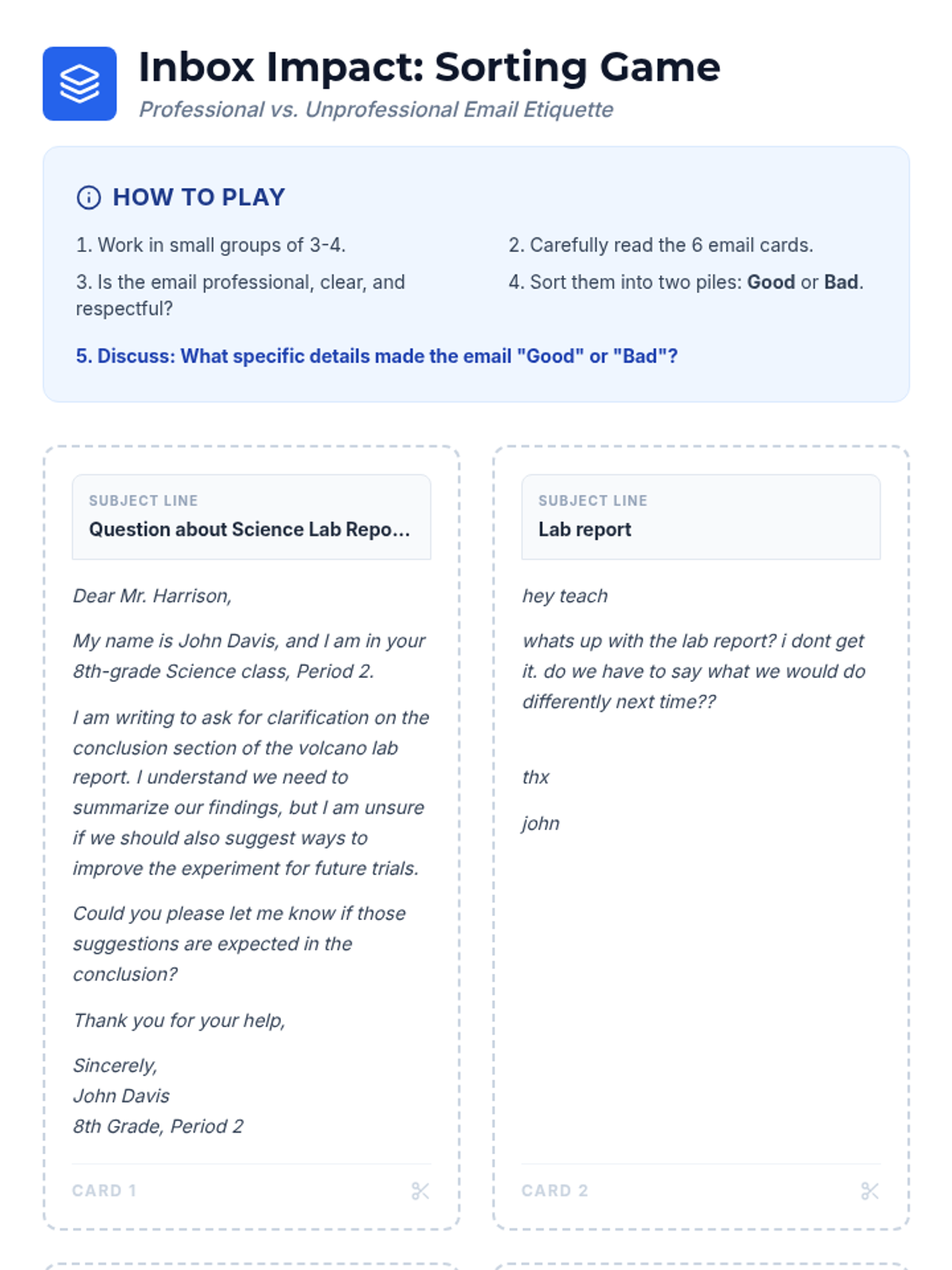 A 15-minute lesson for 8th graders on the art of writing professional and effective emails to teachers. Students learn email etiquette, subject line clarity, and respectful tone through direct instruction and a hands-on sorting game.