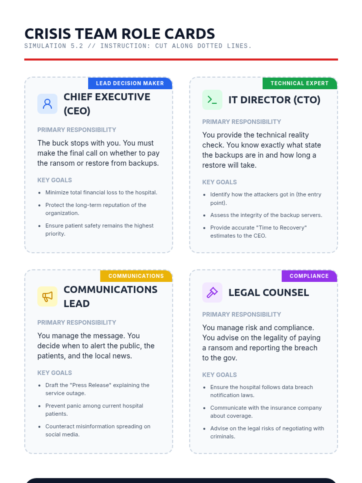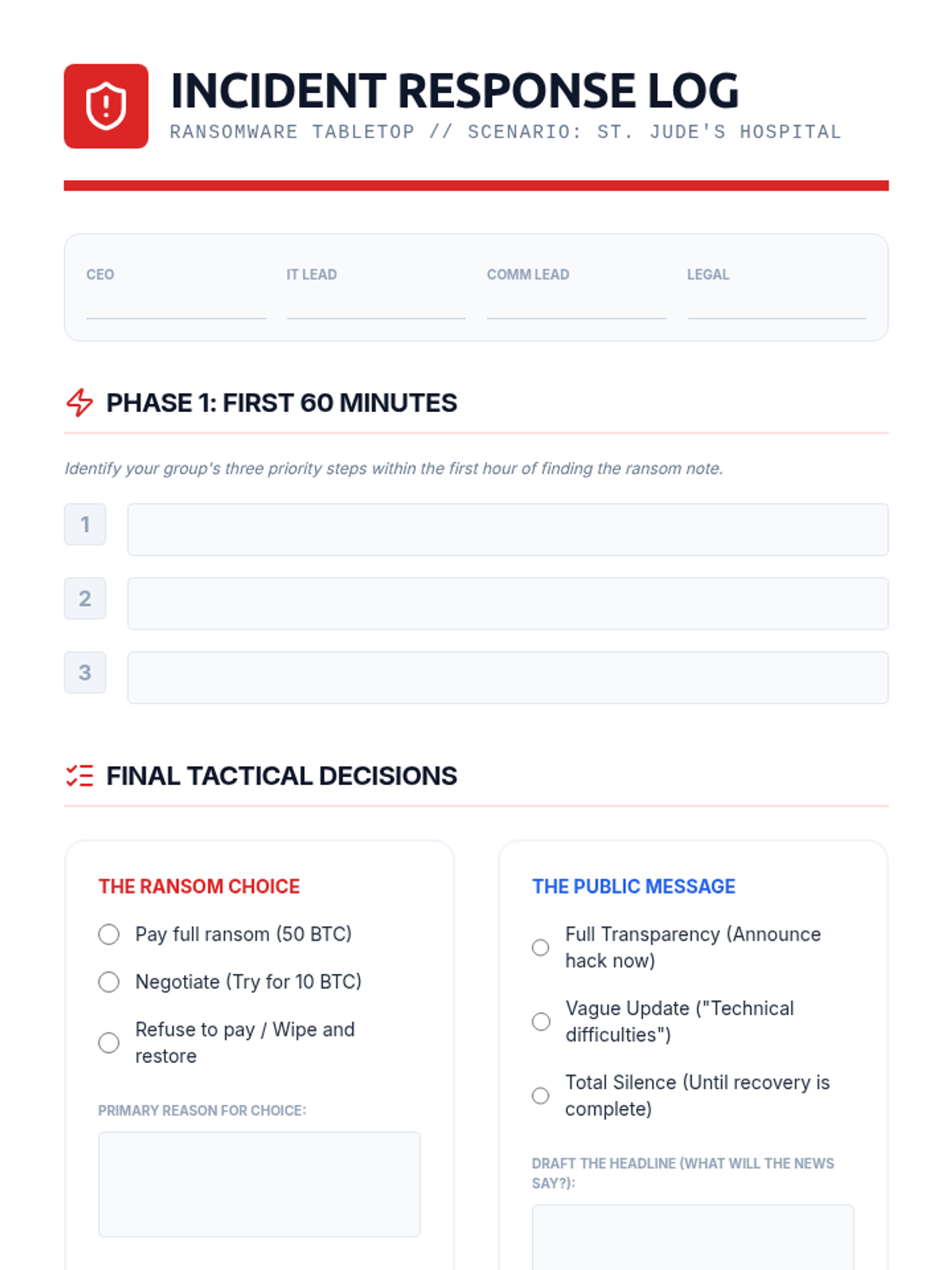 A high-stakes tabletop simulation where students manage a ransomware attack on a critical infrastructure target, making real-time strategic decisions.