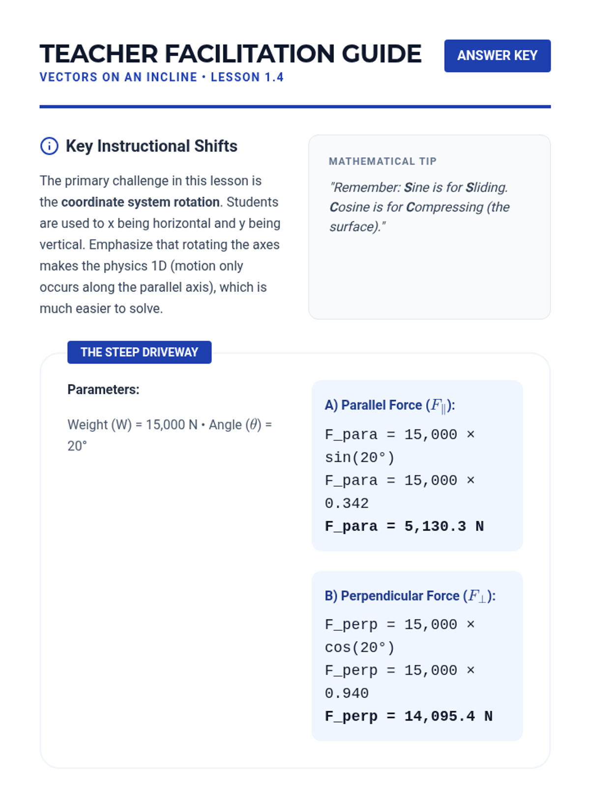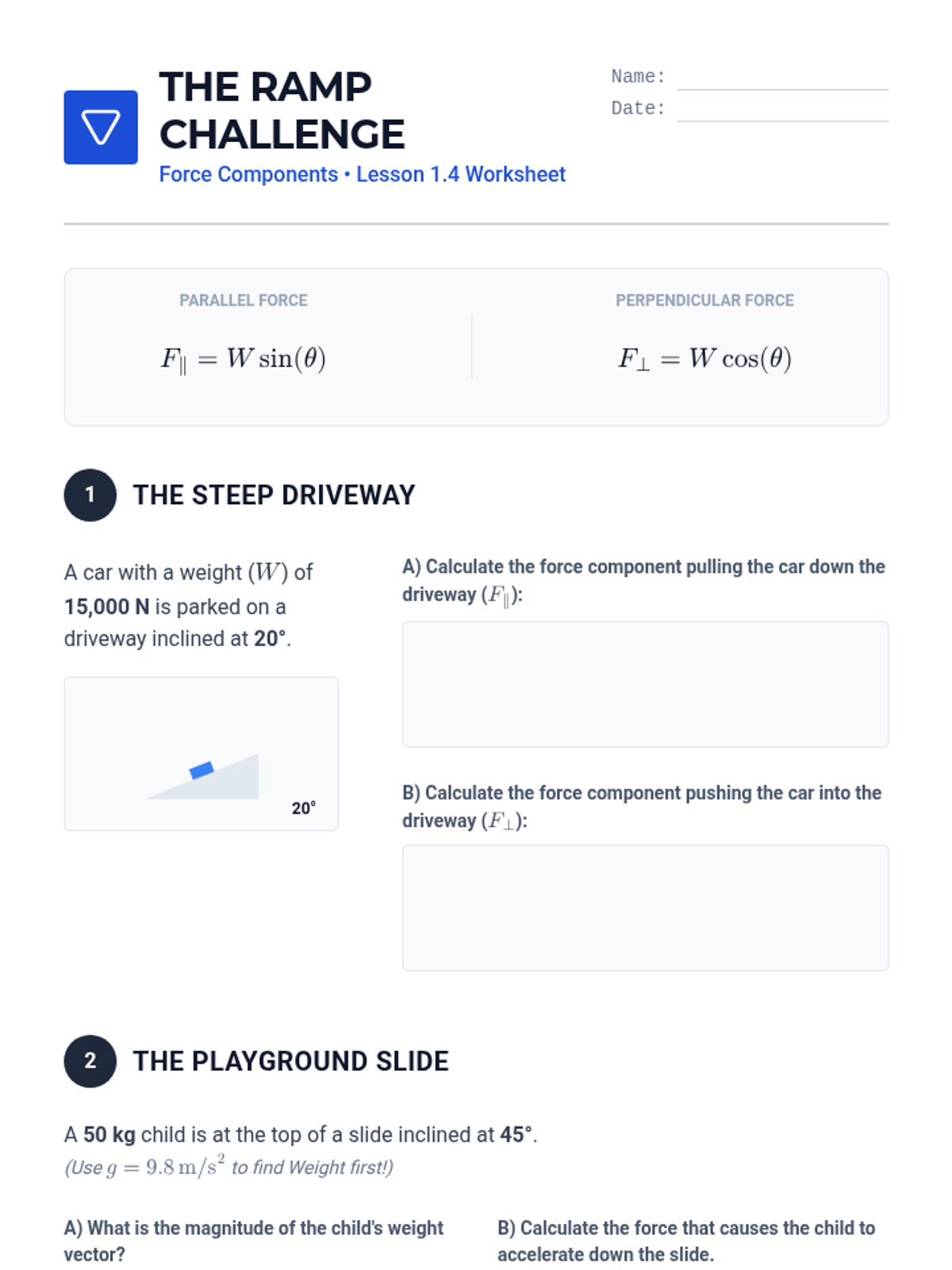 Students resolve gravity vectors into parallel and perpendicular components to analyze objects on inclined planes.