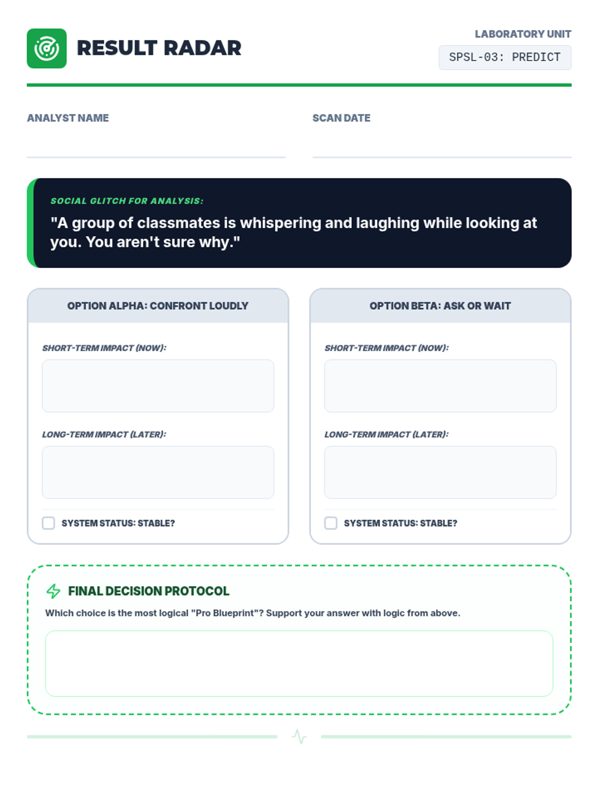 Students evaluate the potential consequences (pros and cons) of different social solutions to choose the most effective one.