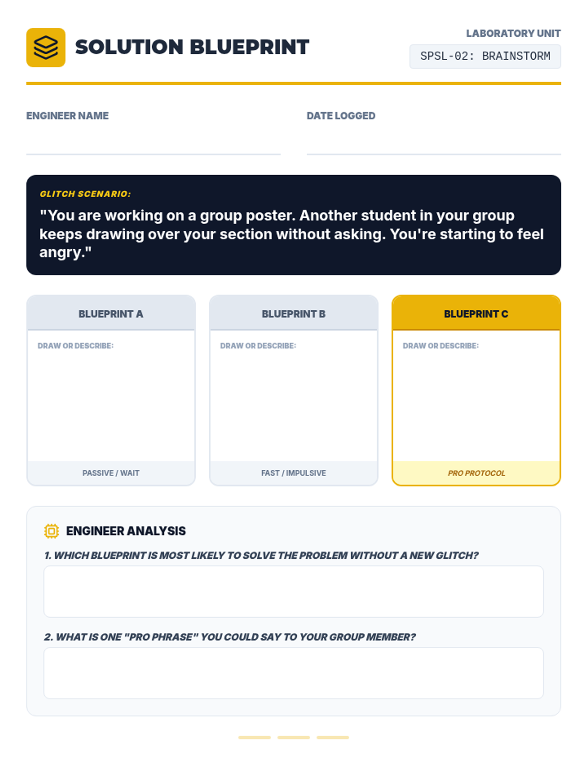 Students practice brainstorming multiple possible solutions to a single social conflict without initial judgment.
