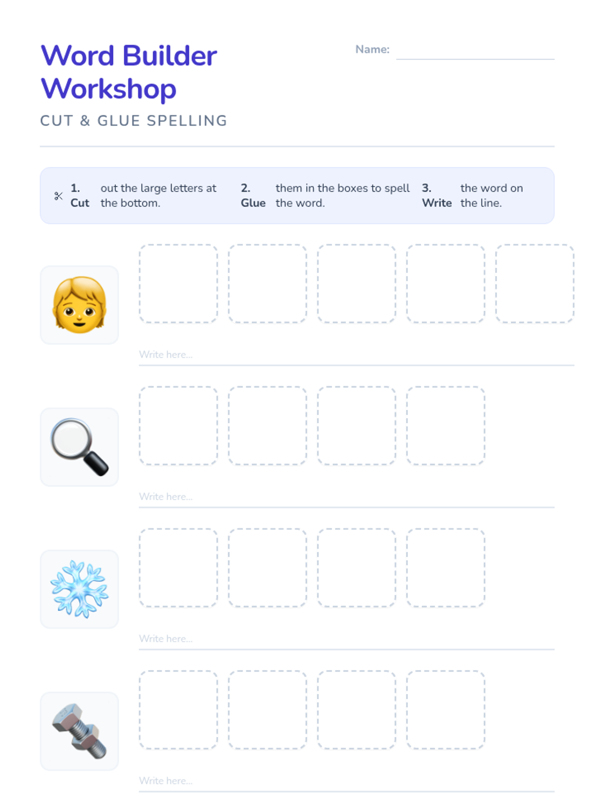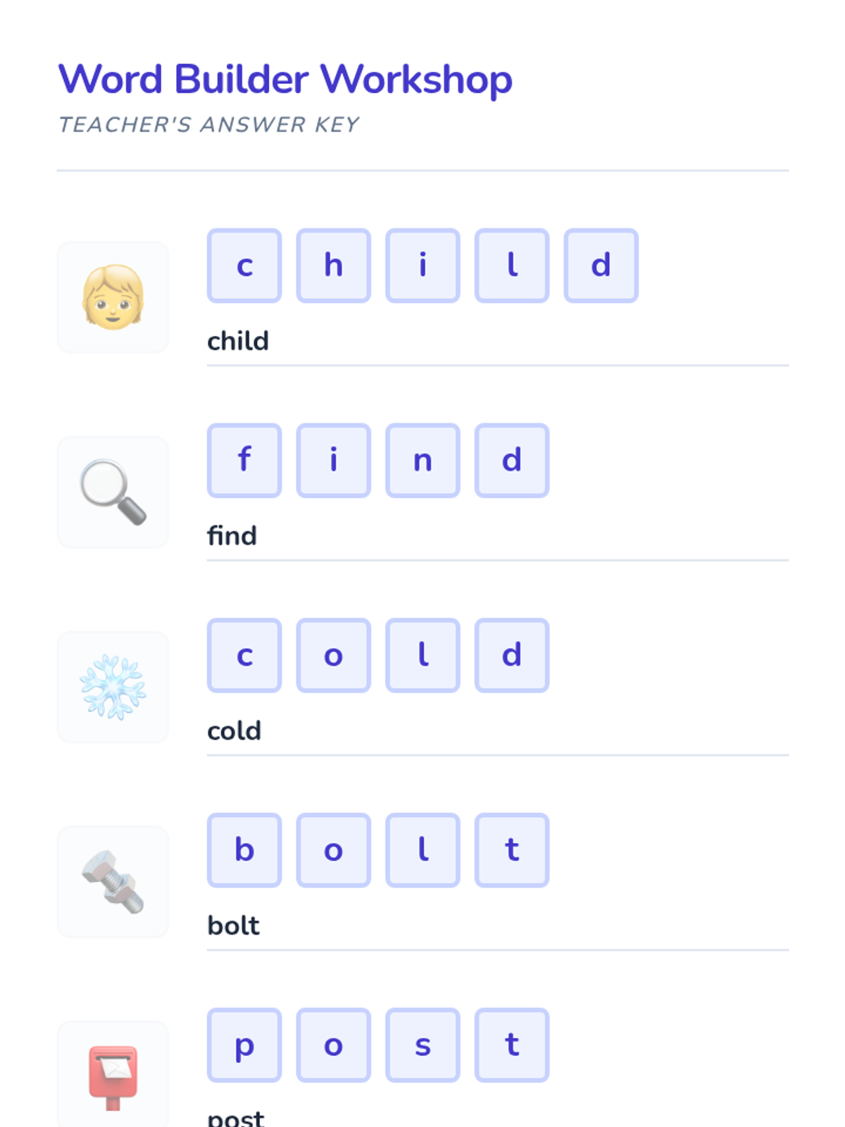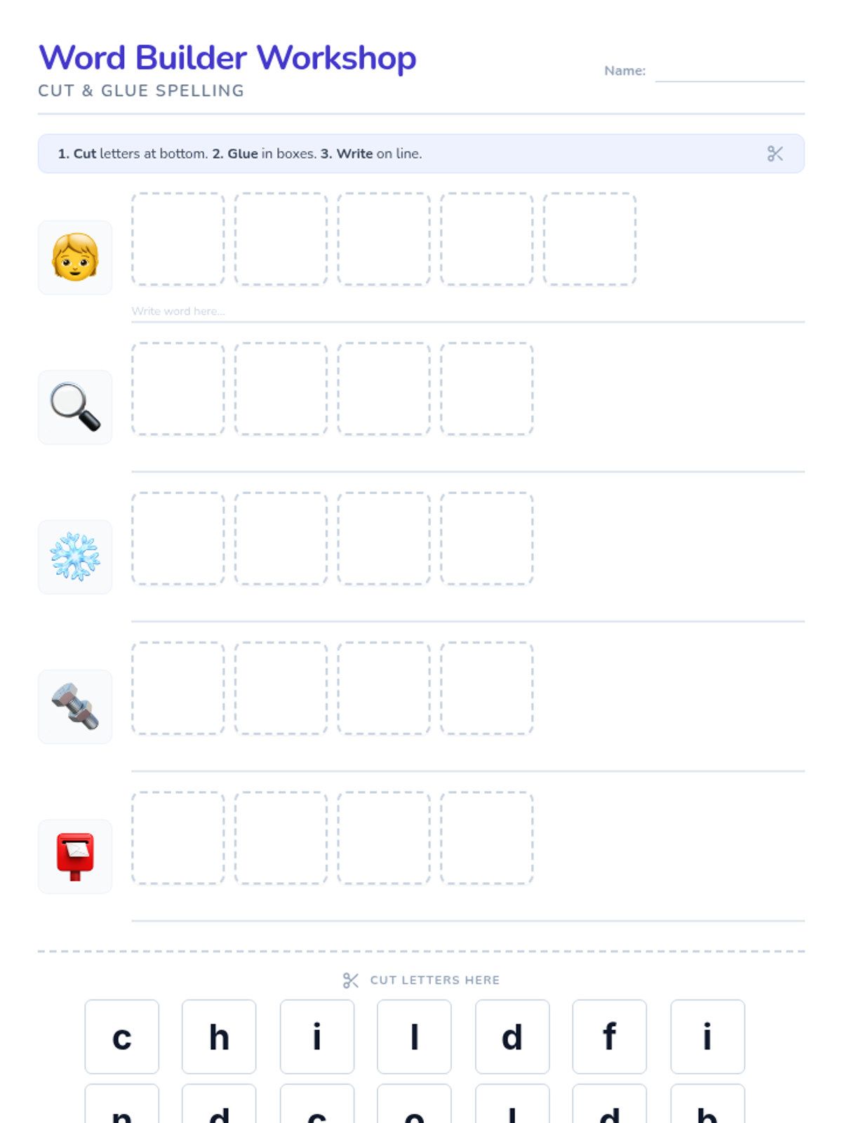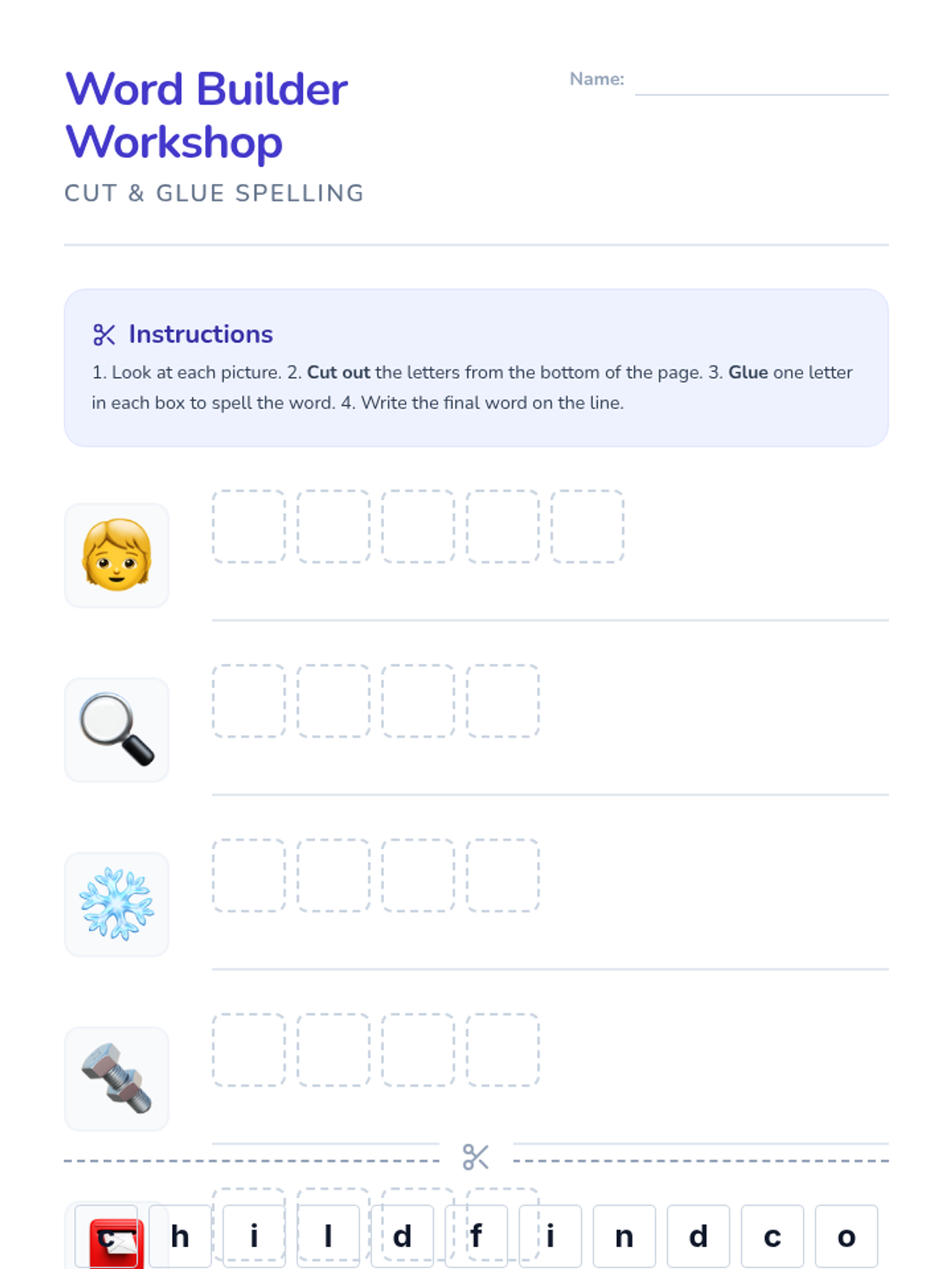 A phonics-focused spelling activity using Elkonin boxes to help students segment sounds and build words with specific vowel patterns. Students use provided letters to construct words like child, find, and cold.