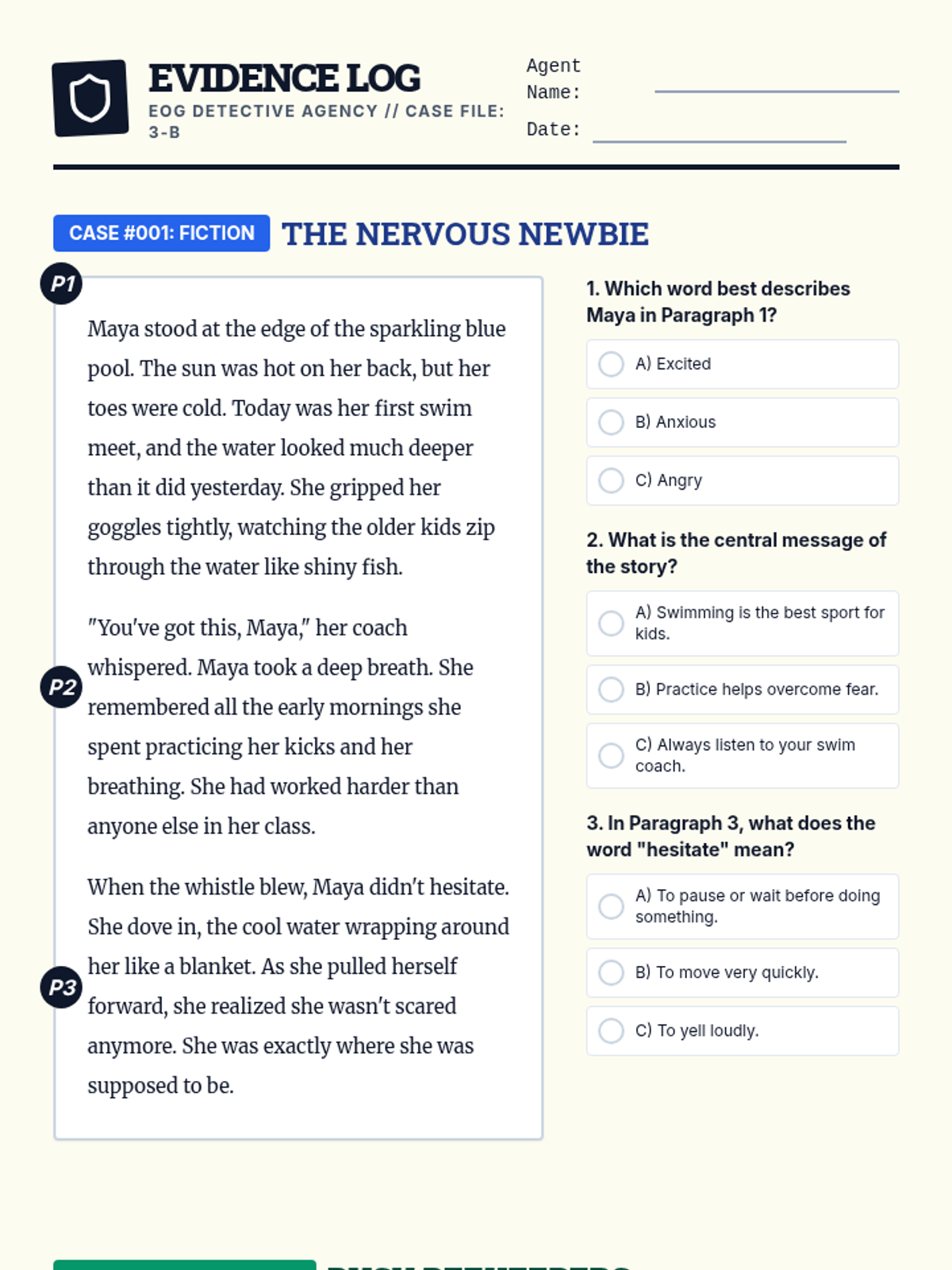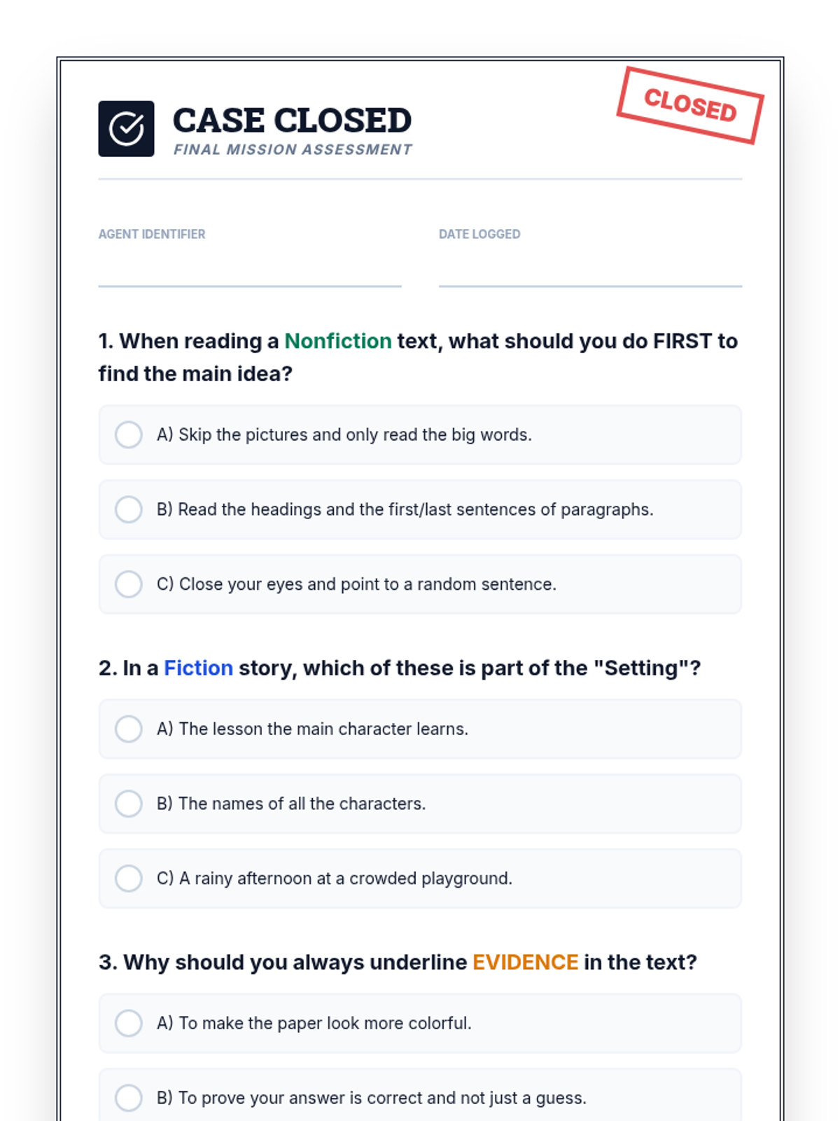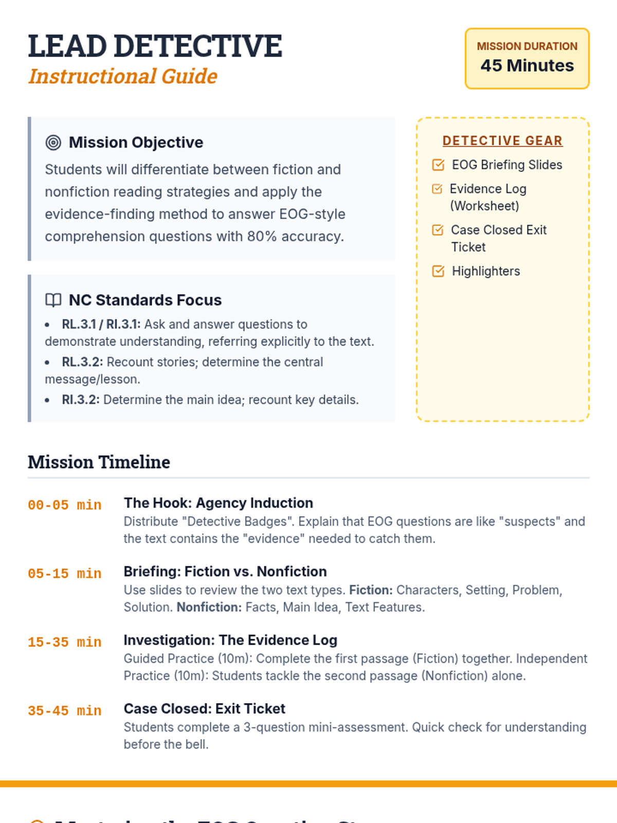 A high-intensity 45-minute lesson designed to prepare 3rd-grade students for the NC EOG Reading test by focusing on evidence-based comprehension strategies for both fiction and nonfiction texts.