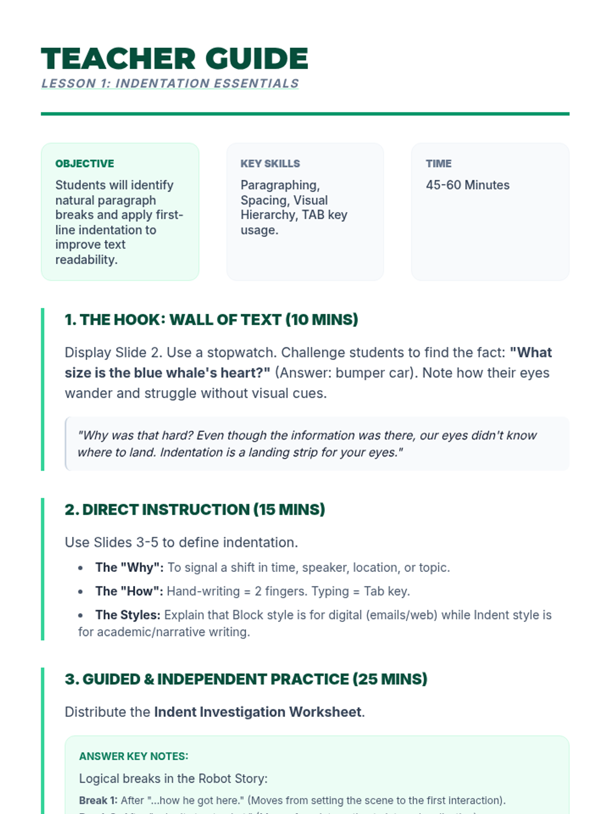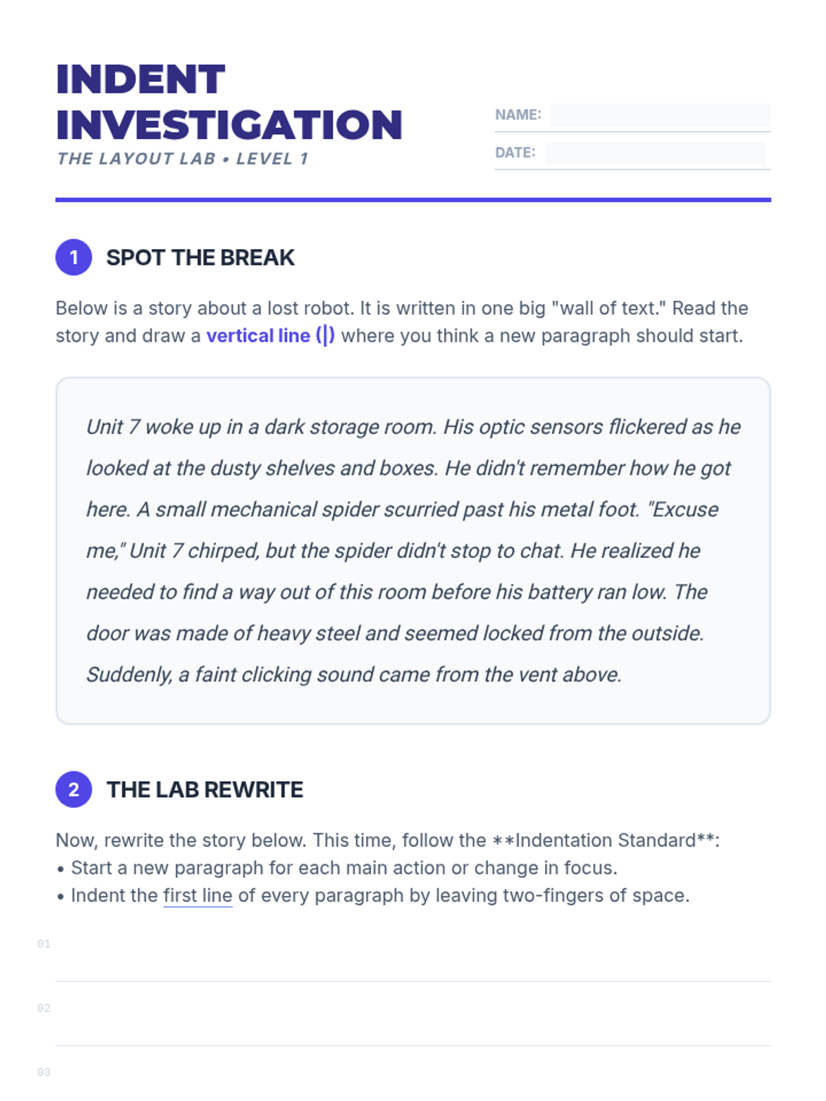 Students learn the mechanical standard of indenting paragraphs and compare block style to indented style to see how white space helps a reader navigate text.