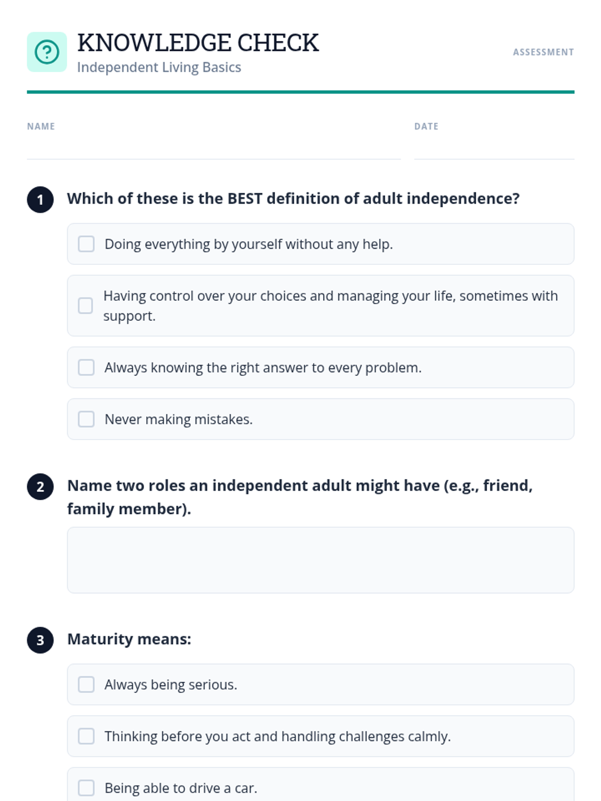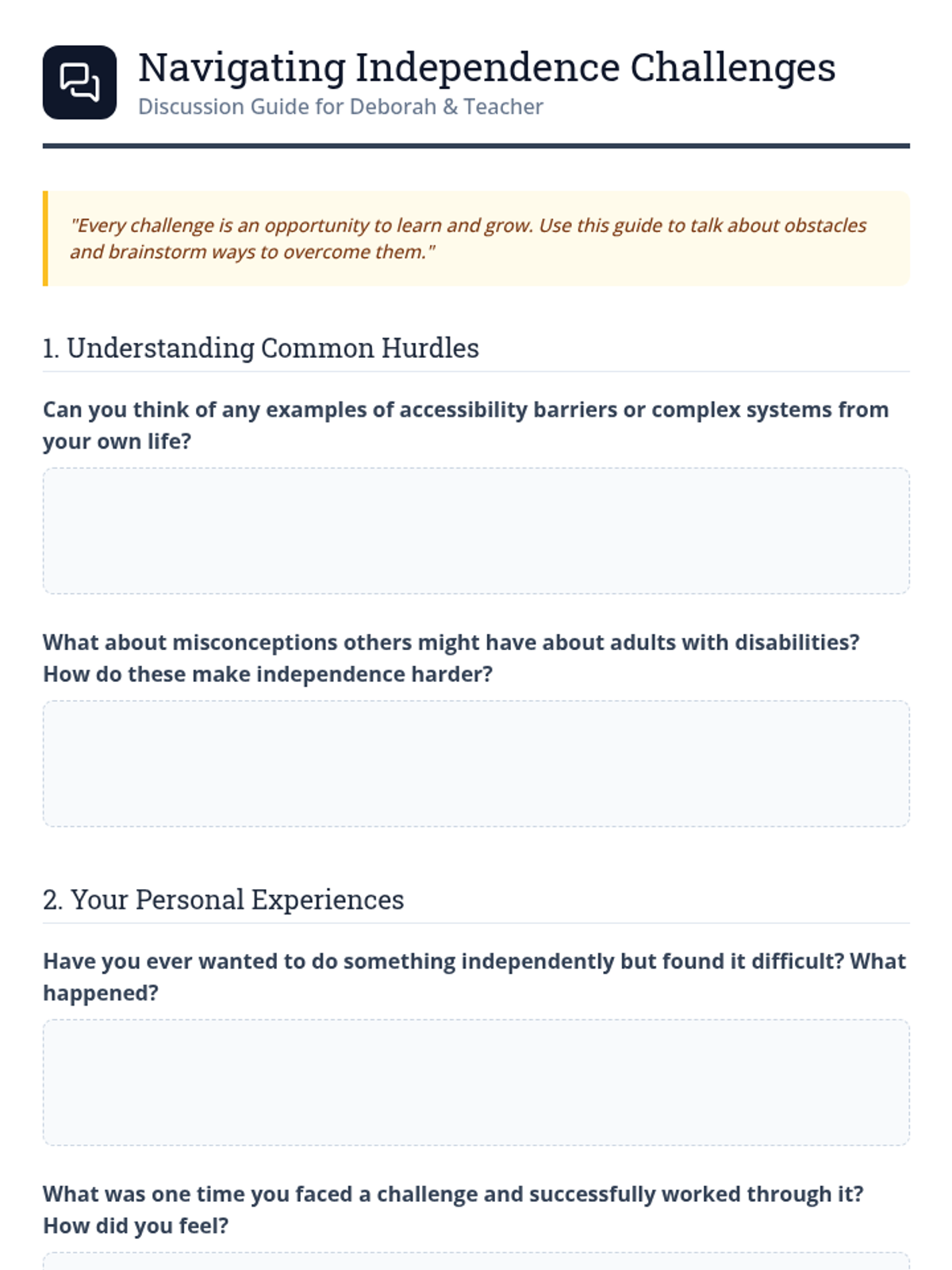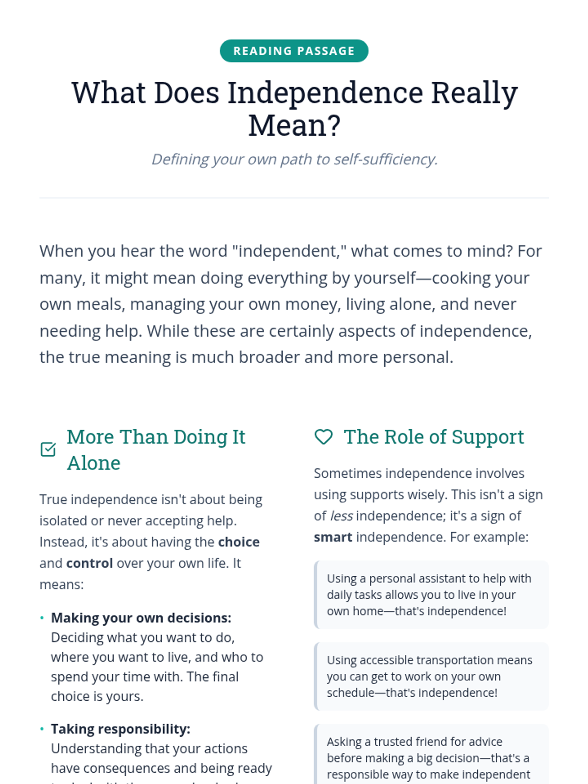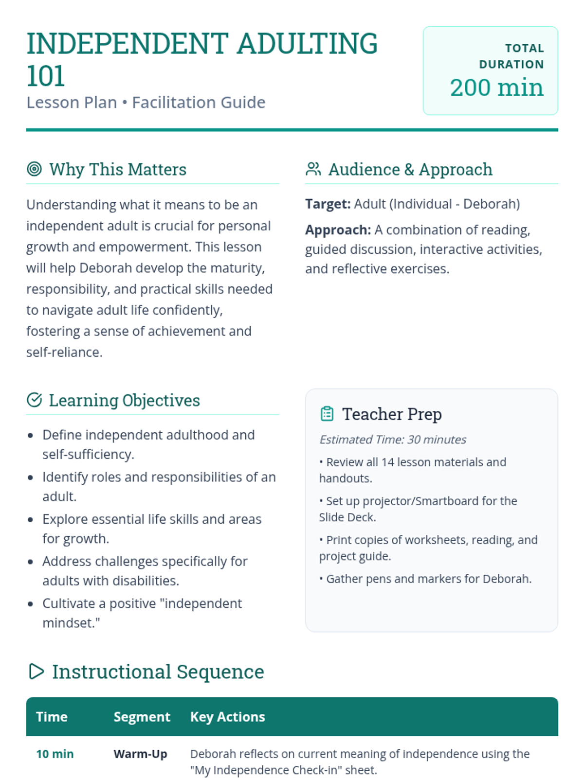 This lesson helps Deborah, an adult with a disability, understand the multifaceted aspects of independent living. It covers roles, responsibilities, necessary skills, and the mindset required for self-sufficiency, with a focus on building maturity and responsibility.