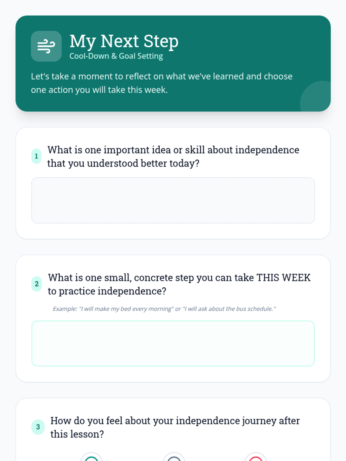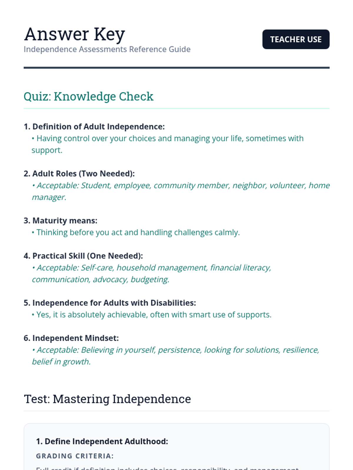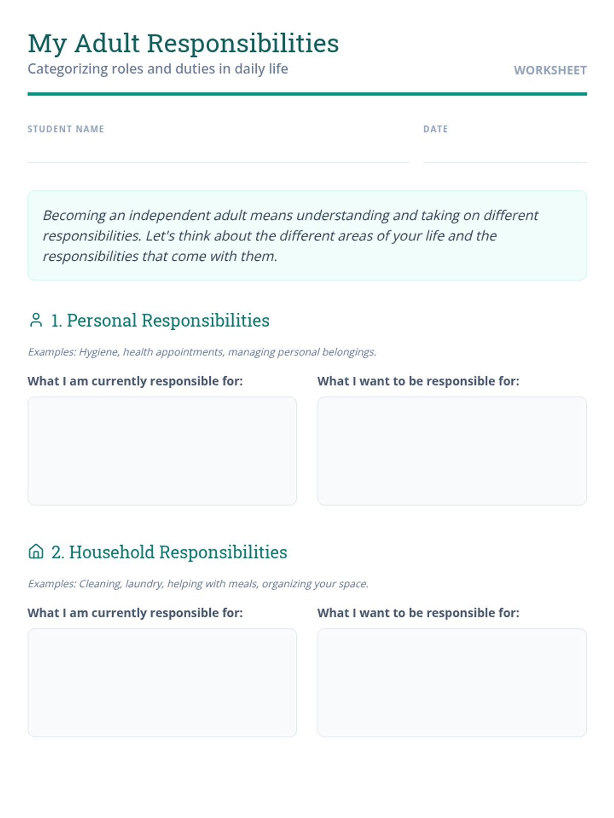 This lesson helps Deborah, an adult with a disability, understand the multifaceted aspects of independent living. It covers roles, responsibilities, necessary skills, and the mindset required for self-sufficiency, with a focus on building maturity and responsibility.