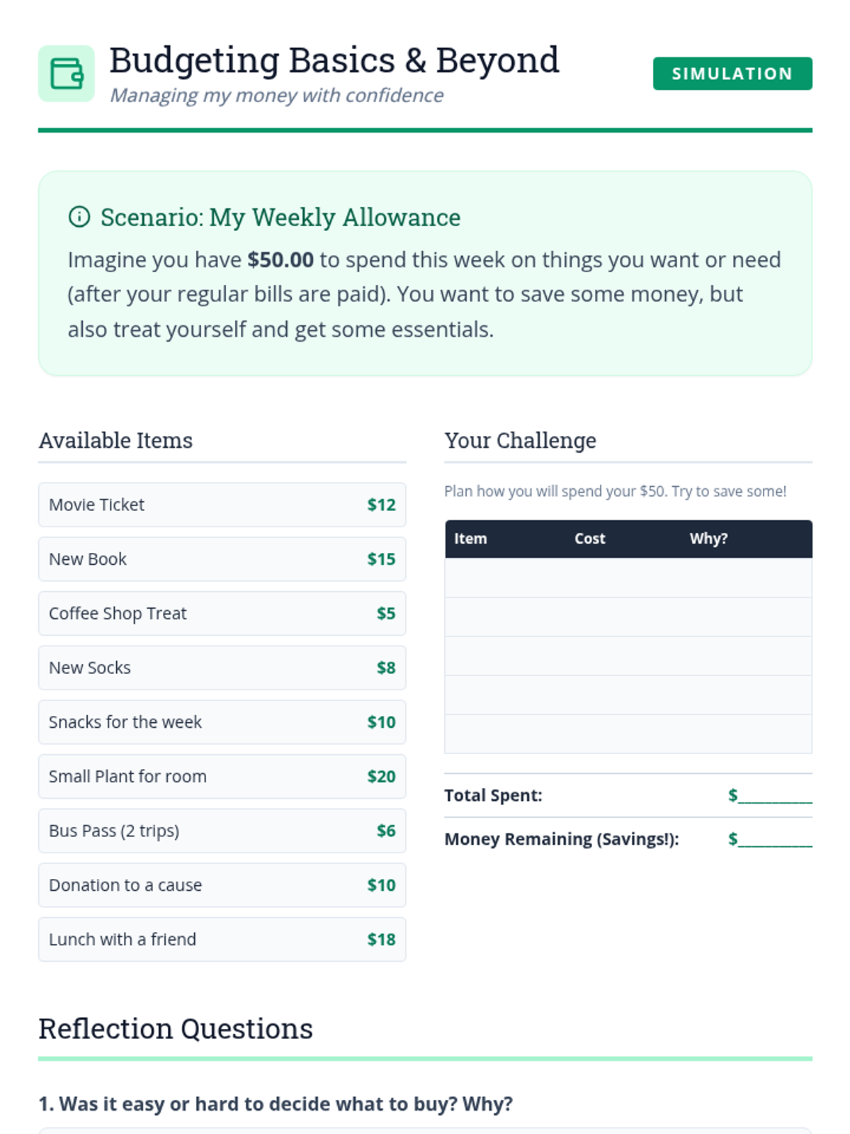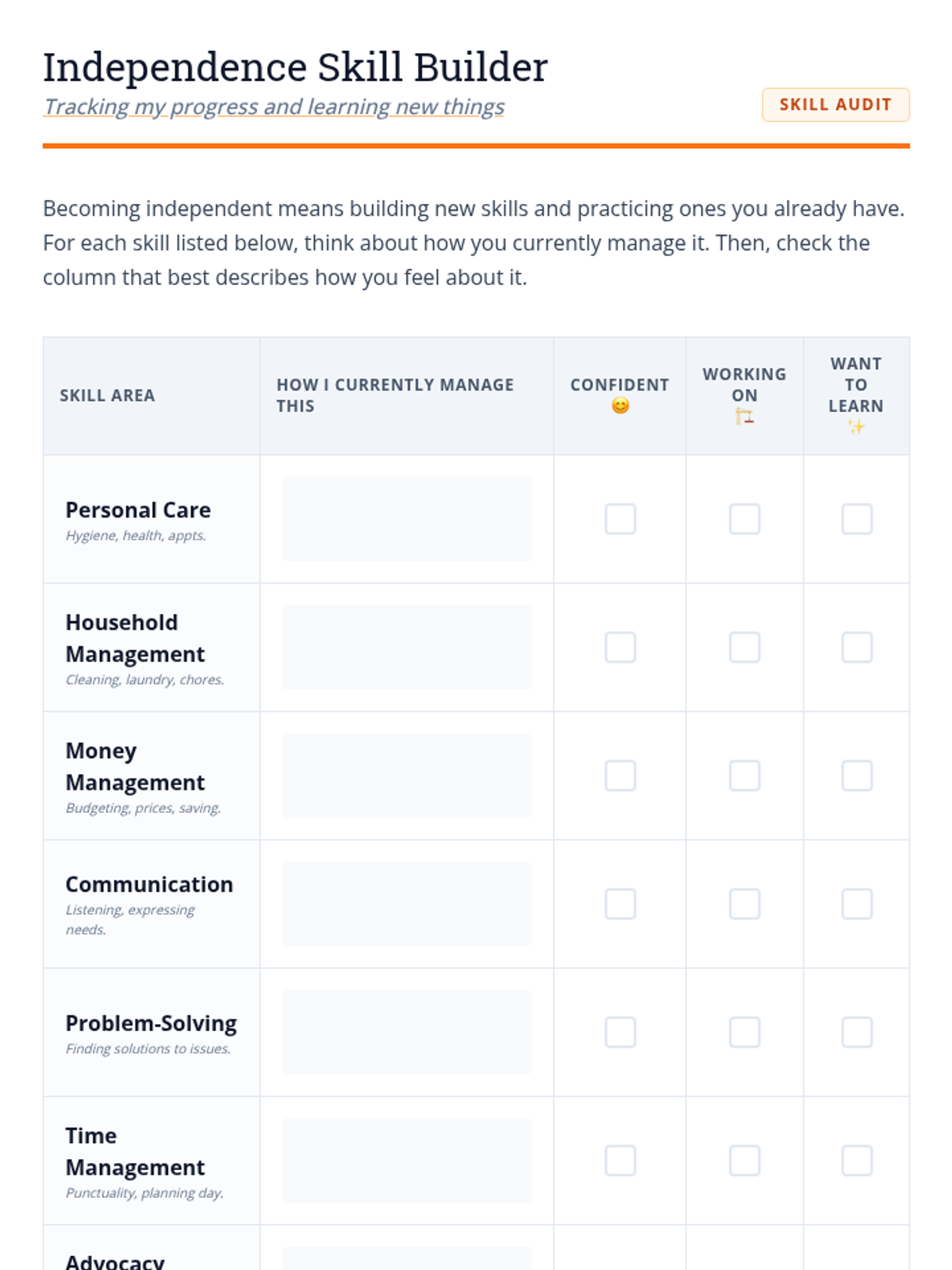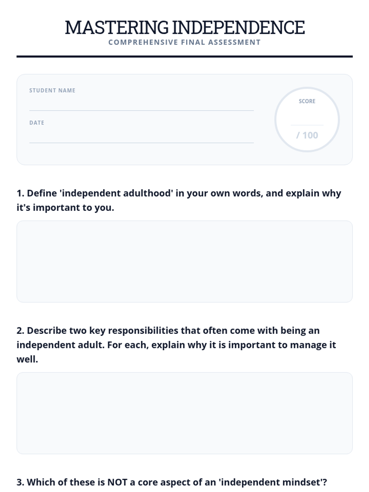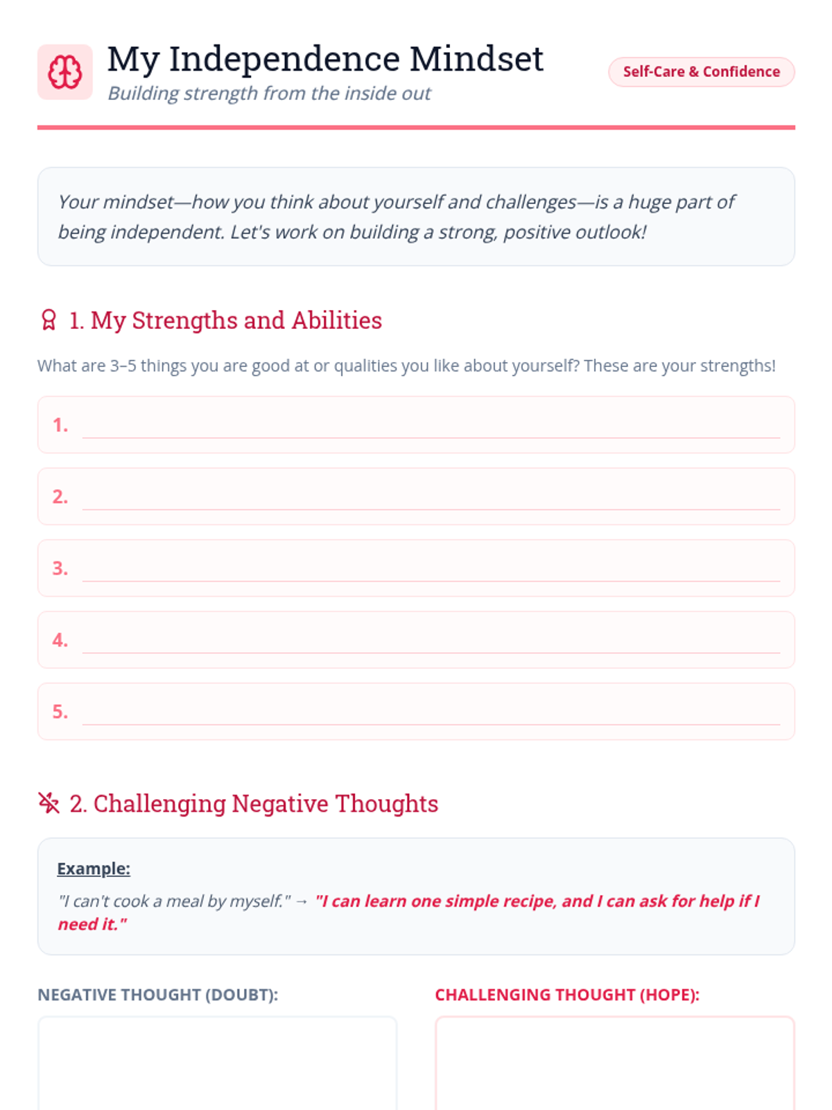 This lesson helps Deborah, an adult with a disability, understand the multifaceted aspects of independent living. It covers roles, responsibilities, necessary skills, and the mindset required for self-sufficiency, with a focus on building maturity and responsibility.