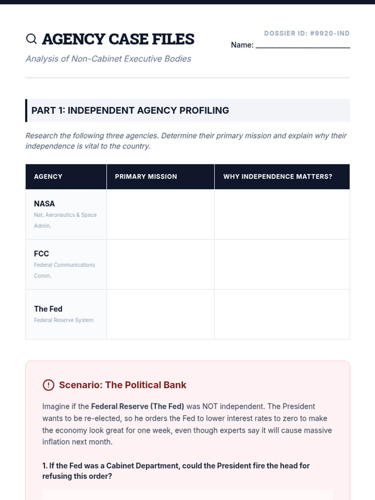 Students investigate independent agencies like NASA and the CIA, exploring why some bodies are designed to be outside direct presidential control.