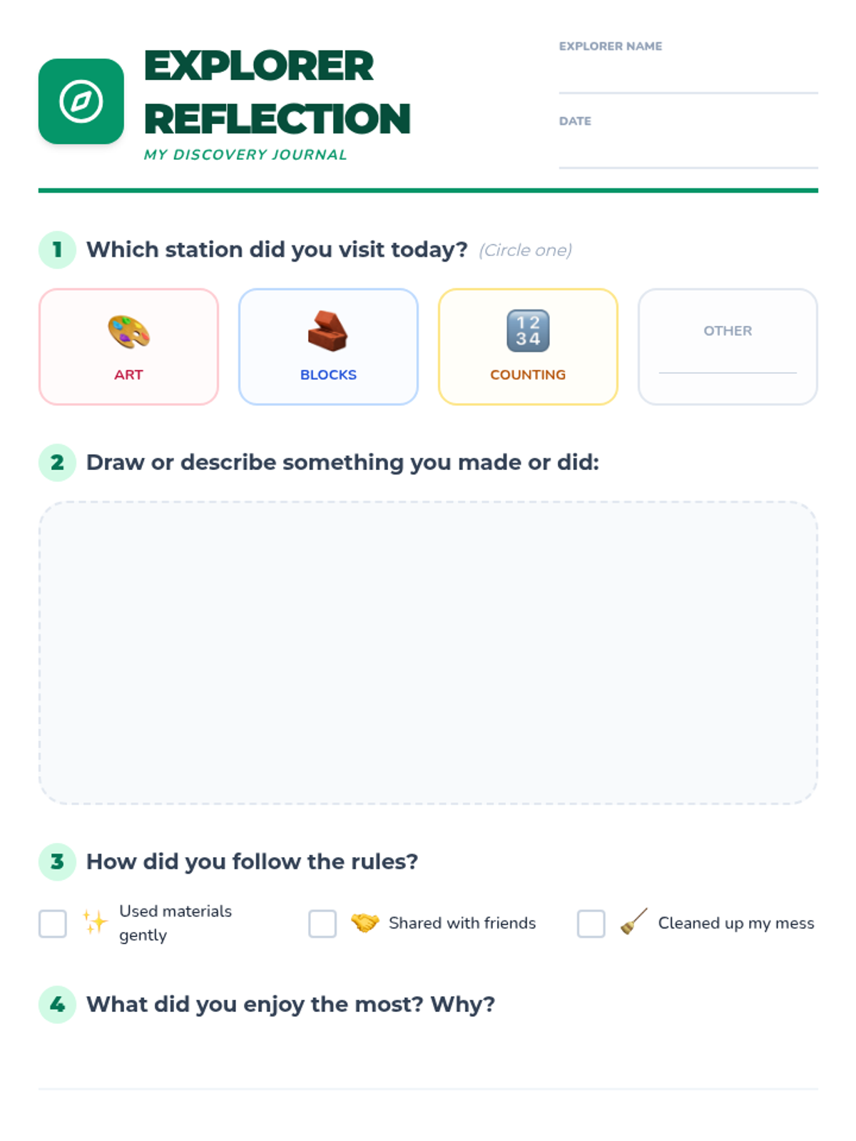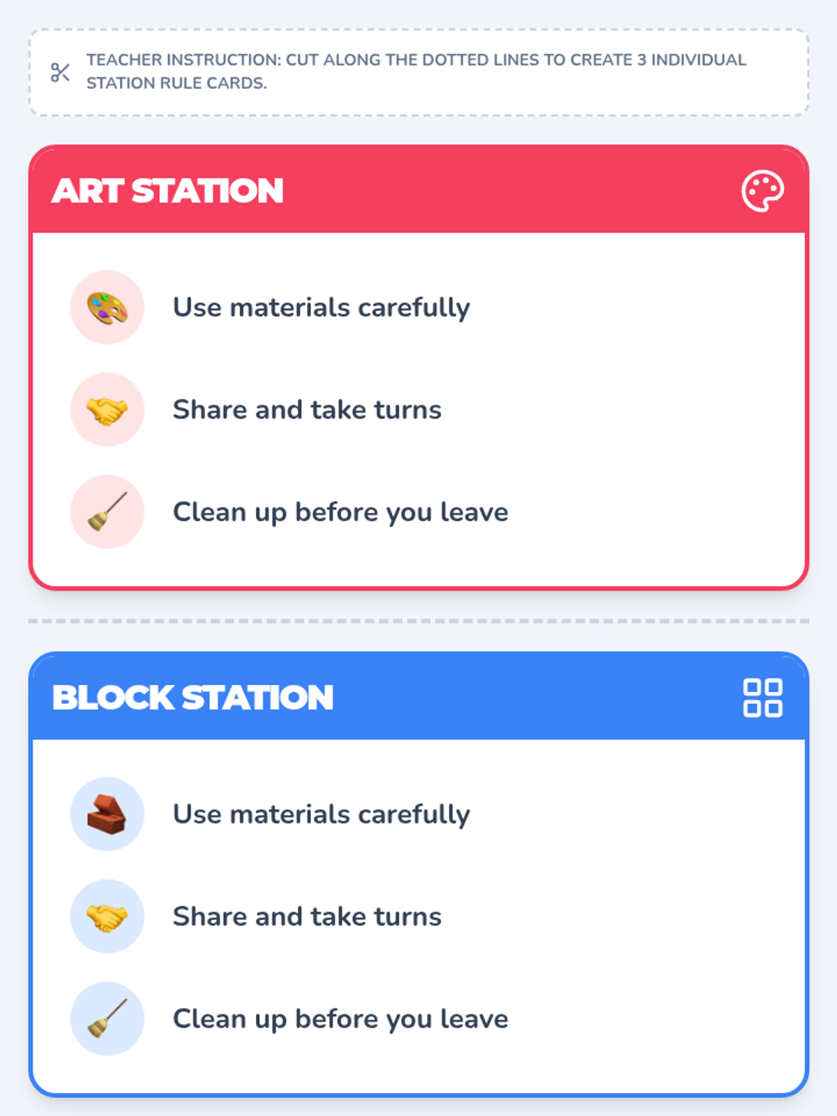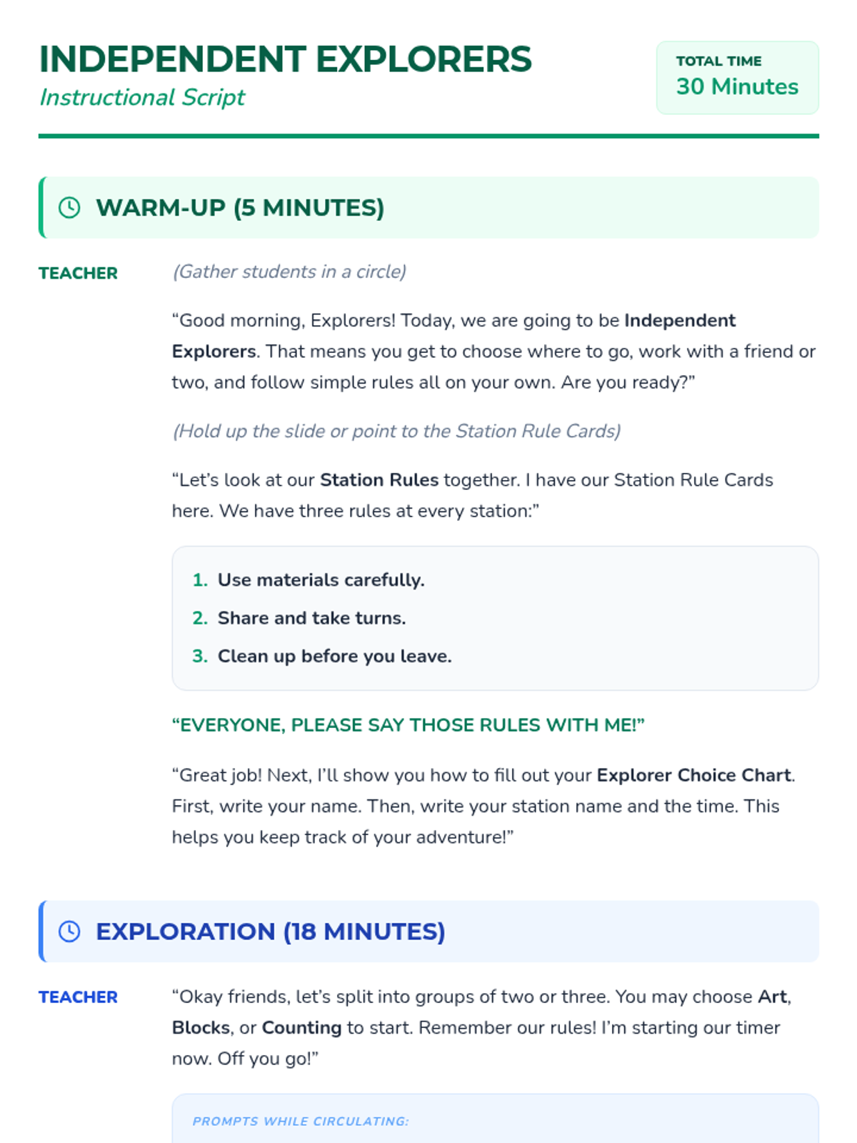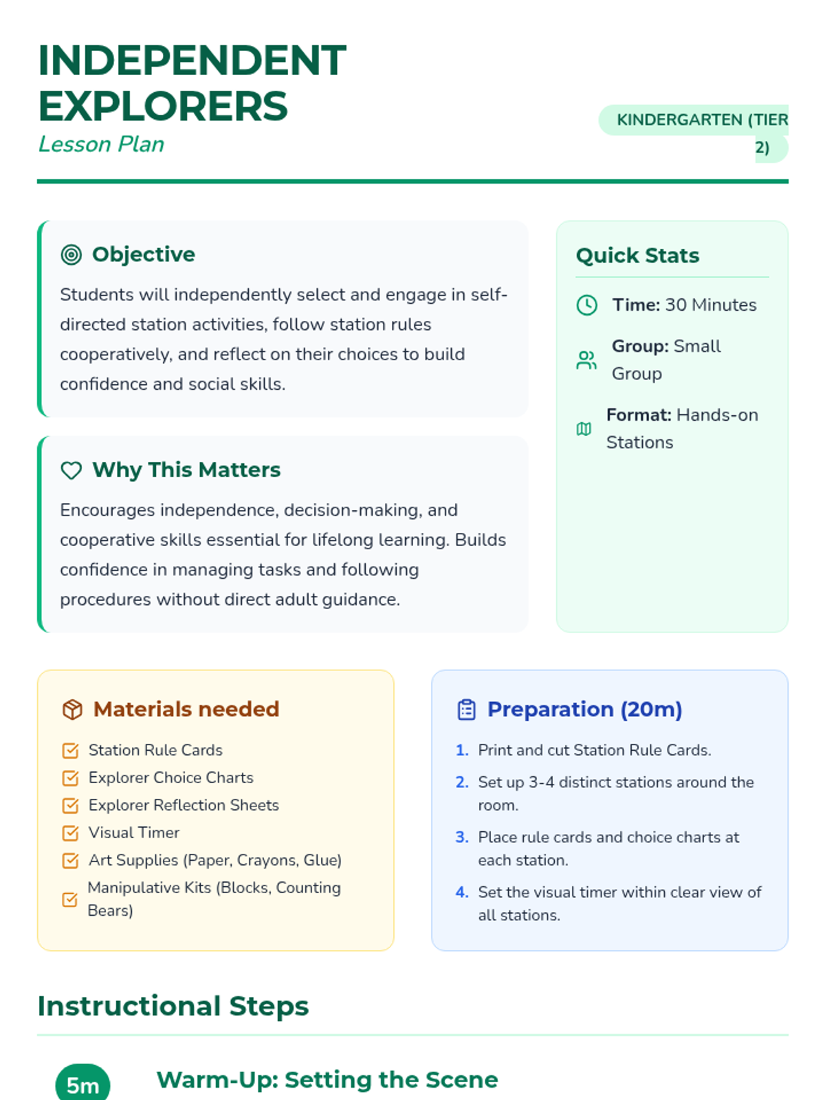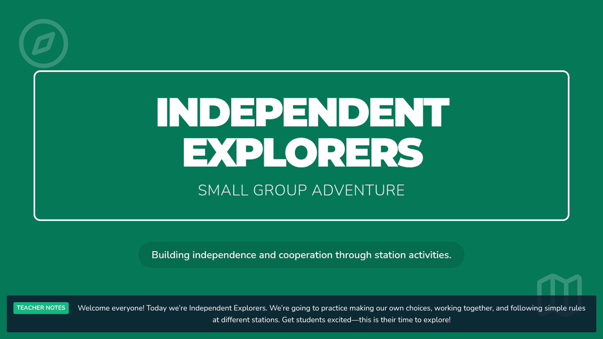 A 30-minute self-directed small group lesson for kindergarteners to build independence, cooperation, and self-management through station-based activities. Students practice making choices, following rules, and reflecting on their work.