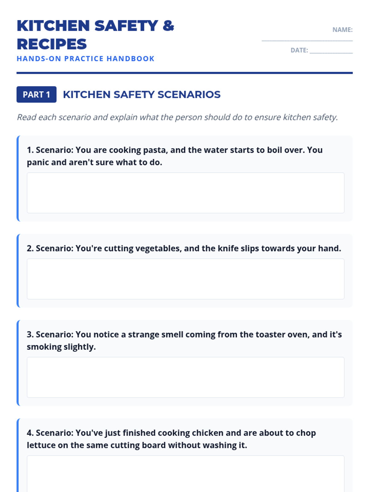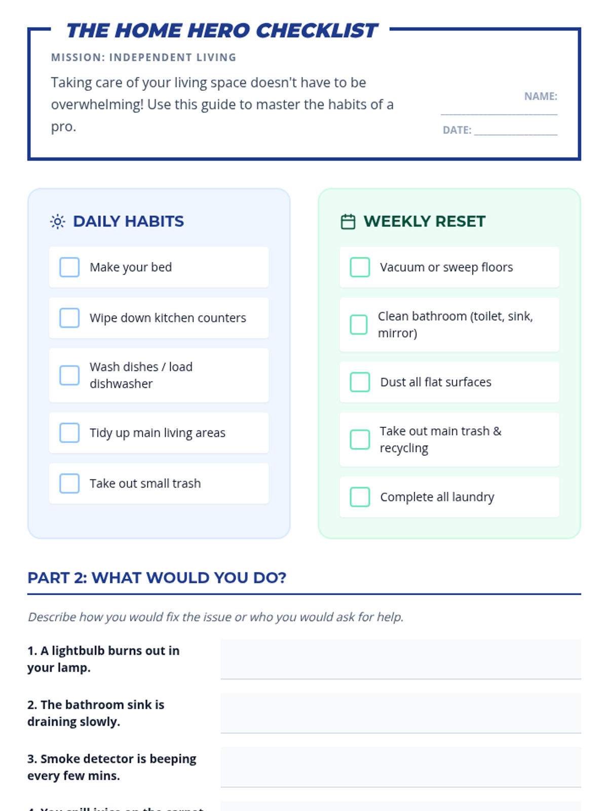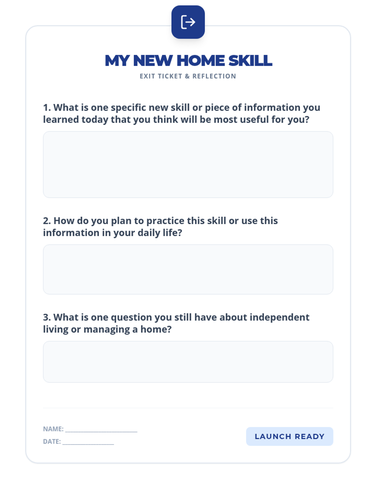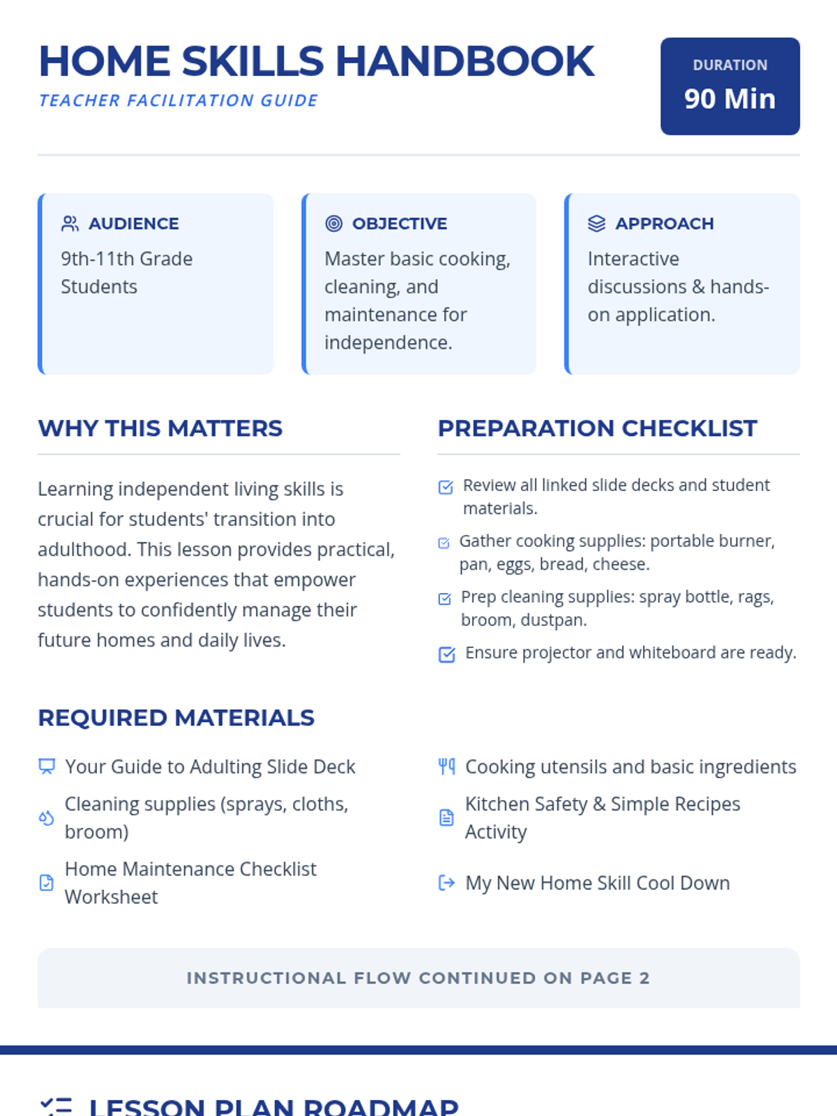 A comprehensive 90-minute lesson designed for 9th-11th graders to master essential independent living skills, including kitchen safety, basic cooking, cleaning routines, and home maintenance basics.
