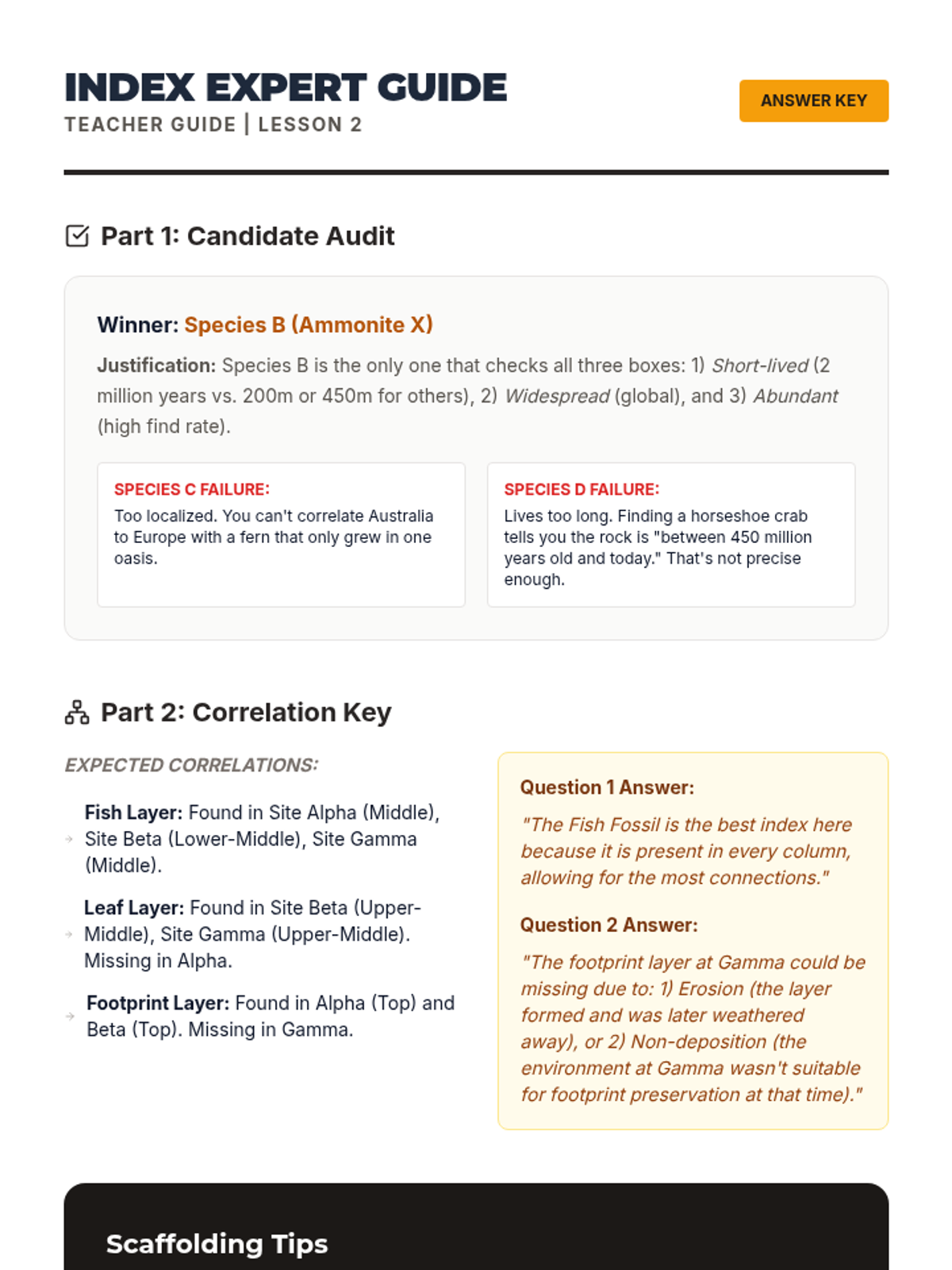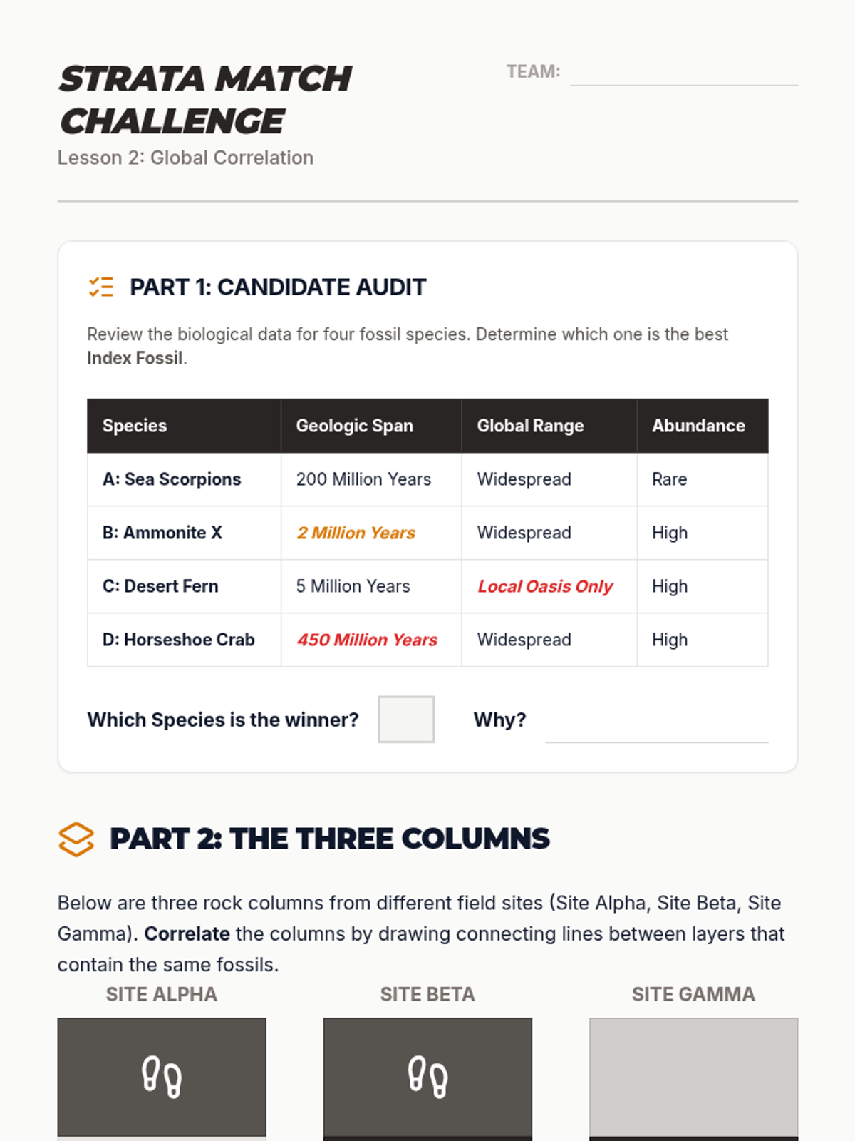 Students define the criteria for a good index fossil and practice correlating rock columns from geographically separated locations using these unique biological markers.
