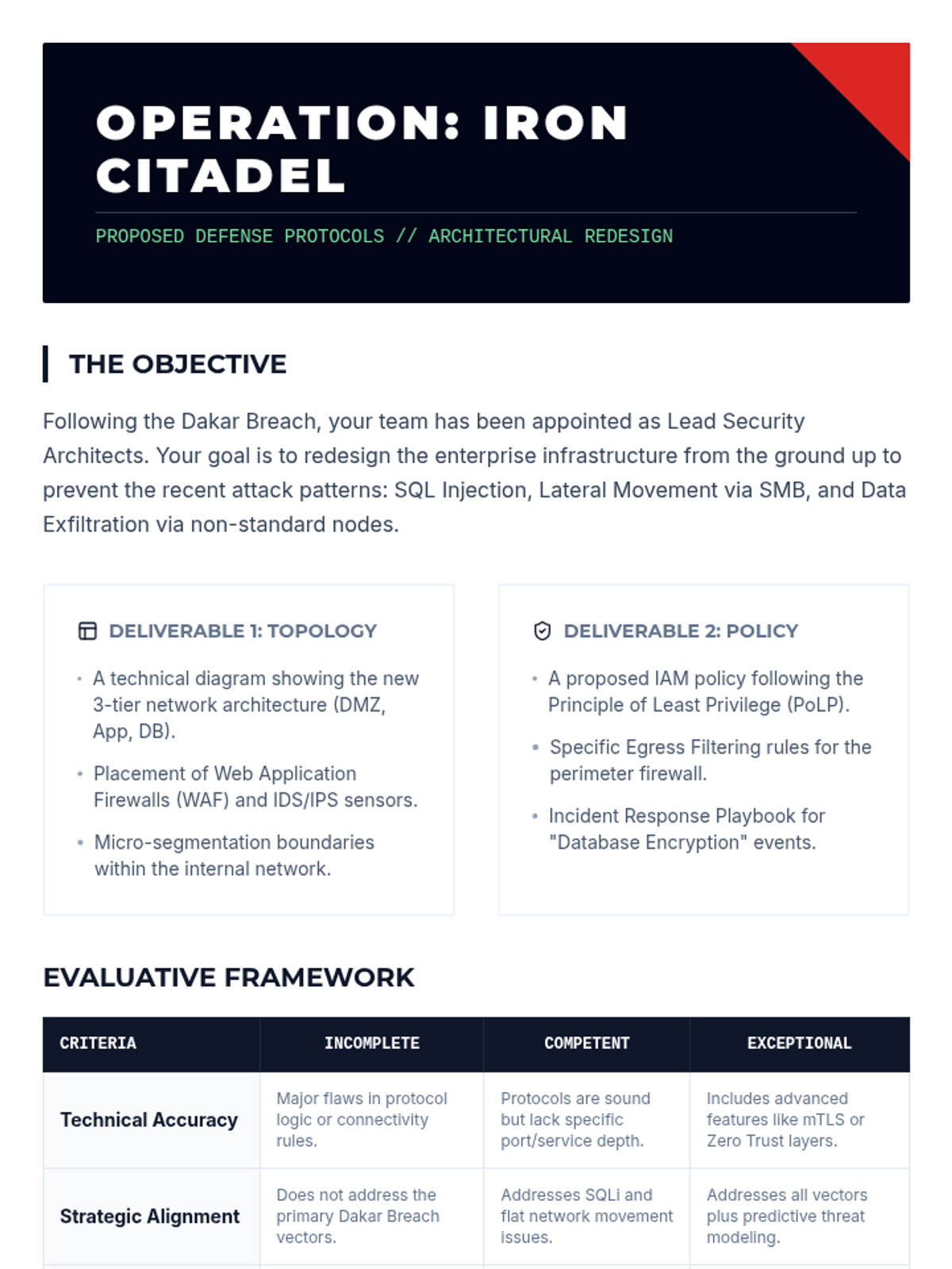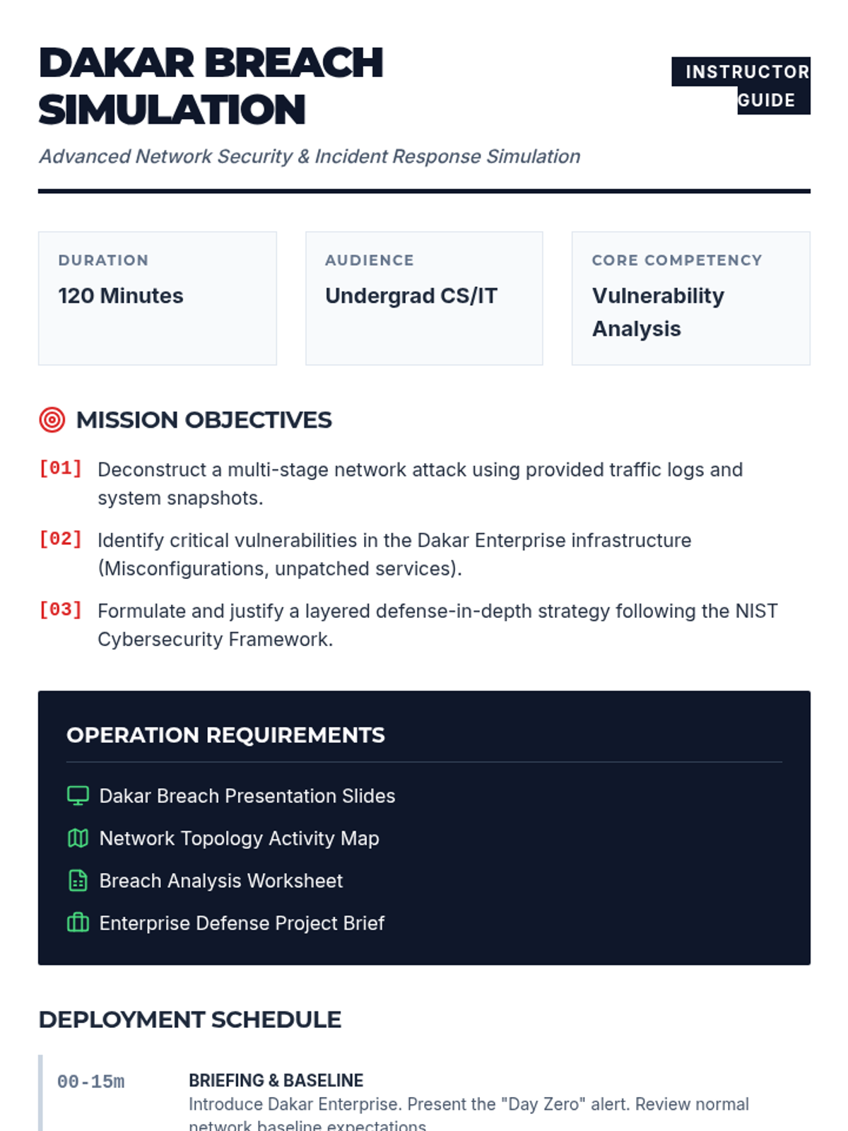 An intensive cybersecurity simulation where undergraduate students analyze a network breach, identify vulnerabilities, and design robust defensive protocols for a fictional enterprise.