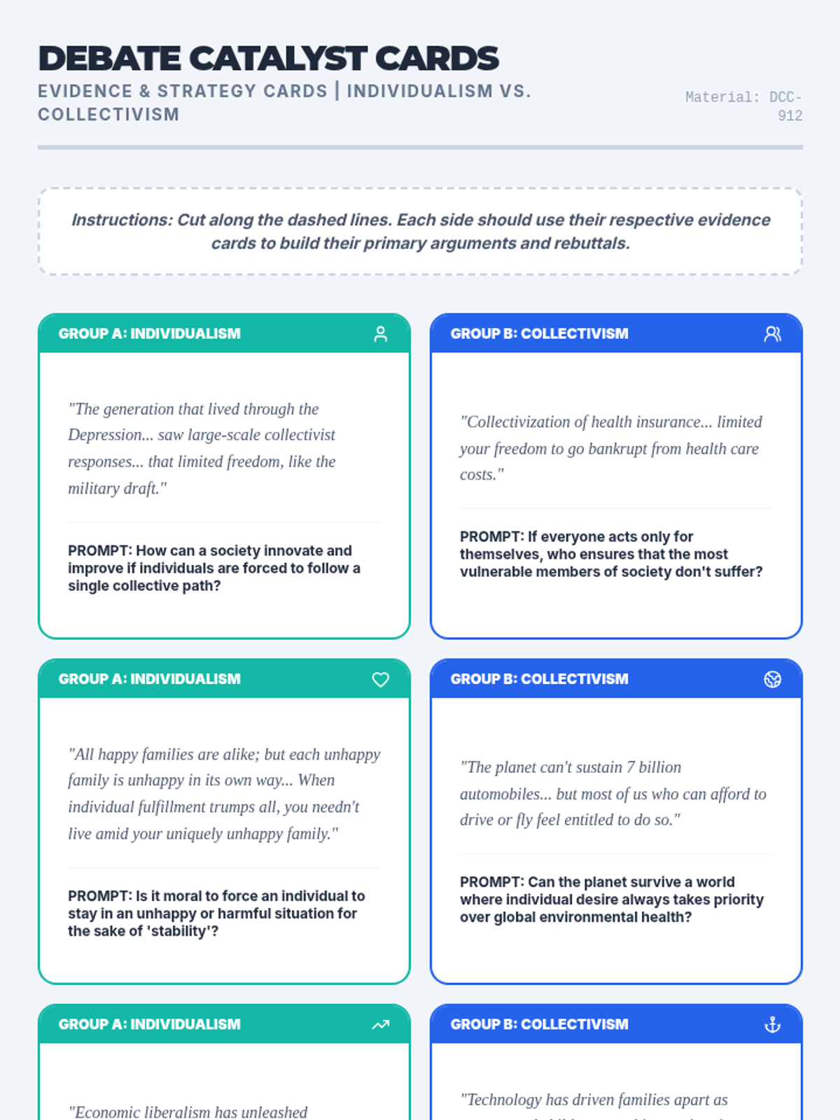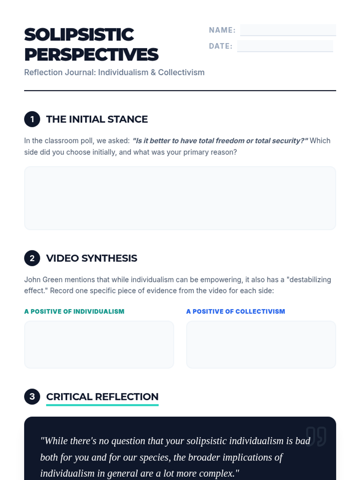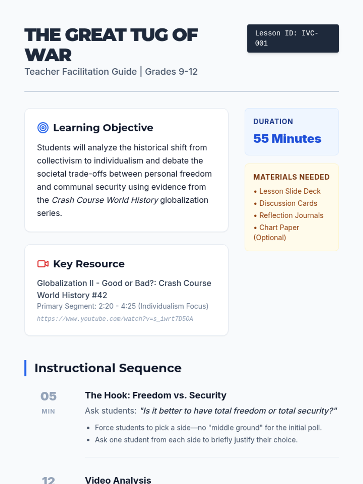 A high school lesson exploring the tension between individualism and collectivism through the lens of globalization, featuring a debate and reflective journaling.