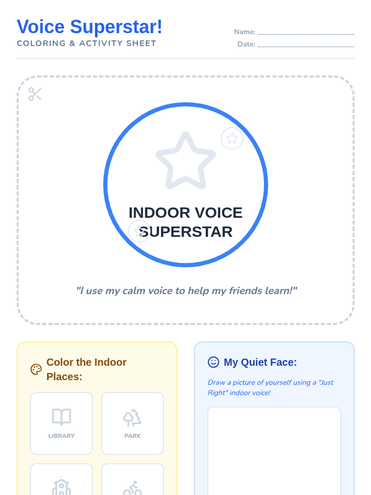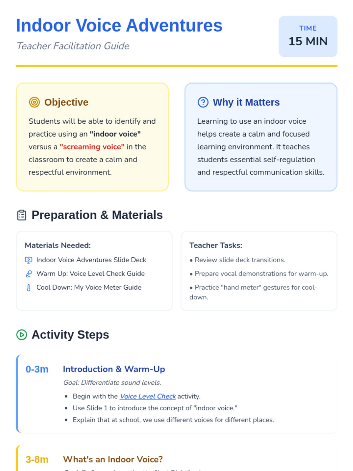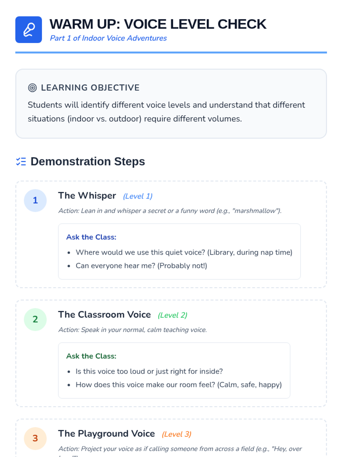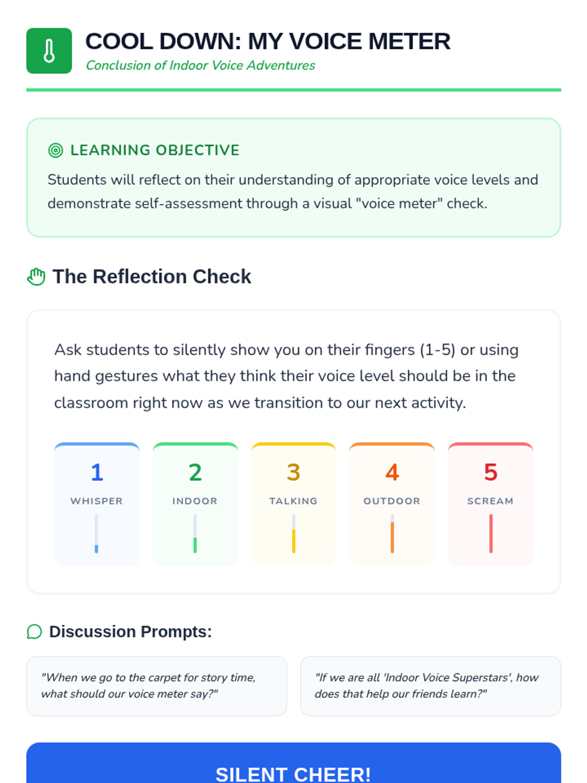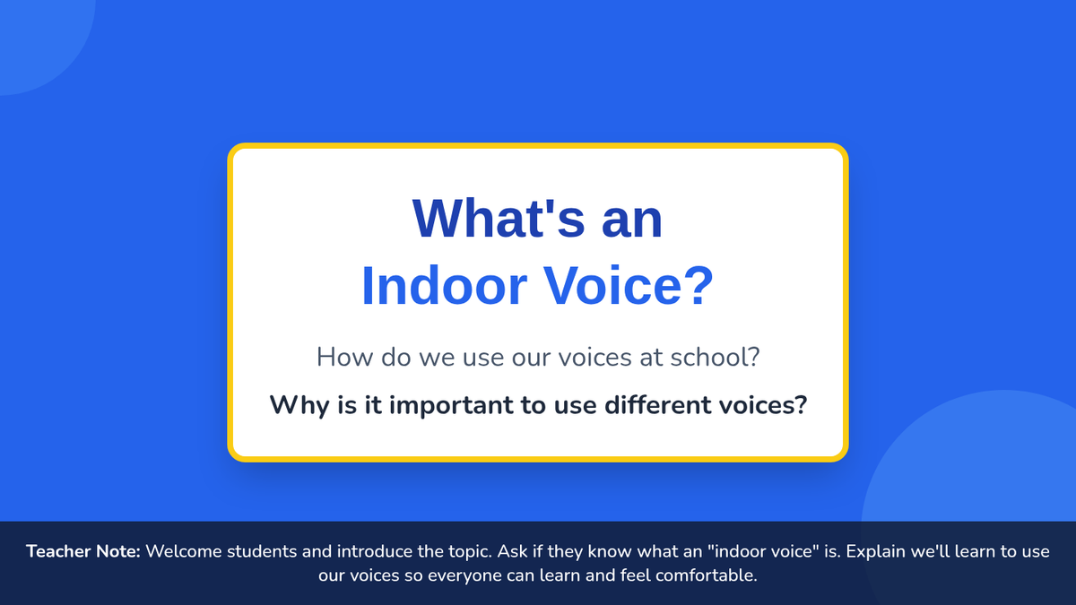 A 15-minute Tier 1 lesson for Kindergarten students to identify, practice, and understand the importance of using indoor voices in the classroom.