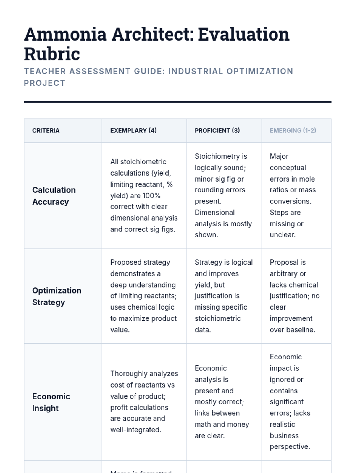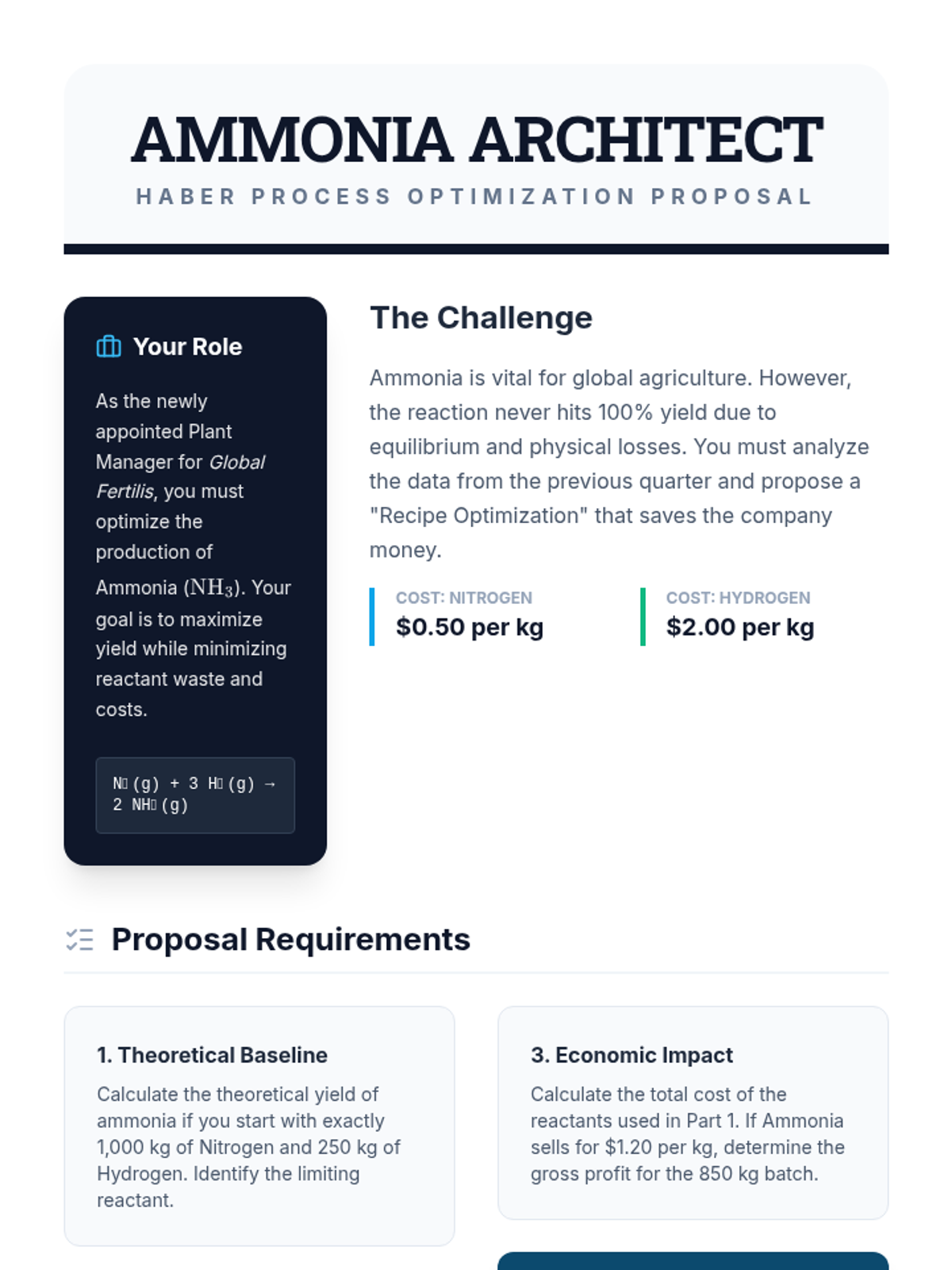 Students apply stoichiometric principles to a real-world industrial scenario, optimizing production efficiency in the Haber Process.