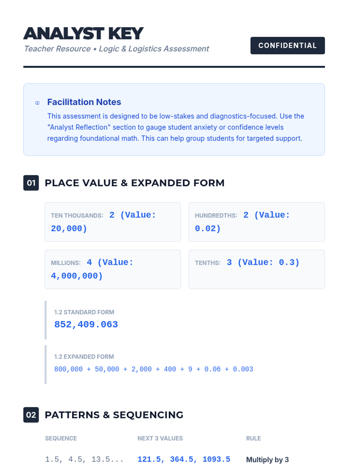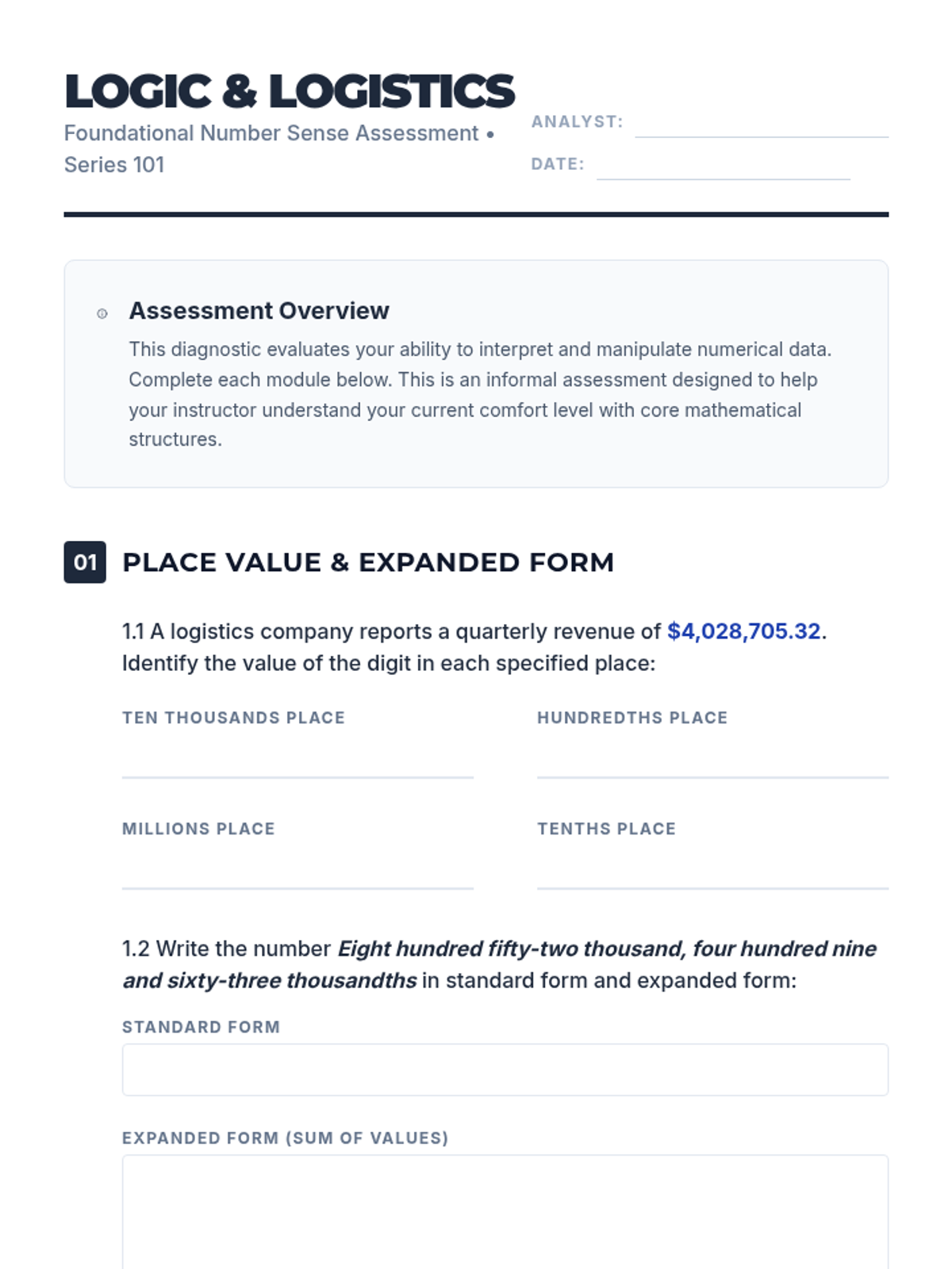 An informal assessment designed for high school students to evaluate foundational number sense skills including place value, sequences, and numerical comparison within a professional 'data-logistics' context.